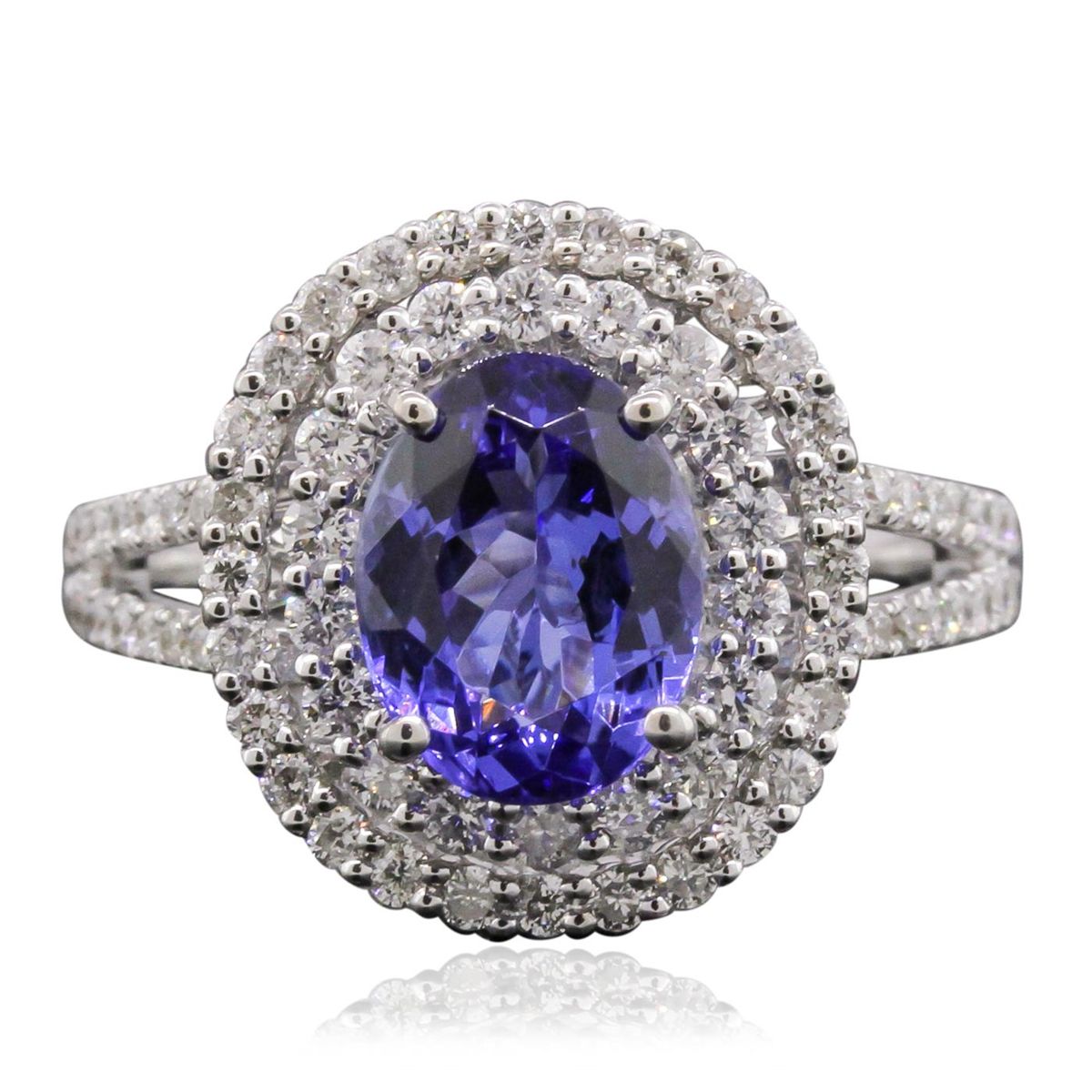 One electronically tested 14KT white gold Ladies combination cast & assembled ring with a bright polish finish. Condition is new. Identified with markings of "14K". Containing: Thirty-Two prong set round brilliant cut diamonds, measuring 1.00 - 1.00 x 0.60mm (depth est.) approximate. Total Weight of 32 Stones = 0.12ct. Clarity: I-1 to I-2. Color: H - I, Cut is Good. Nineteen prong set round brilliant cut diamonds, measuring 1.80 - 1.80 x 1.08mm (depth est.) approximate. Total Weight of 19 Stones = 0.50ct. Clarity: I-1 to I-2. Color: H - I, Cut is Good. Twenty-Eight prong set round brilliant cut diamonds, measuring 1.30 - 1.30 x 0.78mm (depth est.) approximate. Total Weight of 28 Stones = 0.40ct. Clarity: I-1 to I-2. Color: H - I, Cut is Good. One prong set oval modified brilliant cut natural tanzanite, measuring 9.30 x 7.30 x 4.75mm, exact weight 2.47ct., clarity is eye clean, type I, medium, very slightly grayish, violet color, (GIA V 5/3), cut is very good. Colored gemstones are presumed to have been subjected to commonly used color/clarity enhancement processes. Total Weight of Colored Stones 2.47ct. Total Weight of Diamonds 1.01ct. Total Weight of Ring 5.30 grams. GGL Appraised at $6,555.00.