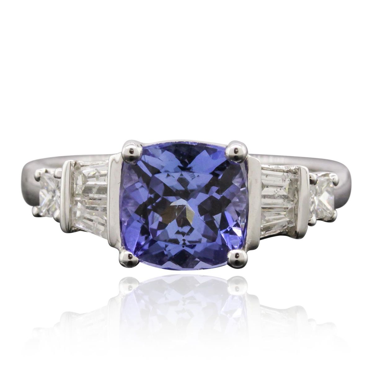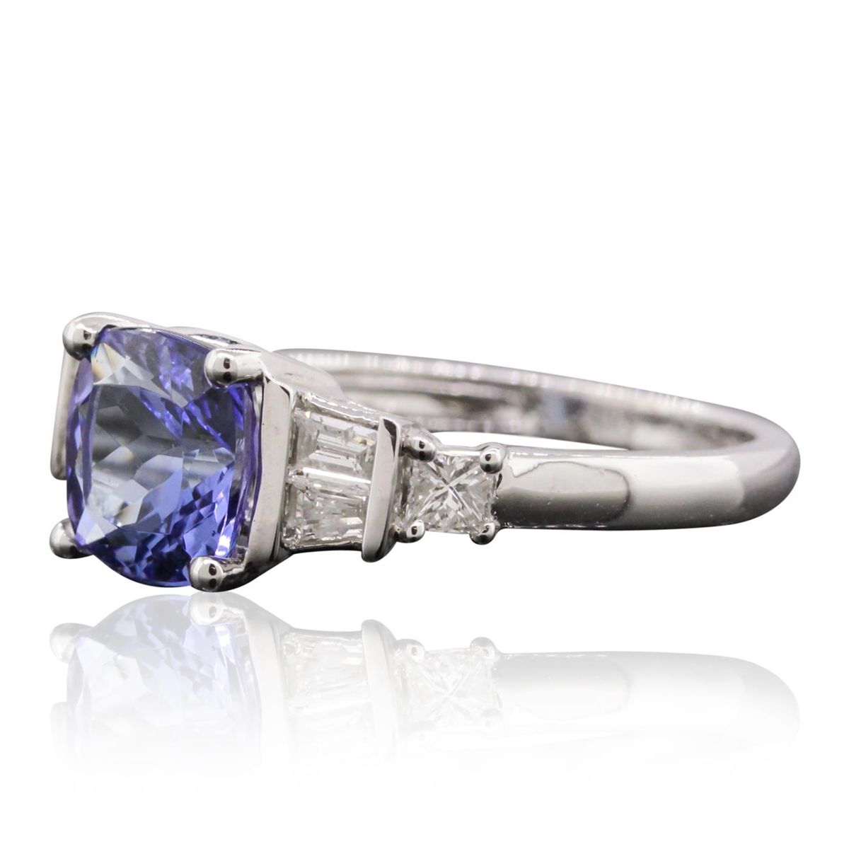 One electronically tested 14KT white gold ladies cast tanzanite and diamond ring with a bright polish finish. Condition is new, good workmanship. The featured tanzanite is supported by diamond set shoulders and completed by a two millimeter wide band. Trademark is CJ. Identified with markings of "14K". Containing: One prong set square cushion mixed cut natural tanzanite, measuring 7.70 x 7.70 x 5.00mm, 6% bulge factor, approximate weight of 2.47ct., clarity is eye clean, type I, medium, very slightly grayish, violetish blue color, (GIA vB 5/3), cut is good. Transmitting light with no distortion, transparent. Graded in the setting. Tanzanite is a very rare gemstone that is only found in the country of Tanzania. Originally discovered in 1967. Tiffany & Company, named the stone Tanzanite. It is found in the Usumburu Mountains that border the Umba Valley of northern Tanzania. Tanzanite occurs in gray, brown, violet, blue, reddish-purple, & green. The gem is interesting because of its exceptional pleochroism. Rotated in different directions a tanzanite will exhibit multiple changes of color. Tanzanite has a low tolerance to ultrasonic cleaning, and should not be cleaned using this method. Four channel set baguette cut diamonds, measuring from 2.70 x 1.90 x 1.33mm (depth est.) to 3.20 x 2.20 x 1.54mm (depth est.) approximate total weight of 4 Stones = 0.35ct. Graded in the setting. Clarity I-1 to I-2. Color F - H. Two prong set princess cut diamonds, measuring 2.60 x 2.50 x 1.88mm (depth est.) approximate total weight of 2 Stones = 0.26ct. Measurements are an average for the pair. Graded in the setting. Clarity VVS-2 to VS-1. Color F - G. Total Weight of Colored Stones 2.47 ct. Total Weight of Diamonds 0.61 ct. Total Weight of Ring 3.50 grams. AIG Appraised at $7,740.00.