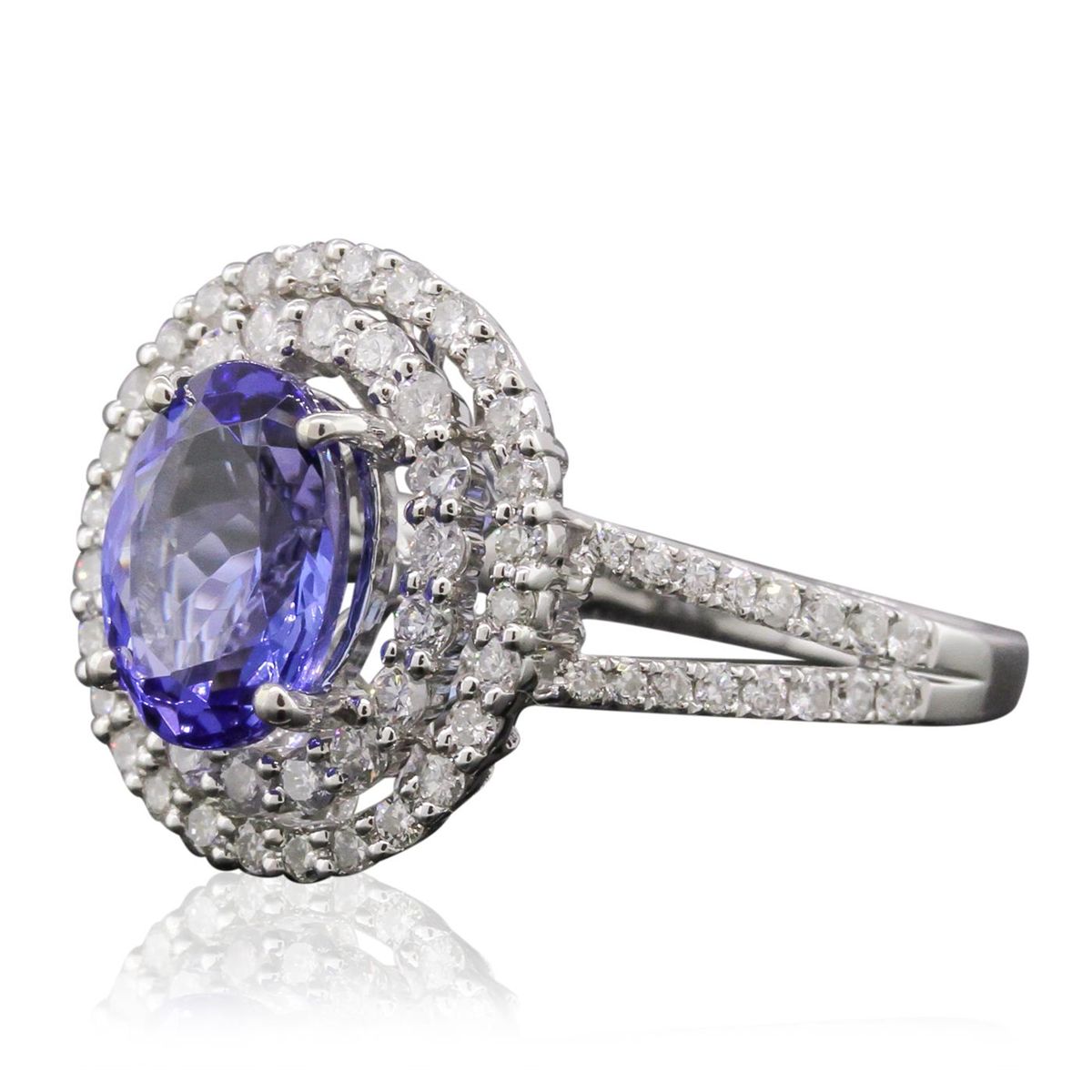 One electronically tested 14KT white gold Ladies combination cast & assembled ring with a bright polish finish. Condition is new. Identified with markings of "14K". Containing: Thirty-Two prong set round brilliant cut diamonds, measuring 1.00 - 1.00 x 0.60mm (depth est.) approximate. Total Weight of 32 Stones = 0.12ct. Clarity: I-1 to I-2. Color: H - I, Cut is Good. Nineteen prong set round brilliant cut diamonds, measuring 1.80 - 1.80 x 1.08mm (depth est.) approximate. Total Weight of 19 Stones = 0.50ct. Clarity: I-1 to I-2. Color: H - I, Cut is Good. Twenty-Eight prong set round brilliant cut diamonds, measuring 1.30 - 1.30 x 0.78mm (depth est.) approximate. Total Weight of 28 Stones = 0.40ct. Clarity: I-1 to I-2. Color: H - I, Cut is Good. One prong set oval modified brilliant cut natural tanzanite, measuring 9.30 x 7.30 x 4.75mm, exact weight 2.47ct., clarity is eye clean, type I, medium, very slightly grayish, violet color, (GIA V 5/3), cut is very good. Colored gemstones are presumed to have been subjected to commonly used color/clarity enhancement processes. Total Weight of Colored Stones 2.47ct. Total Weight of Diamonds 1.01ct. Total Weight of Ring 5.30 grams. GGL Appraised at $6,555.00.