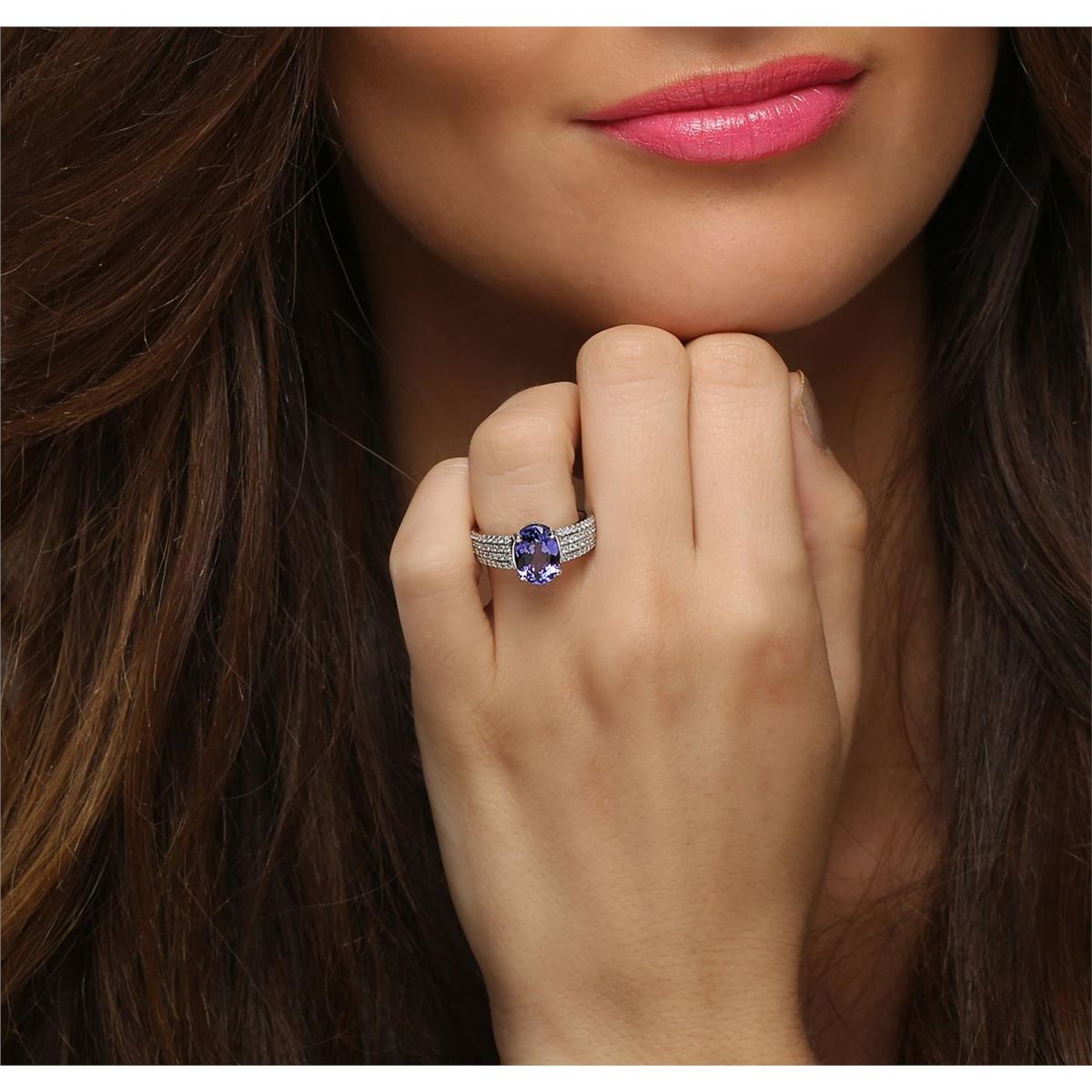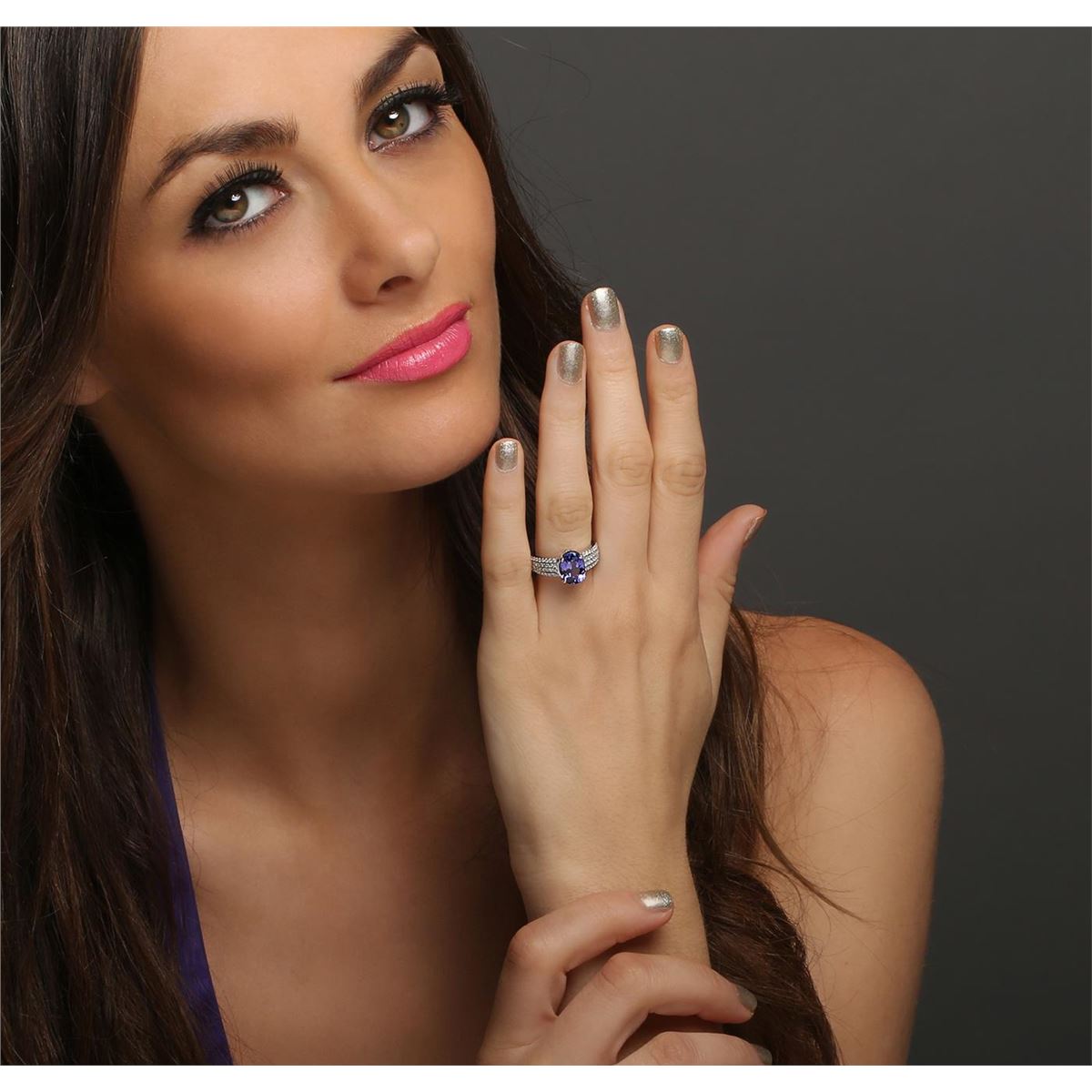 One electronically tested 14KT white gold ladies combination cast & assembled tanzanite and diamond ring with a flat shank with a bright polish finish. Identified with markings of "14K". Condition is new. Containing: One prong set oval modified brilliant cut natural tanzanite, measuring 10.17 x 7.78 x 4.58mm, approximate weight of 2.47ct., clarity is eye clean, type I, medium, moderately strong, violet color, (GIA V 5/4), cut is good. Seventy-Two prong set round brilliant cut diamonds, measuring 1.10 - 1.10 x 0.66mm (depth est.) approximate total weight of 72 Stones = 0.35ct. Clarity: I-1 to I-2. Color: I - J, Cut is Good. Colored gemstones are presumed to have been subjected to commonly used enhancement processes. All diamonds and colored gemstones are graded in the mounting, unless otherwise stated total weight of Colored Stones 2.47ct. Total Weight of Diamonds 0.35ct. Total Weight of Ring 6.10 grams. GGL Appraised at $7,915.00.