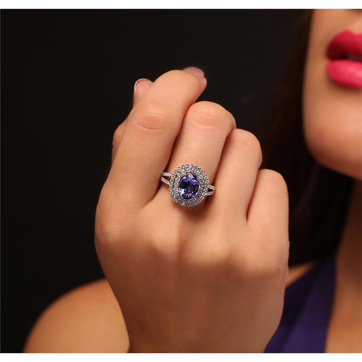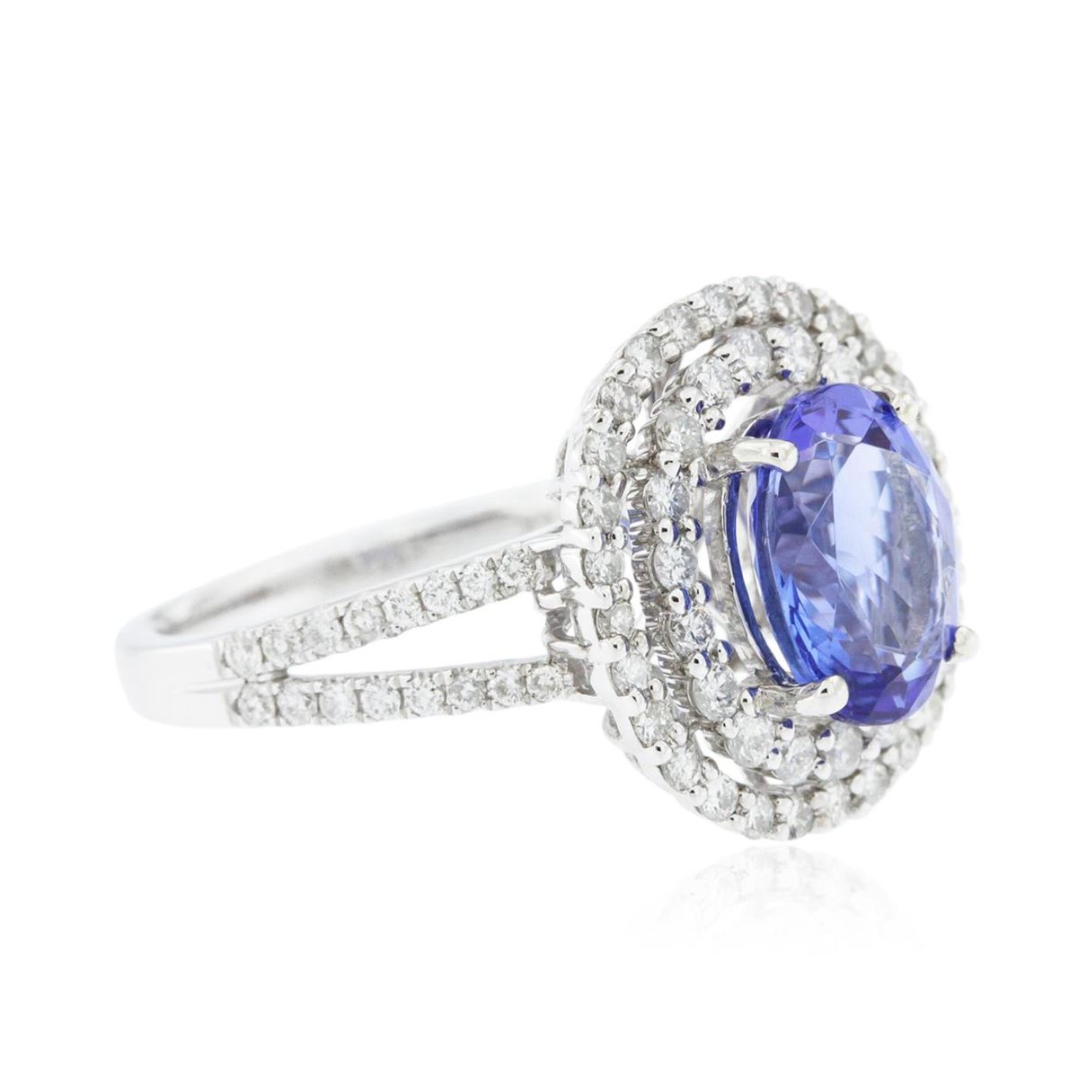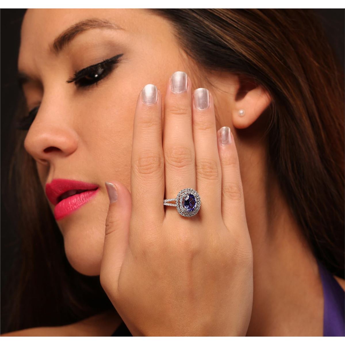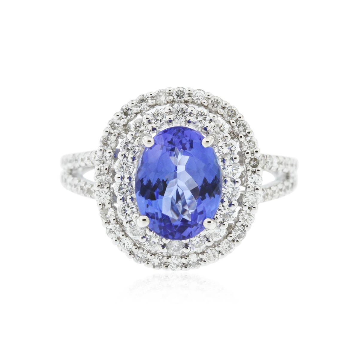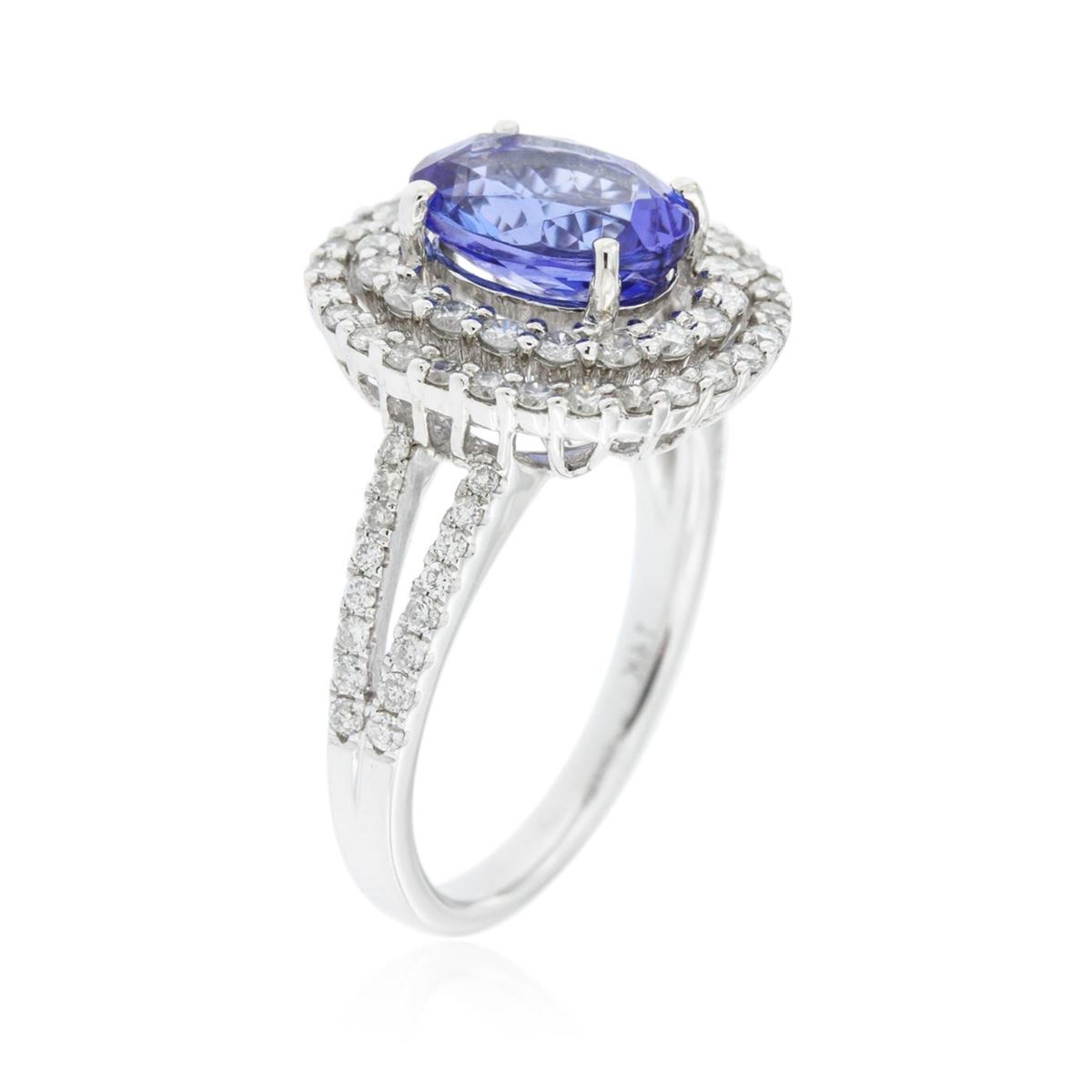 One electronically tested 14KT white gold Ladies combination cast & assembled ring with a bright polish finish. Condition is new. Identified with markings of "14K". Containing: Thirty-Two prong set round brilliant cut diamonds, measuring 1.00 - 1.00 x 0.60mm (depth est.) approximate. Total Weight of 32 Stones = 0.12ct. Clarity: I-1 to I-2. Color: H - I, Cut is Good. Nineteen prong set round brilliant cut diamonds, measuring 1.80 - 1.80 x 1.08mm (depth est.) approximate. Total Weight of 19 Stones = 0.50ct. Clarity: I-1 to I-2. Color: H - I, Cut is Good. Twenty-Eight prong set round brilliant cut diamonds, measuring 1.30 - 1.30 x 0.78mm (depth est.) approximate. Total Weight of 28 Stones = 0.40ct. Clarity: I-1 to I-2. Color: H - I, Cut is Good. One prong set oval modified brilliant cut natural tanzanite, measuring 9.30 x 7.30 x 4.75mm, exact weight 2.47ct., clarity is eye clean, type I, medium, very slightly grayish, violet color, (GIA V 5/3), cut is very good. Colored gemstones are presumed to have been subjected to commonly used color/clarity enhancement processes. Total Weight of Colored Stones 2.47ct. Total Weight of Diamonds 1.01ct. Total Weight of Ring 5.30 grams. GGL Appraised at $6,555.00.