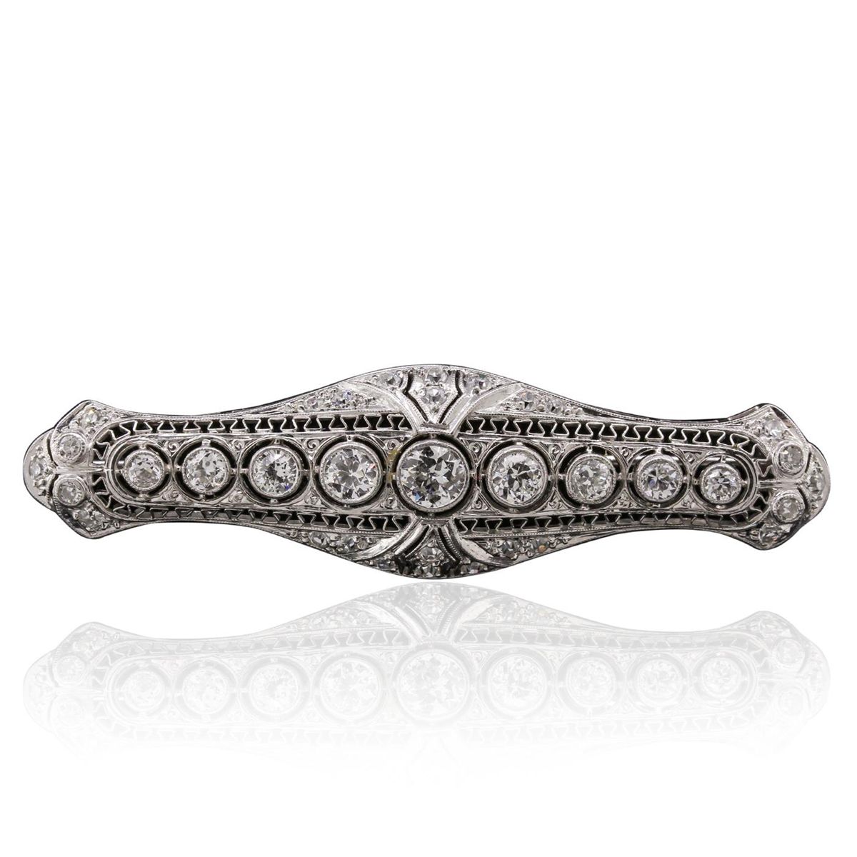 One electronically tested 14KT white gold ladies cast & assembled diamond brooch. Condition is good. The brooch features a symmetrical diamond set lattice, completed by a horizontally placed pin. Bright polish finish with migraine detailing throughout. Area measurements 2.38 x 0.75 inch. Identified with markings of "14K". The brooch is reminiscent of the jewelry designs from the Art Deco Period. The Paris Exposition of Decorative Arts and Modern Manufacturers in 1925 gave the movement its name. The Art Deco Period is characterized with jewelry designs composed of bold geometric designs, & cubism. Containing: One bezel set Old European cut diamond, measuring 4.80 - 4.70 x 2.75mm (depth est.) approximate weight of 0.40ct. Cutting style circa early 20th century. Graded in the setting. Clarity: I-1. Color: I Two bezel set Old European cut diamonds, measuring 3.80 - 3.70 x 2.30mm (depth est.) approximate. Total Weight of 2 Stones = 0.49ct. Color grade is an average for the pair. Cutting style circa early 20th century. Graded in the setting. Clarity: VS-2 to SI-1. Color: I Four bezel set Old European cut diamonds, measuring 3.40 - 3.10 x 2.20mm (depth est.) approximate. Total Weight of 4 Stones = 0.66ct. Cutting style circa late 19th century and early 20th century. Graded in the setting. Clarity: VS-2 to SI-1. Color: H - I Two bezel set Old European cut diamonds, measuring 2.50 - 2.50 x 1.70mm (depth est.) approximate. Total Weight of 2 Stones = 0.15ct. Cutting style circa early 20th century. Graded in the setting. Clarity: VS-2. Color: I Twenty-Four bead and bezel set Old European single cut diamonds, measuring 2.00 - 1.90 x 1.21mm (depth est.) approximate. Total Weight of 24 Stones = 0.77ct. Cutting style circa late 19th century. Graded in the setting. Clarity: VS-2 to SI-1. Color: H - I. Total Weight of Diamonds 2.47ct. Total Weight of Brooch 9.18 grams. AIG Appraised at $8,905.00.