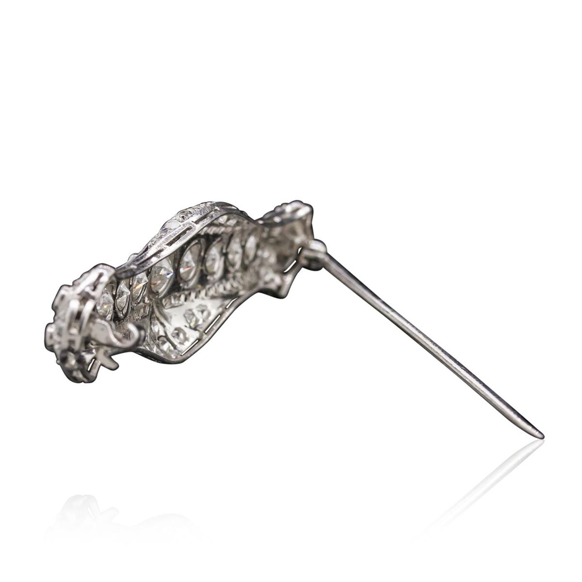 One electronically tested 14KT white gold ladies cast & assembled diamond brooch. Condition is good. The brooch features a symmetrical diamond set lattice, completed by a horizontally placed pin. Bright polish finish with migraine detailing throughout. Area measurements 2.38 x 0.75 inch. Identified with markings of "14K". The brooch is reminiscent of the jewelry designs from the Art Deco Period. The Paris Exposition of Decorative Arts and Modern Manufacturers in 1925 gave the movement its name. The Art Deco Period is characterized with jewelry designs composed of bold geometric designs, & cubism. Containing: One bezel set Old European cut diamond, measuring 4.80 - 4.70 x 2.75mm (depth est.) approximate weight of 0.40ct. Cutting style circa early 20th century. Graded in the setting. Clarity: I-1. Color: I Two bezel set Old European cut diamonds, measuring 3.80 - 3.70 x 2.30mm (depth est.) approximate. Total Weight of 2 Stones = 0.49ct. Color grade is an average for the pair. Cutting style circa early 20th century. Graded in the setting. Clarity: VS-2 to SI-1. Color: I Four bezel set Old European cut diamonds, measuring 3.40 - 3.10 x 2.20mm (depth est.) approximate. Total Weight of 4 Stones = 0.66ct. Cutting style circa late 19th century and early 20th century. Graded in the setting. Clarity: VS-2 to SI-1. Color: H - I Two bezel set Old European cut diamonds, measuring 2.50 - 2.50 x 1.70mm (depth est.) approximate. Total Weight of 2 Stones = 0.15ct. Cutting style circa early 20th century. Graded in the setting. Clarity: VS-2. Color: I Twenty-Four bead and bezel set Old European single cut diamonds, measuring 2.00 - 1.90 x 1.21mm (depth est.) approximate. Total Weight of 24 Stones = 0.77ct. Cutting style circa late 19th century. Graded in the setting. Clarity: VS-2 to SI-1. Color: H - I. Total Weight of Diamonds 2.47ct. Total Weight of Brooch 9.18 grams. AIG Appraised at $8,905.00.