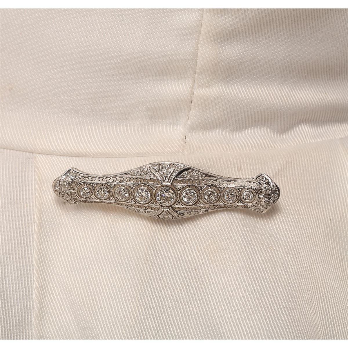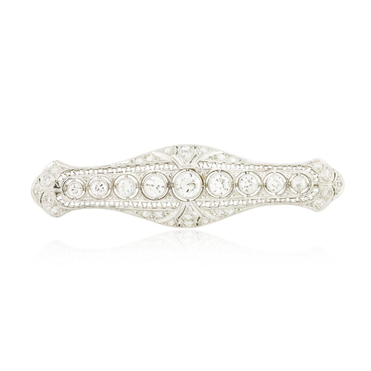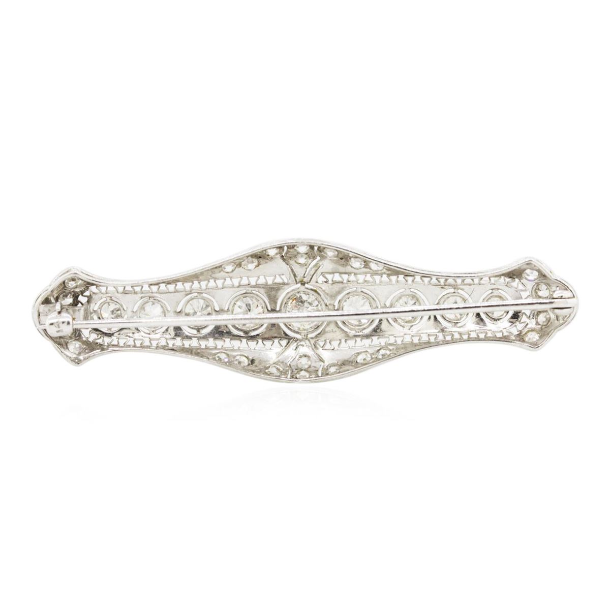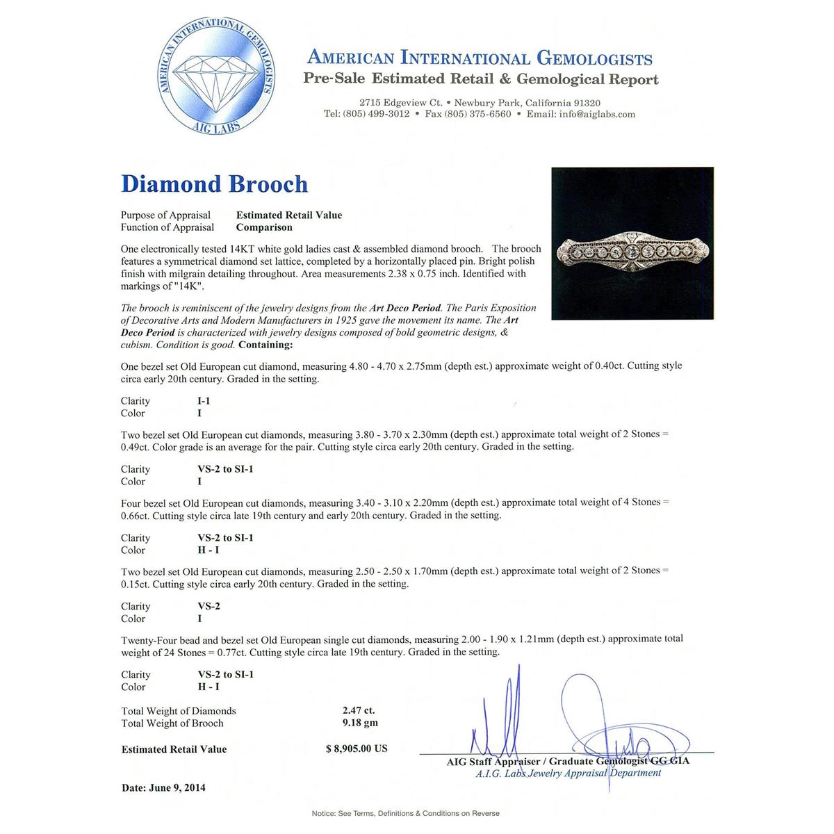 One electronically tested 14KT white gold ladies cast & assembled diamond brooch. Condition is good. The brooch features a symmetrical diamond set lattice, completed by a horizontally placed pin. Bright polish finish with migraine detailing throughout. Area measurements 2.38 x 0.75 inch. Identified with markings of "14K". The brooch is reminiscent of the jewelry designs from the Art Deco Period. The Paris Exposition of Decorative Arts and Modern Manufacturers in 1925 gave the movement its name. The Art Deco Period is characterized with jewelry designs composed of bold geometric designs, & cubism. Containing: One bezel set Old European cut diamond, measuring 4.80 - 4.70 x 2.75mm (depth est.) approximate weight of 0.40ct. Cutting style circa early 20th century. Graded in the setting. Clarity: I-1. Color: I Two bezel set Old European cut diamonds, measuring 3.80 - 3.70 x 2.30mm (depth est.) approximate. Total Weight of 2 Stones = 0.49ct. Color grade is an average for the pair. Cutting style circa early 20th century. Graded in the setting. Clarity: VS-2 to SI-1. Color: I Four bezel set Old European cut diamonds, measuring 3.40 - 3.10 x 2.20mm (depth est.) approximate. Total Weight of 4 Stones = 0.66ct. Cutting style circa late 19th century and early 20th century. Graded in the setting. Clarity: VS-2 to SI-1. Color: H - I Two bezel set Old European cut diamonds, measuring 2.50 - 2.50 x 1.70mm (depth est.) approximate. Total Weight of 2 Stones = 0.15ct. Cutting style circa early 20th century. Graded in the setting. Clarity: VS-2. Color: I Twenty-Four bead and bezel set Old European single cut diamonds, measuring 2.00 - 1.90 x 1.21mm (depth est.) approximate. Total Weight of 24 Stones = 0.77ct. Cutting style circa late 19th century. Graded in the setting. Clarity: VS-2 to SI-1. Color: H - I. Total Weight of Diamonds 2.47ct. Total Weight of Brooch 9.18 grams. AIG Appraised at $8,905.00.