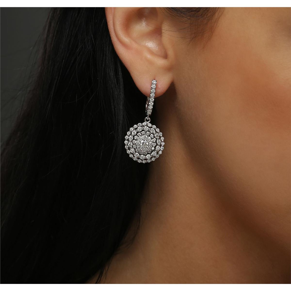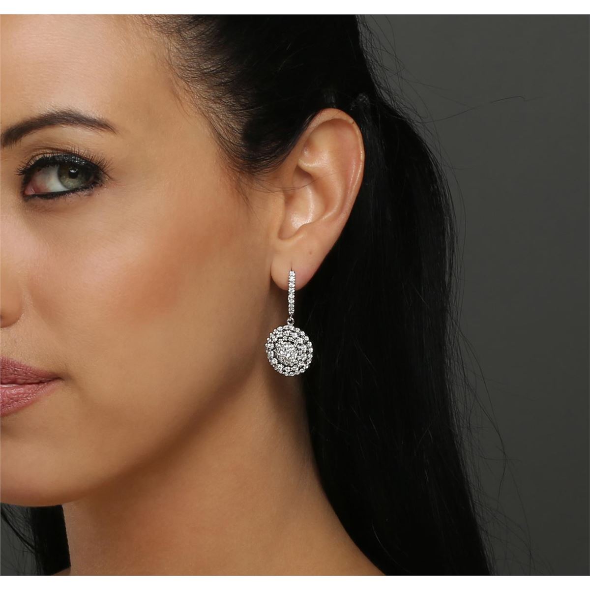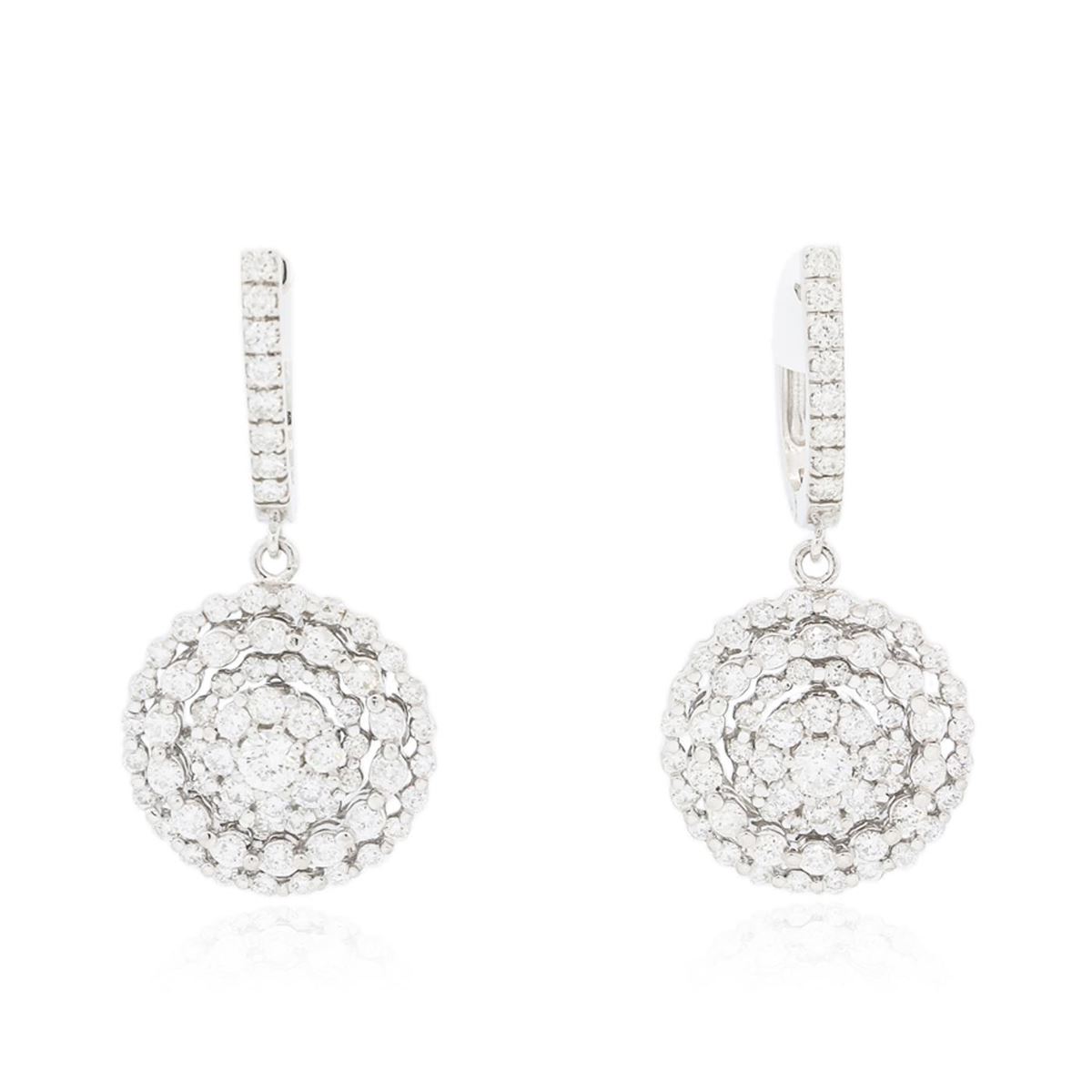 One pair electronically tested 14KT white gold ladies combination cast & assembled dangle earrings with hinged clip backs with a bright polish finish. Identified with markings of "14K". Condition is new. Containing: Two prong set round brilliant cut diamonds, measuring 3.50 - 3.50 x 2.10mm (depth est.) approximate total weight of 2 Stones = 0.31ct. Clarity: SI-1 to SI-2. Color: G - H, Cut is Good. One Hundred Thirty-Two prong set round brilliant cut diamonds, measuring 2.00 - 1.30 x 0.99mm (depth est.) approximate total weight of 132 Stones = 2.17ct. Clarity: SI-1 to SI-2. Color: G - H, Cut is Good. All diamonds are graded in the mounting, unless otherwise stated. Total Weight of Diamonds 2.48ct. Total Weight of Earrings 11.60 grams. GGL Appraised at $12,915.00.