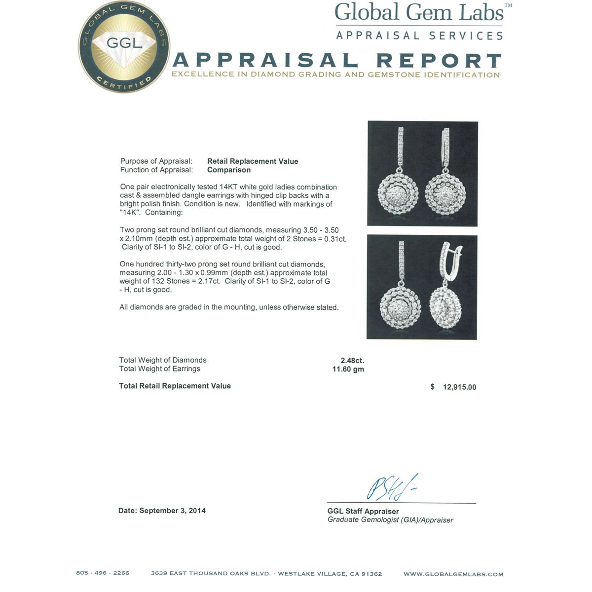 One pair electronically tested 14KT white gold ladies combination cast & assembled dangle earrings with hinged clip backs with a bright polish finish. Identified with markings of "14K". Condition is new. Containing: Two prong set round brilliant cut diamonds, measuring 3.50 - 3.50 x 2.10mm (depth est.) approximate total weight of 2 Stones = 0.31ct. Clarity: SI-1 to SI-2. Color: G - H, Cut is Good. One Hundred Thirty-Two prong set round brilliant cut diamonds, measuring 2.00 - 1.30 x 0.99mm (depth est.) approximate total weight of 132 Stones = 2.17ct. Clarity: SI-1 to SI-2. Color: G - H, Cut is Good. All diamonds are graded in the mounting, unless otherwise stated. Total Weight of Diamonds 2.48ct. Total Weight of Earrings 11.60 grams. GGL Appraised at $12,915.00.
