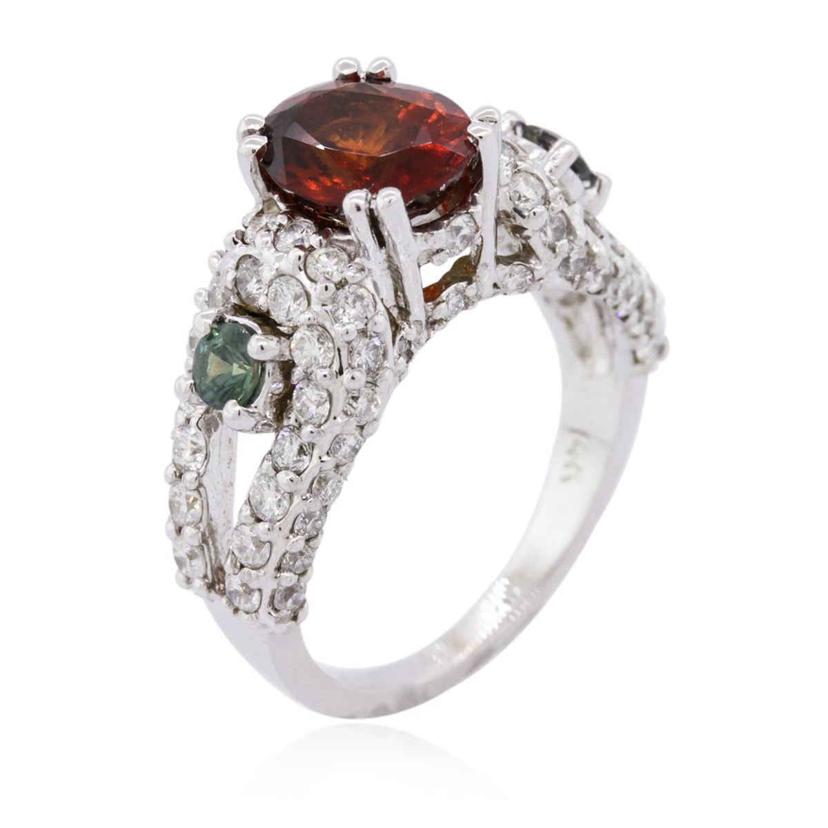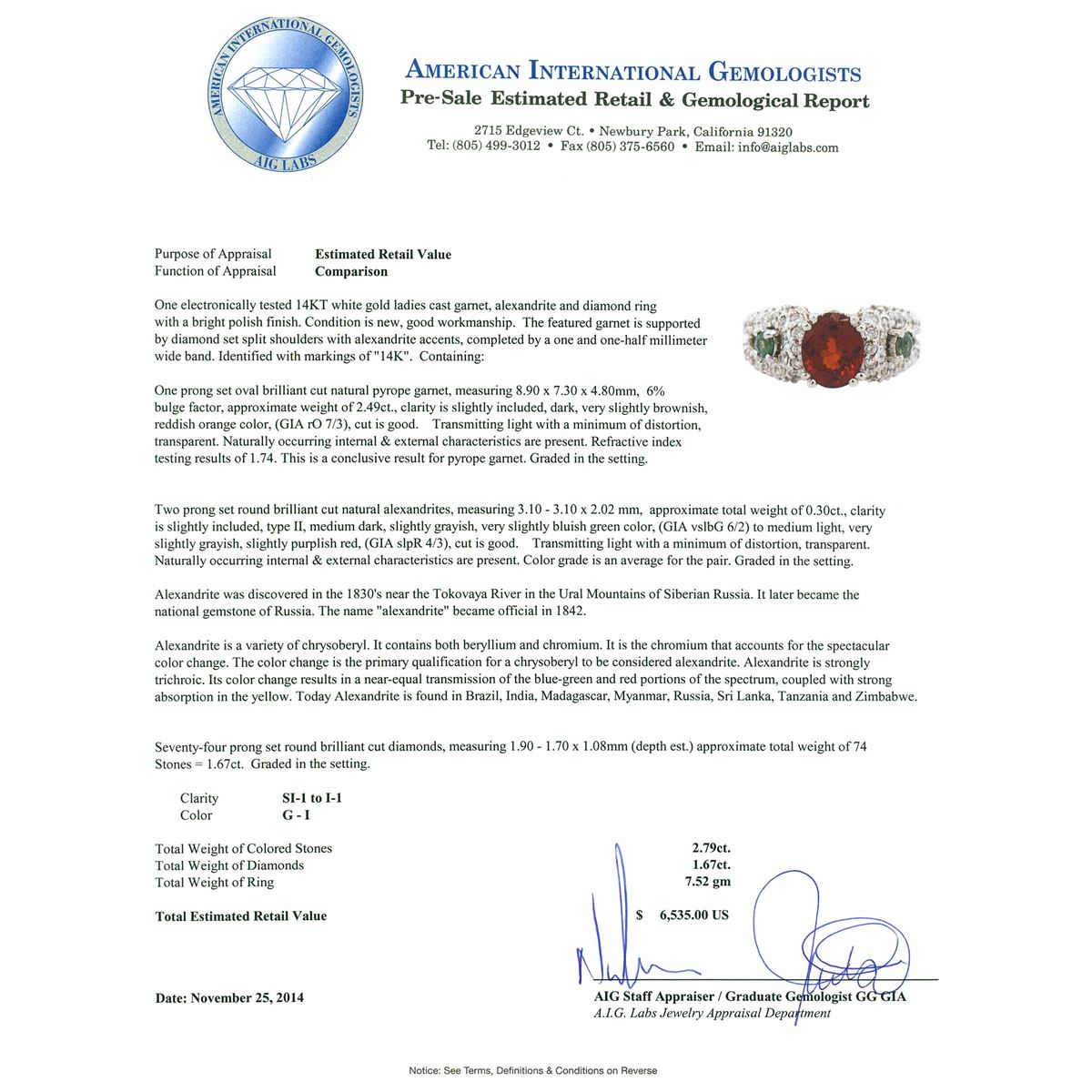One electronically tested 14KT white gold ladies cast garnet, alexandrite and diamond ring with a bright polish finish. The featured garnet is supported by diamond set split shoulders with alexandrite accents, completed by a one and one-half millimeter wide band. Identified with markings of "14K". Condition is new, good workmanship. Containing: One prong set oval brilliant cut natural pyrope garnet, measuring 8.90 x 7.30 x 4.80mm, 6%. bulge factor, approximate weight of 2.49ct., clarity is slightly included, dark, very slightly brownish, reddish orange color, (GIA rO 7/3), cut is good. Transmitting light with a minimum of distortion, transparent. Naturally occurring internal & external characteristics are present. Refractive index testing results of 1.74. This is a conclusive result for pyrope garnet. Graded in the setting. Two prong set round brilliant cut natural alexandrites, measuring 3.10 - 3.10 x 2.02 mm, approximate total weight of 0.30ct., clarity is slightly included, type II, medium dark, slightly grayish, very slightly bluish green color, (GIA vslbG 6/2) to medium light, very slightly grayish, slightly purplish red, (GIA slpR 4/3), cut is good. Transmitting light with a minimum of distortion, transparent. Naturally occurring internal & external characteristics are present. Color grade is an average for the pair. Graded in the setting. Alexandrite was discovered in the 1830's near the Tokovaya River in the Ural Mountains of Siberian Russia. It later became the national gemstone of Russia. The name "alexandrite" became official in 1842.Alexandrite is a variety of chrysoberyl. It contains both beryllium and chromium. It is the chromium that accounts for the spectacular color change. The color change is the primary qualification for a chrysoberyl to be considered alexandrite. Alexandrite is strongly trichroic. Its color change results in a near-equal transmission of the blue-green and red portions of the spectrum, coupled with strong absorption in the yellow. Today Alexandrite is found in Brazil, India, Madagascar, Myanmar, Russia, Sri Lanka, Tanzania and Zimbabwe. Seventy-Four prong set round brilliant cut diamonds, measuring 1.90 - 1.70 x 1.08mm (depth est.) approximate total weight of 74 Stones = 1.67ct. Graded in the setting. Clarity: SI-1 to I-1. Color: G - I. Total Weight of Colored Stones 2.79ct. Total Weight of Diamonds 1.67ct. Total Weight of Ring 7.52 grams. AIG Appraised at $6,535.00.