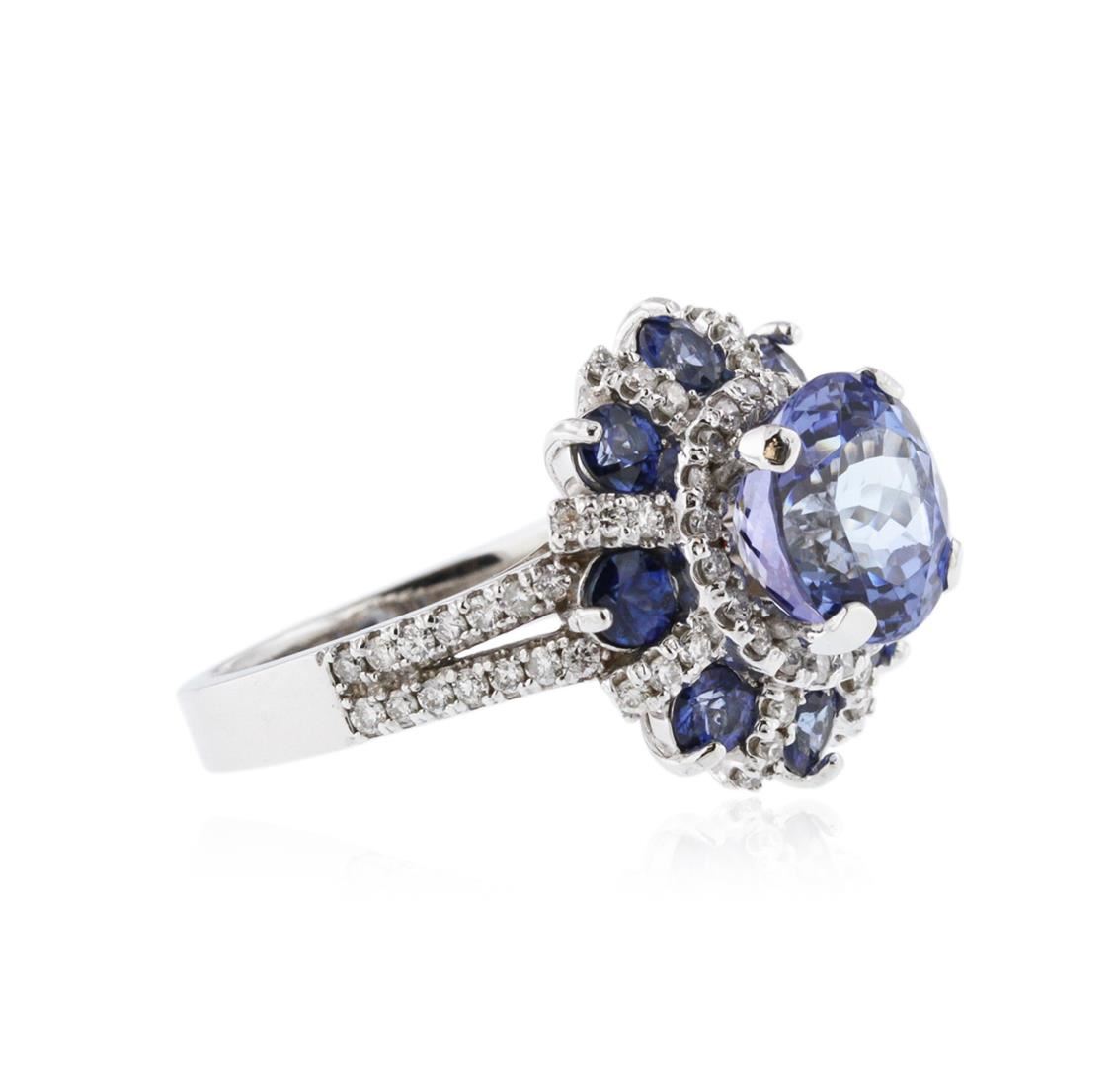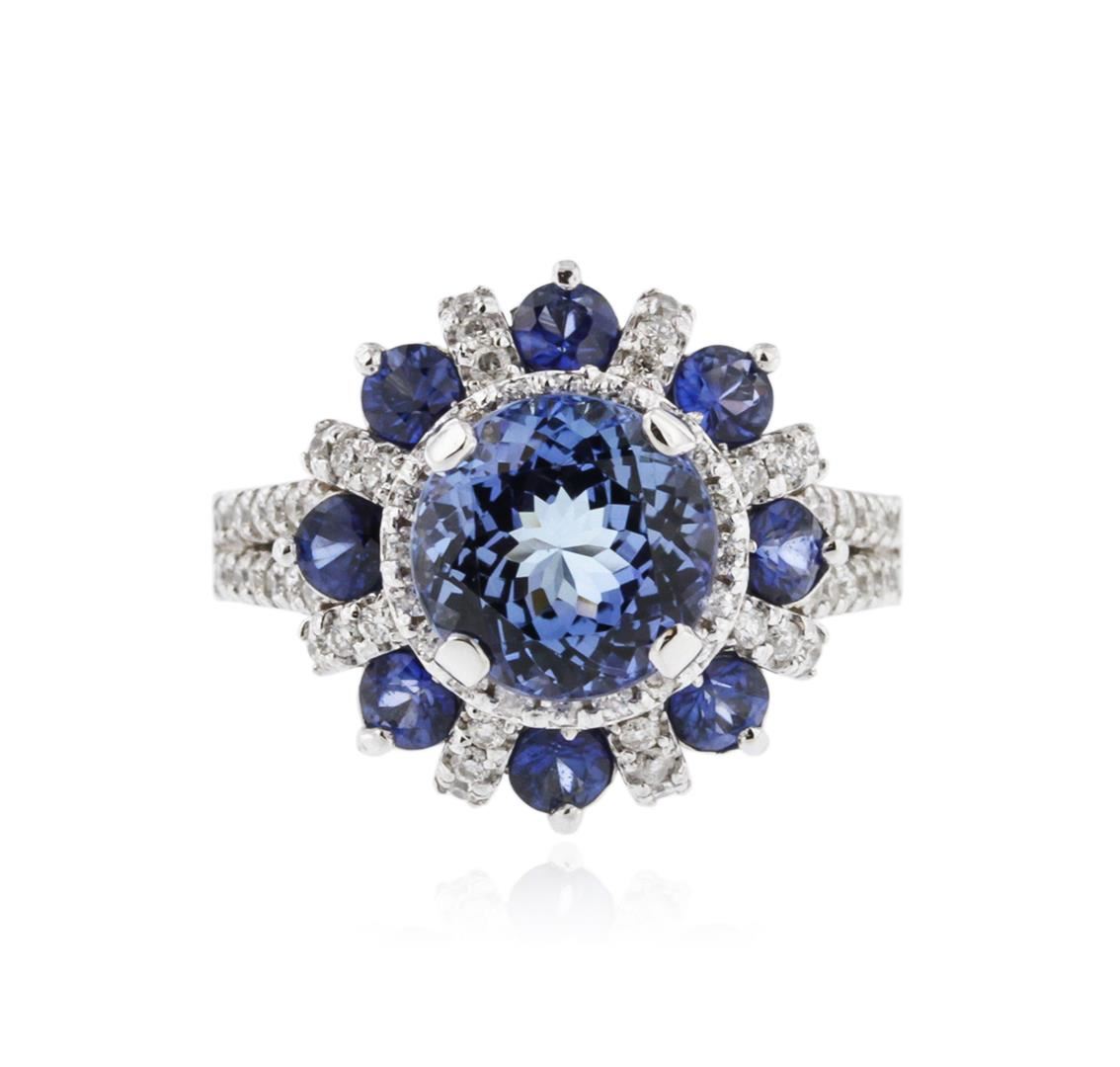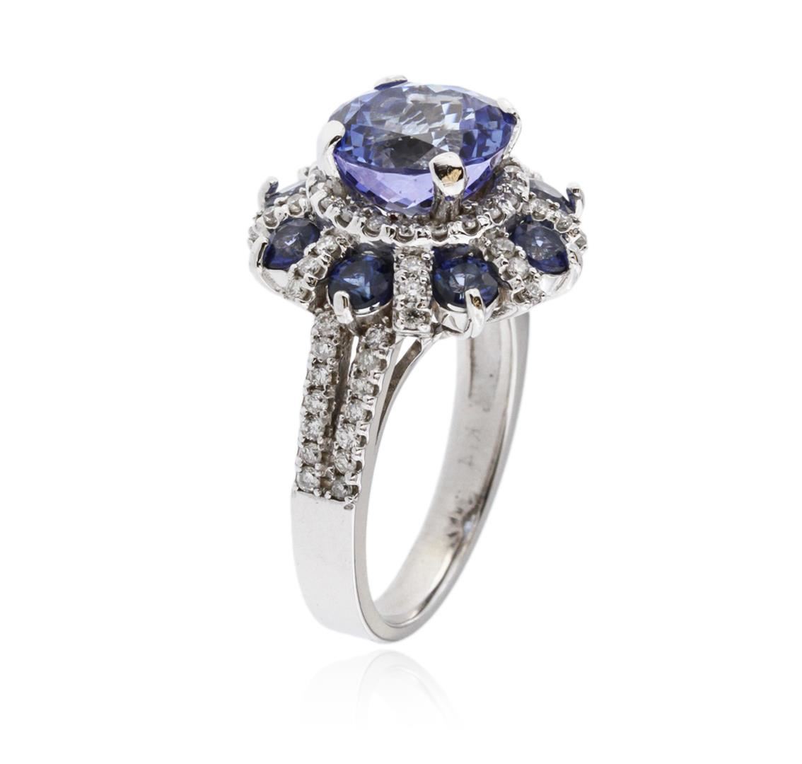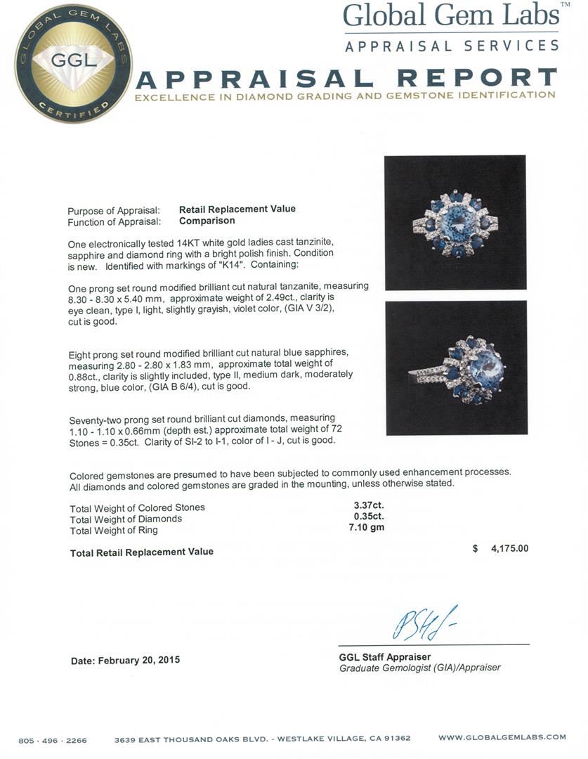 One electronically tested 14KT white gold ladies cast tanzanite, sapphire and diamond ring with a bright polish finish. Identified with markings of "K14". Condition is new. Containing: One prong set round modified brilliant cut natural tanzanite, measuring 8.30 - 8.30 x 5.40 mm, approximate weight of 2.49ct., clarity is eye clean, type I, light, slightly grayish, violet color, (GIA V 3/2), cut is good. Eight prong set round modified brilliant cut natural blue sapphires, measuring 2.80 - 2.80 x 1.83 mm, approximate total weight of 0.88ct., clarity is slightly included, type II, medium dark, moderately strong, blue color, (GIA B 6/4), cut is good. Seventy-Two prong set round brilliant cut diamonds, measuring 1.10 - 1.10 x 0.66mm (depth est.) approximate total weight of 72 Stones = 0.35ct. Clarity: SI-2 to I-1. Color: I - J, Cut is Good. Colored gemstones are presumed to have been subjected to commonly used enhancement processes. All diamonds and colored gemstones are graded in the mounting, unless otherwise stated. Total Weight of Colored Stones 3.37ct. Total Weight of Diamonds 0.35ct. Total Weight of Ring 7.10 grams. GGL Appraised at $4,175.00.