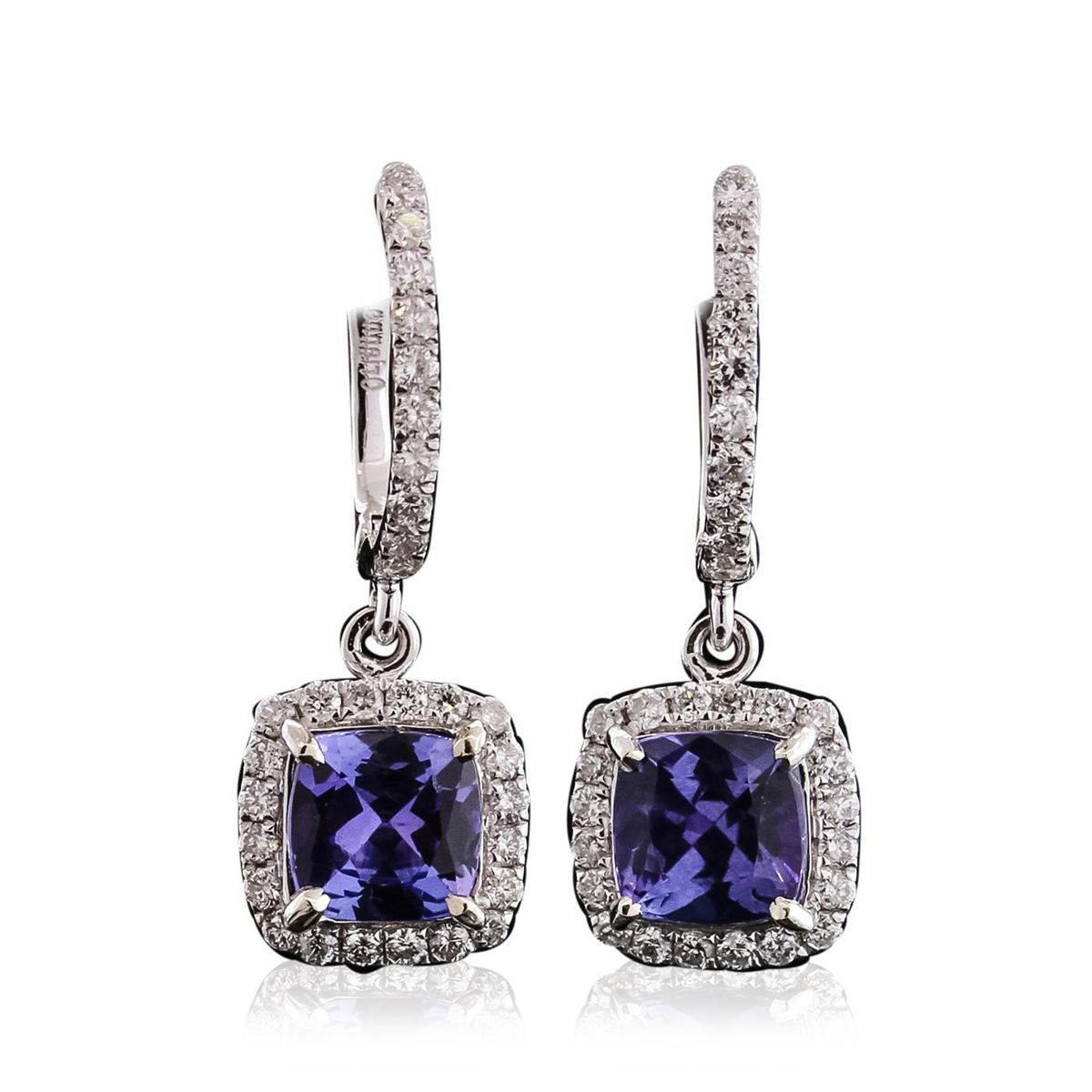 One pair electronically tested 14KT white gold ladies cast & assembled tanzanite & diamond dangle earrings with hinged, snap locking posts. Each earring features a tanzanite set within an inner white gold basket, and an outer diamond bezel, supported by a ribbon of diamonds. Trademark is Orianne. Identified with markings of "14K". Condition is good. Containing: Two prong set square cushion mixed cut natural tanzanites, measuring 6.40 x 6.30 x 3.94mm, approximate total weight of 2.50ct., clarity is eye clean, type I, dark, very slightly grayish, violetish blue color, (GIA vB 7/3), cut is good. Measurements are an average for the pair. Transmitting light with no distortion, transparent. Graded in the setting. Tanzanite is a very rare gemstone that is only found in the country of Tanzania. Originally discovered in 1967. Tiffany & Company, named the stone Tanzanite. It is found in the Usumburu Mountains that border the Umba Valley of northern Tanzania. Tanzanite occurs in gray, brown, violet, blue, reddish-purple, & green. The gem is interesting because of its exceptional pleochroism. Rotated in different directions a tanzanite will exhibit multiple changes of color. Tanzanite has a low tolerance to ultrasonic cleaning, and should not be cleaned using this method. Sixty prong set round brilliant cut diamonds, measuring 1.55 - 1.35 x 0.87mm (depth est.) approximate total weight of 60 Stones = 0.64ct. Graded in the setting. Clarity: I-1 to I-2. Color: H - I. Total Weight of Colored Stones 2.50ct. Total Weight of Diamonds 0.64ct. Total Weight of Dangle Earrings 4.89gm. AIG Appraised at $7,050.00.
