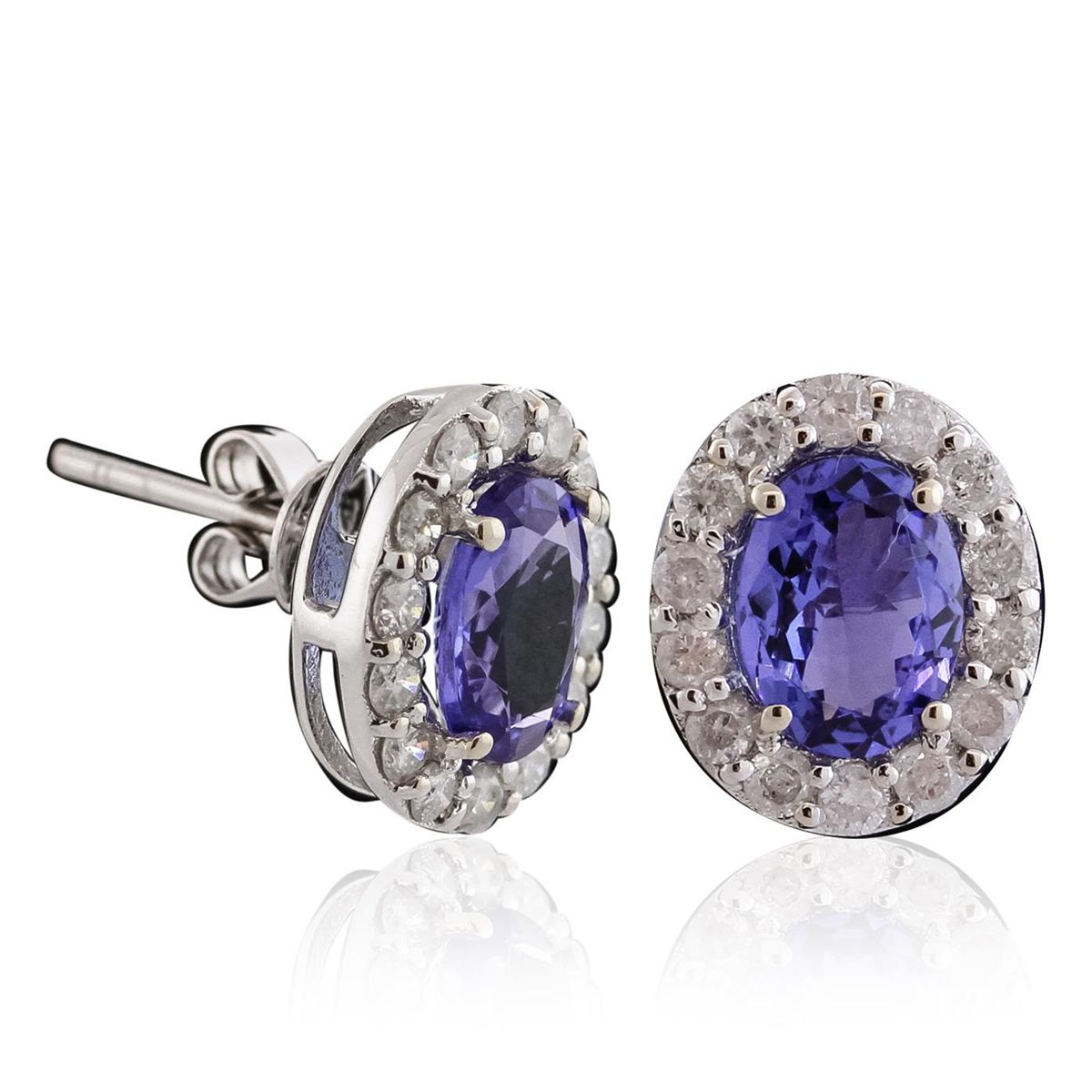 One pair electronically tested 14KT white gold ladies cast & assembled tanzanite & diamond earrings with standard backs. Each earing features a tanzanite set within a diamond bezel. Trademark is Orianne. Identified with markings of "14K". Condition is good. Containing: Two prong set oval mixed cut natural tanzanites, measuring 8.00 x 6.00 x 3.80mm, approximate total weight of 2.50ct., clarity is eye clean, type I, medium dark, very slightly grayish, bluish violet color, (GIA bV 6/3), cut is good. Measurements are an average for the pair. Transmitting light with no distortion, transparent. Graded in the setting. Tanzanite is a very rare gemstone that is only found in the country of Tanzania. Originally discovered in 1967. Tiffany & Company, named the stone Tanzanite. It is found in the Usumburu Mountains that border the Umba Valley of northern Tanzania. Tanzanite occurs in gray, brown, violet, blue, reddish-purple, & green. The gem is interesting because of its exceptional pleochroism. Rotated in different directions a tanzanite will exhibit multiple changes of color. Tanzanite has a low tolerance to ultrasonic cleaning, and should not be cleaned using this method. Twenty-Eight prong set round brilliant cut diamonds, measuring 2.00 - 1.90 x 1.17mm (depth est.) approximate total weight of 28 Stones = 0.76ct. Graded in the setting. Clarity: I-2 to I-3. Color: H - I. Total Weight of Colored Stones 2.50ct. Total Weight of Diamonds 0.76ct. Total Weight of Earrings 3.49gm. AIG Appraised at $6,330.00.