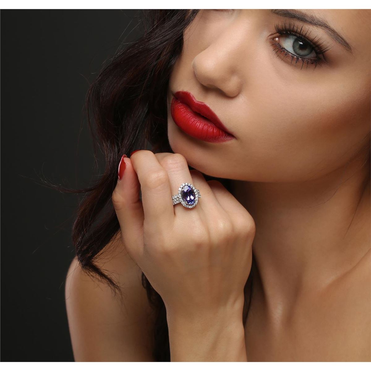 One electronically tested 14KT white gold ladies combination cast & assembled tanzanite and diamond ring with a flat shank with a bright polish finish. Identified with markings of "14K". Condition is new. Containing: One prong set oval modified brilliant cut natural tanzanite, measuring 11.90 x 6.84 x 4.27mm, approximate weight of 2.51ct., clarity is eye clean, type I, medium light, very slightly grayish, violet color, (GIA V 4/3), cut is good. Sixty-Four prong set round brilliant cut diamonds, measuring 1.80 - 1.50 x 0.99mm (depth est.) approximate total weight of 64 Stones = 1.05ct. Clarity: I-1 to I-2. Color: I - J, Cut is Good. Colored gemstones are presumed to have been subjected to commonly used enhancement processes. All diamonds and colored gemstones are graded in the mounting, unless otherwise stated. Total Weight of Colored Stones 2.51ct. Total Weight of Diamonds 1.05ct. Total Weight of Ring 6.20 grams. GGL Appraised at $7,225.00.