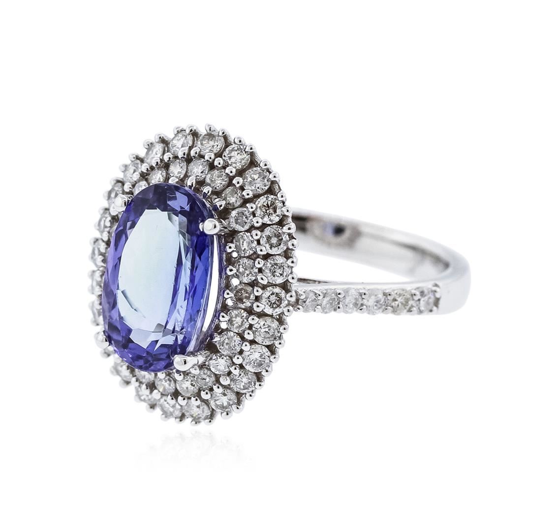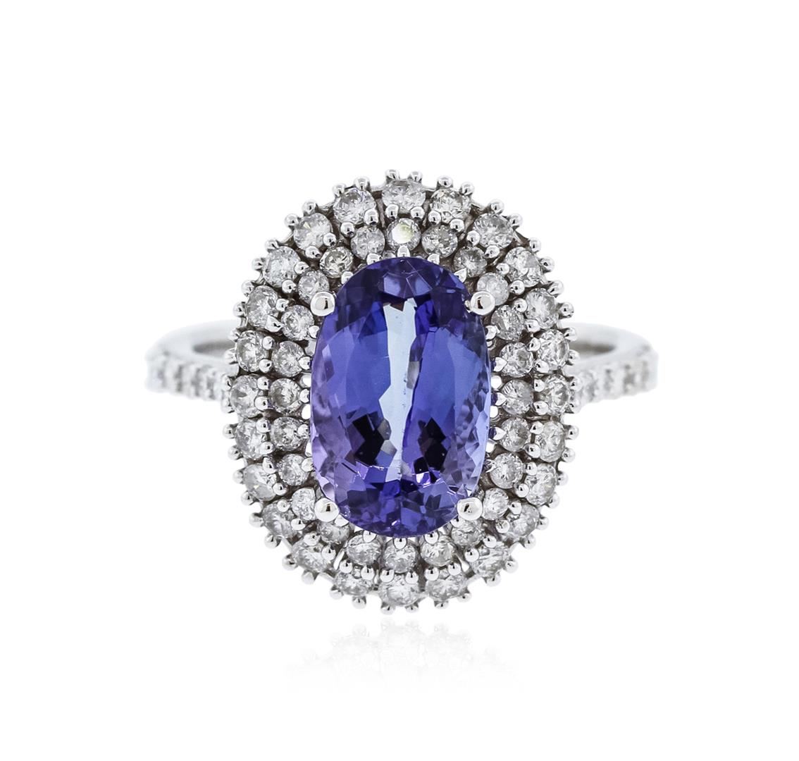One electronically tested 14KT white gold ladies cast tanzanite and diamond ring with a cathedral shank with a bright polish finish. Trademark is Orianne. Identified with markings of "14K". Condition is new. Containing: One prong set oval modified brilliant cut natural tanzanite, measuring 10.96 x 6.99 x 4.65mm, approximate weight of 2.51ct., clarity is eye clean, type I, medium light, very slightly grayish, violet color, (GIA V 4/3), cut is good. Sixty prong set round brilliant cut diamonds, measuring 1.50 - 1.50 x 0.90mm (depth est.) approximate total weight of 60 Stones = 0.74ct. Clarity: I-1 to I-2. Color: I - J. All diamonds and colored gemstones are graded in the mounting, unless otherwise stated. Colored gemstones are presumed to have been subjected to commonly used enhancement processes.. Total Weight of Colored Stones 2.51ct. Total Weight of Diamonds 0.74ct. Total Weight of Ring 4.40 grams. GGL Appraised at $4,205.00.