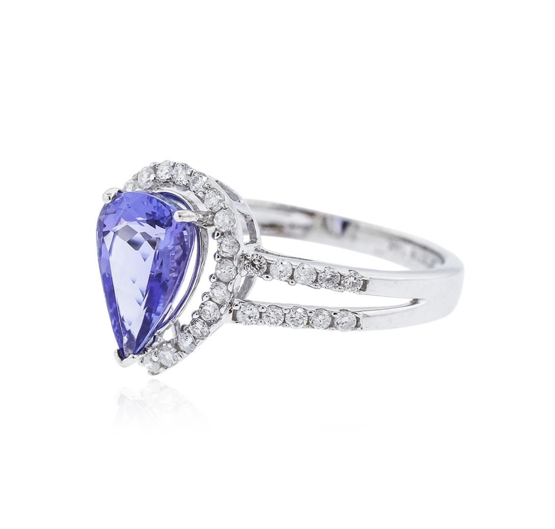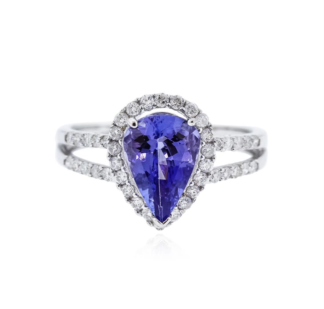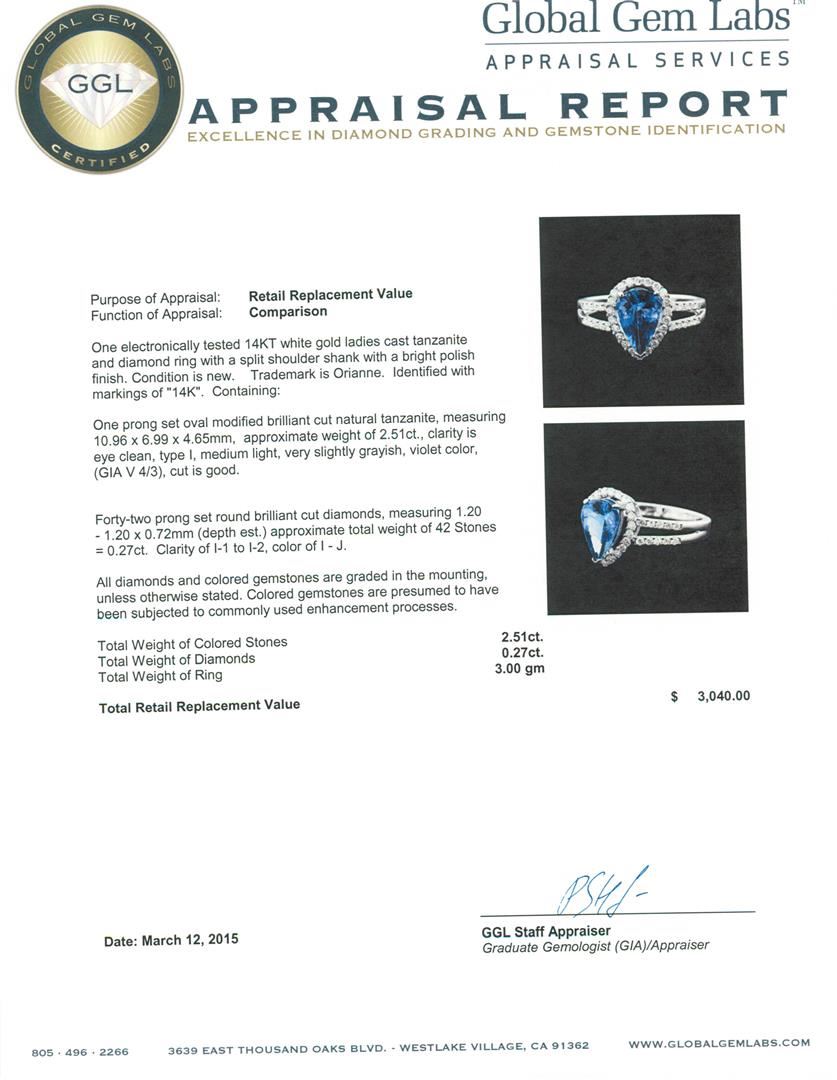 One electronically tested 14KT white gold ladies cast tanzanite and diamond ring with a split shoulder shank with a bright polish finish. Trademark is Orianne. Identified with markings of "14K". Condition is new. Containing: One prong set oval modified brilliant cut natural tanzanite, measuring 10.96 x 6.99 x 4.65mm, approximate weight of 2.51ct., clarity is eye clean, type I, medium light, very slightly grayish, violet color, (GIA V 4/3), cut is good. Forty-Two prong set round brilliant cut diamonds, measuring 1.20 - 1.20 x 0.72mm (depth est.) approximate total weight of 42 Stones = 0.27ct. Clarity: I-1 to I-2. Color: I - J. All diamonds and colored gemstones are graded in the mounting, unless otherwise stated. Colored gemstones are presumed to have been subjected to commonly used enhancement processes.. Total Weight of Colored Stones 2.51ct. Total Weight of Diamonds 0.27ct. Total Weight of Ring 3.00 grams. GGL Appraised at $3,040.00.