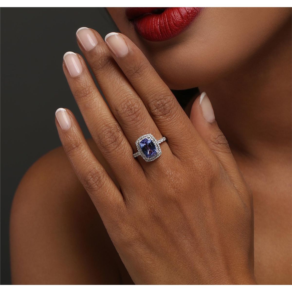 One electronically tested 14KT white gold ladies combination cast & assembled tanzanite and diamond ring with a flat shank with a bright polish finish. Identified with markings of "14K". Condition is new. Containing: One prong set rectangular cushion modified brilliant cut natural tanzanite, measuring 10.20 x 7.06 x 4.42mm, approximate weight of 2.51ct., clarity is eye clean, type I, medium, very slightly grayish, violet color, (GIA V 5/3), cut is good. Six prong set round brilliant cut diamonds, measuring 1.80 - 1.80 x 1.08mm (depth est.) approximate total weight of 6 Stones = 0.13ct. Clarity: SI-2 to I-2. Color: I - J, Cut is Good. Seventy-Two prong set round brilliant cut diamonds, measuring 1.10 - 1.10 x 0.66mm (depth est.) approximate total weight of 72 Stones = 0.35ct. Clarity: I-1 to I-2. Color: I - J, Cut is Good. Colored gemstones are presumed to have been subjected to commonly used enhancement processes. All diamonds and colored gemstones are graded in the mounting, unless otherwise stated. Total Weight of Colored Stones 2.51ct. Total Weight of Diamonds 0.47ct. Total Weight of Ring 3.40 grams. GGL Appraised at $6,260.00.