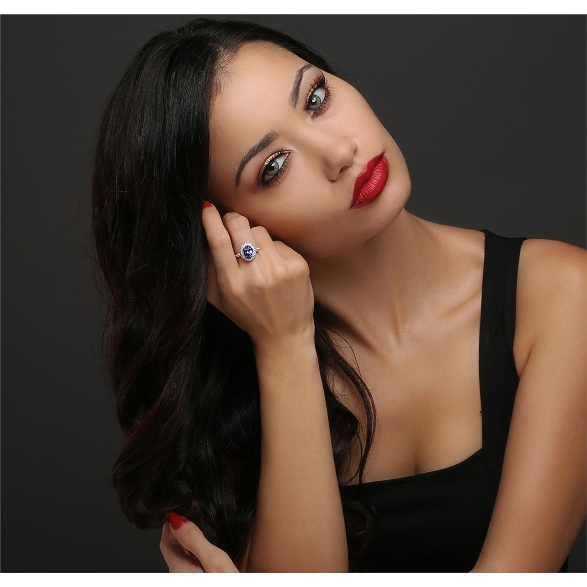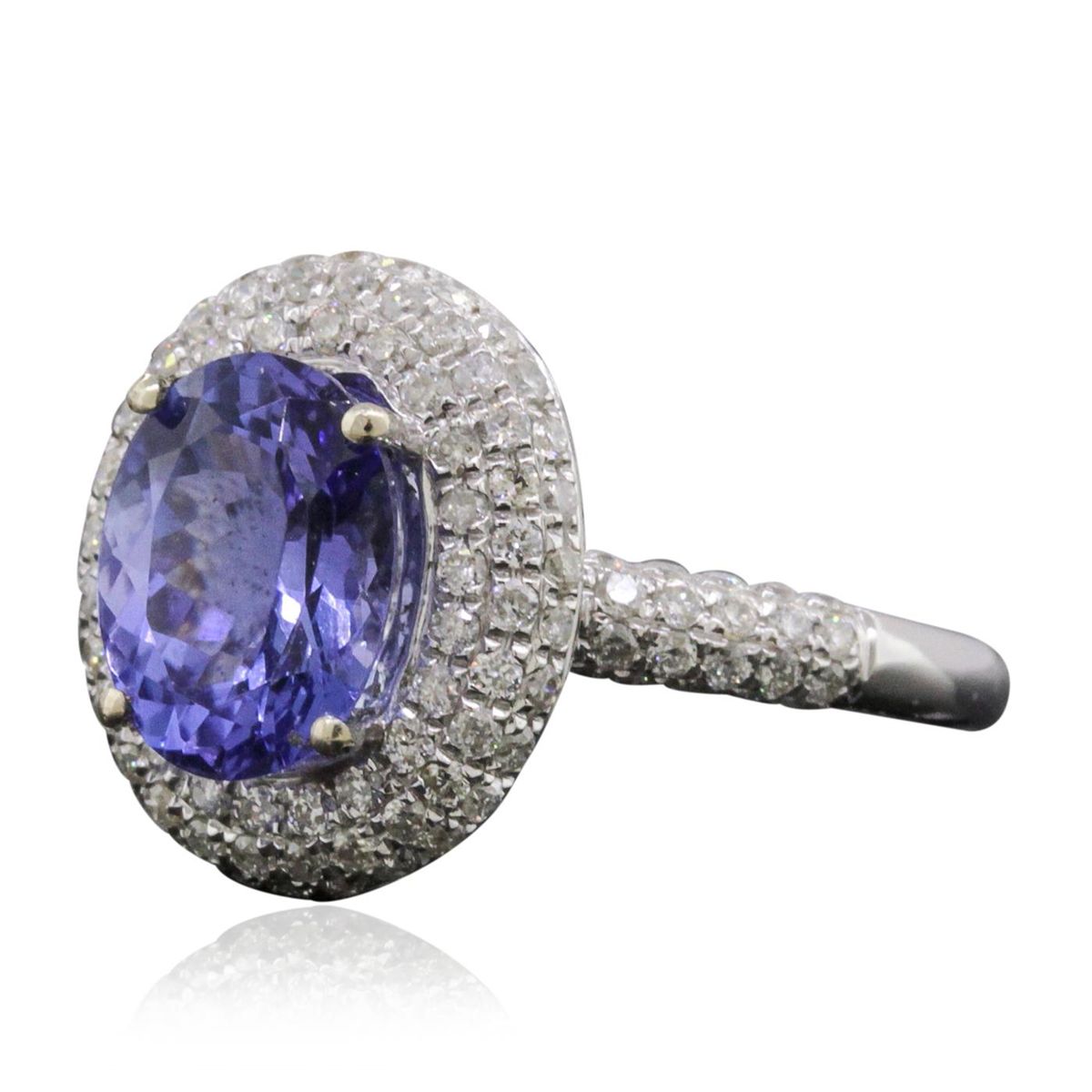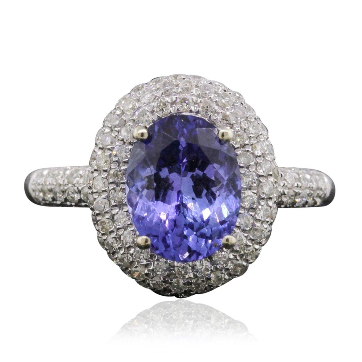 One electronically tested 14KT white gold ladies cast tanzanite & diamond ring with a bright finish. The featured tanzanite is set within a tiered diamond bezel, supported by a four diamond ribbon under gallery and diamond set shoulders, completed by a two millimeter wide band. Trademark is Orianne. Identified with markings of "14K". Condition is new, good workmanship. Containing: One prong set oval mixed cut natural tanzanite, measuring 9.20 x 7.20 x 5.20mm, 7% bulge factor, approximate weight of 2.51ct., clarity is eye clean, type I, medium dark, very slightly grayish, bluish violet color, (GIA bV 6/3), cut is good. Transmitting light with no distortion, transparent. Graded in the setting. Tanzanite is a very rare gemstone that is only found in the country of Tanzania. Originally discovered in 1967. Tiffany & Company, named the stone Tanzanite. It is found in the Usumburu Mountains that border the Umba Valley of northern Tanzania. Tanzanite occurs in gray, brown, violet, blue, reddish-purple, & green. The gem is interesting because of its exceptional pleochroism. Rotated in different directions a tanzanite will exhibit multiple changes of color. Tanzanite has a low tolerance to ultrasonic cleaning, and should not be cleaned using this method. One Hundred Thirty-Two prong set round brilliant cut diamonds, measuring 1.30 - 1.00 x 0.71mm (depth est.) approximate total weight of 132 Stones = 0.80ct. Graded in the setting. Clarity: I-1 to I-2. Color: H - J. Total Weight of Colored Stones 2.51ct. Total Weight of Diamonds 0.80ct. Total Weight of Ring 4.49 grams. AIG Appraised at $8,380.00.