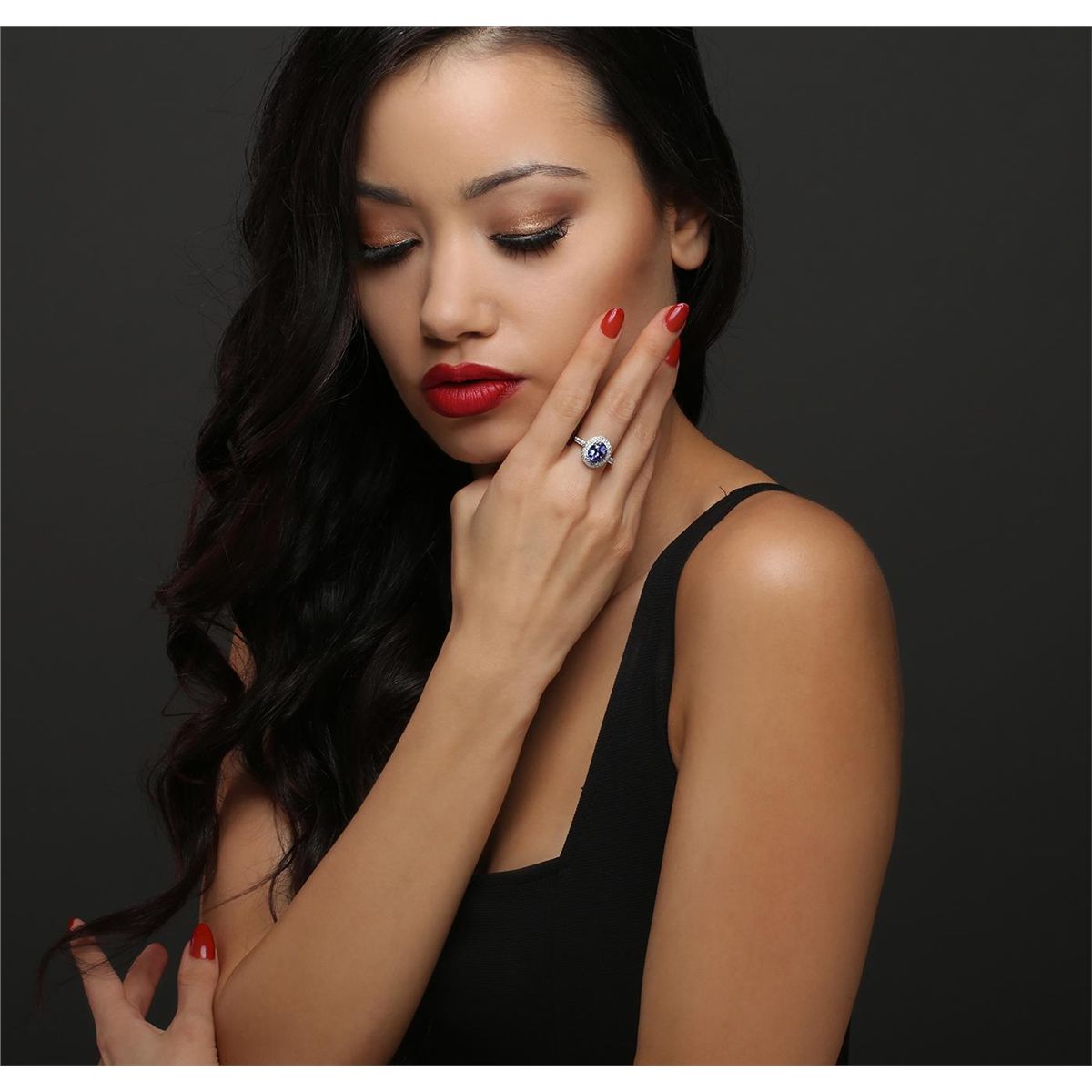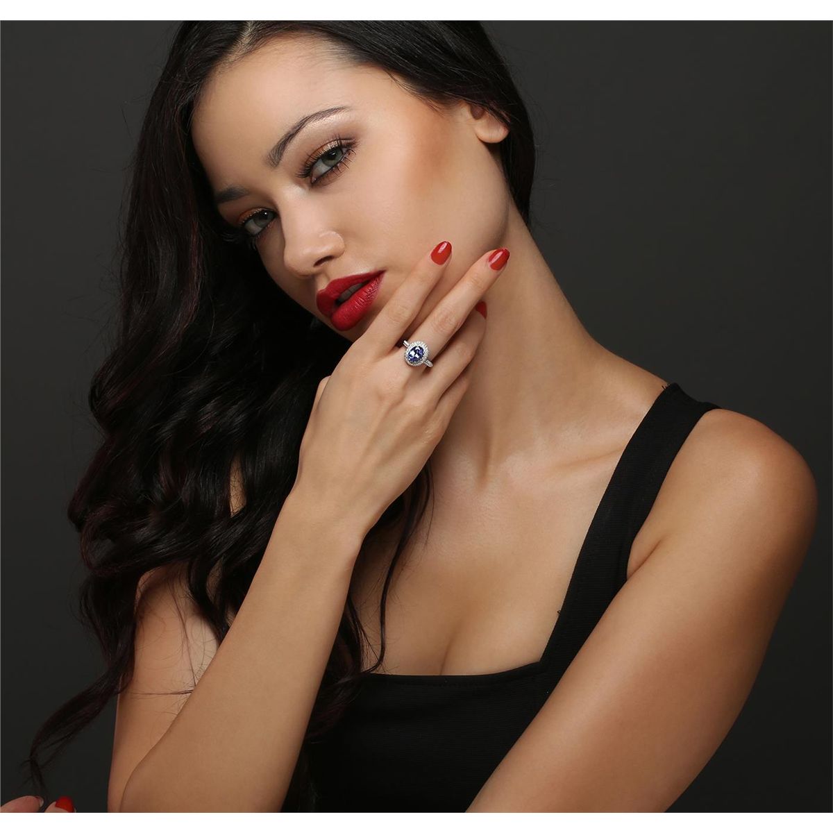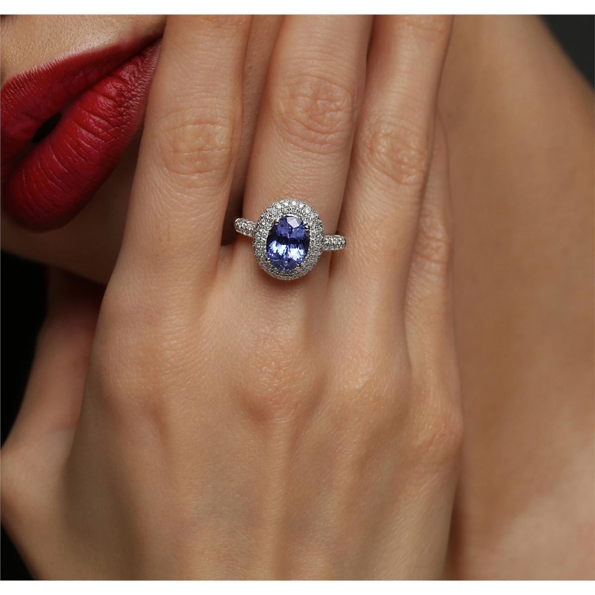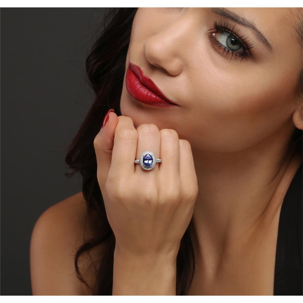 One electronically tested 14KT white gold ladies cast tanzanite & diamond ring with a bright finish. The featured tanzanite is set within a tiered diamond bezel, supported by a four diamond ribbon under gallery and diamond set shoulders, completed by a two millimeter wide band. Trademark is Orianne. Identified with markings of "14K". Condition is new, good workmanship. Containing: One prong set oval mixed cut natural tanzanite, measuring 9.20 x 7.20 x 5.20mm, 7% bulge factor, approximate weight of 2.51ct., clarity is eye clean, type I, medium dark, very slightly grayish, bluish violet color, (GIA bV 6/3), cut is good. Transmitting light with no distortion, transparent. Graded in the setting. Tanzanite is a very rare gemstone that is only found in the country of Tanzania. Originally discovered in 1967. Tiffany & Company, named the stone Tanzanite. It is found in the Usumburu Mountains that border the Umba Valley of northern Tanzania. Tanzanite occurs in gray, brown, violet, blue, reddish-purple, & green. The gem is interesting because of its exceptional pleochroism. Rotated in different directions a tanzanite will exhibit multiple changes of color. Tanzanite has a low tolerance to ultrasonic cleaning, and should not be cleaned using this method. One Hundred Thirty-Two prong set round brilliant cut diamonds, measuring 1.30 - 1.00 x 0.71mm (depth est.) approximate total weight of 132 Stones = 0.80ct. Graded in the setting. Clarity: I-1 to I-2. Color: H - J. Total Weight of Colored Stones 2.51ct. Total Weight of Diamonds 0.80ct. Total Weight of Ring 4.49 grams. AIG Appraised at $8,380.00.