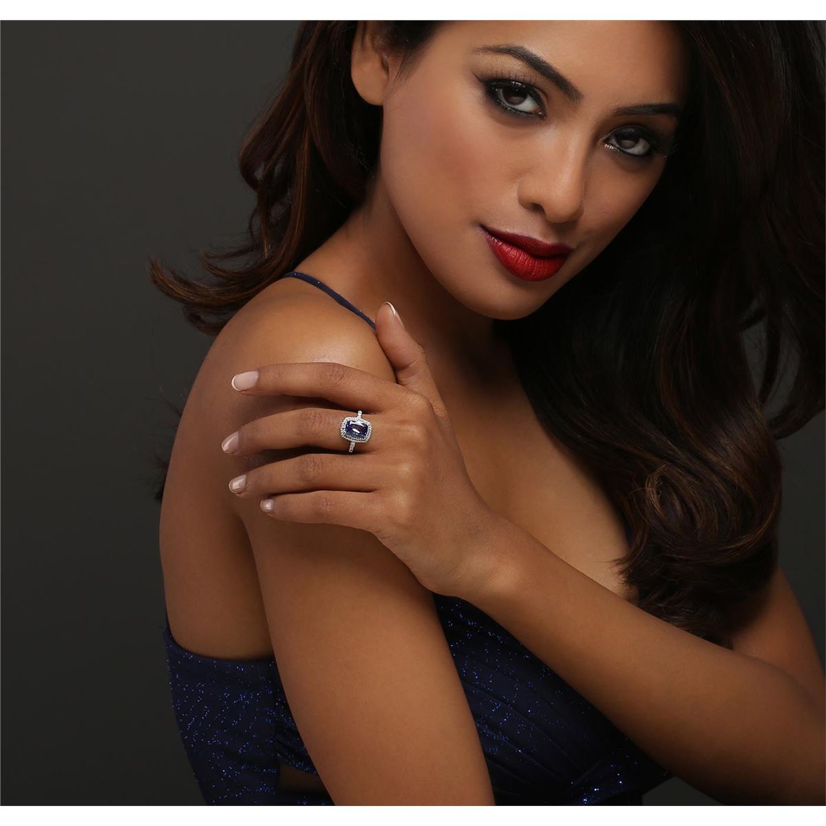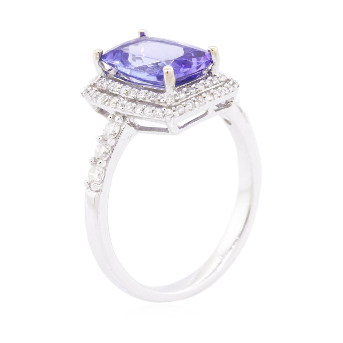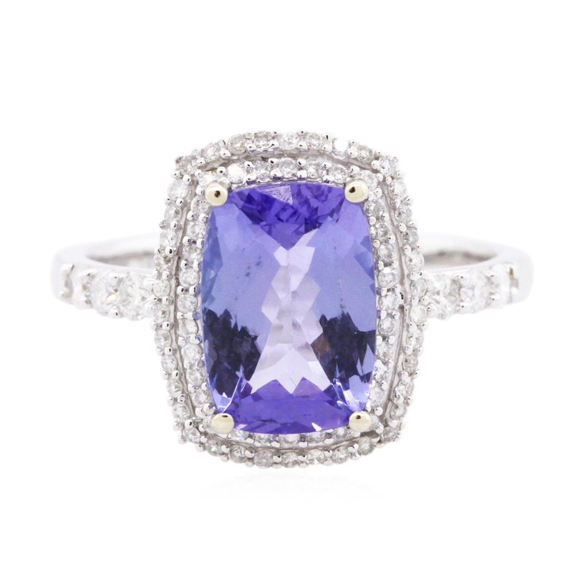 One electronically tested 14KT white gold ladies combination cast & assembled tanzanite and diamond ring with a flat shank with a bright polish finish. Identified with markings of "14K". Condition is new. Containing: One prong set rectangular cushion modified brilliant cut natural tanzanite, measuring 10.20 x 7.06 x 4.42mm, approximate weight of 2.51ct., clarity is eye clean, type I, medium, very slightly grayish, violet color, (GIA V 5/3), cut is good. Six prong set round brilliant cut diamonds, measuring 1.80 - 1.80 x 1.08mm (depth est.) approximate total weight of 6 Stones = 0.13ct. Clarity: SI-2 to I-2. Color: I - J, Cut is Good. Seventy-Two prong set round brilliant cut diamonds, measuring 1.10 - 1.10 x 0.66mm (depth est.) approximate total weight of 72 Stones = 0.35ct. Clarity: I-1 to I-2. Color: I - J, Cut is Good. Colored gemstones are presumed to have been subjected to commonly used enhancement processes. All diamonds and colored gemstones are graded in the mounting, unless otherwise stated. Total Weight of Colored Stones 2.51ct. Total Weight of Diamonds 0.47ct. Total Weight of Ring 3.40 grams. GGL Appraised at $6,260.00.