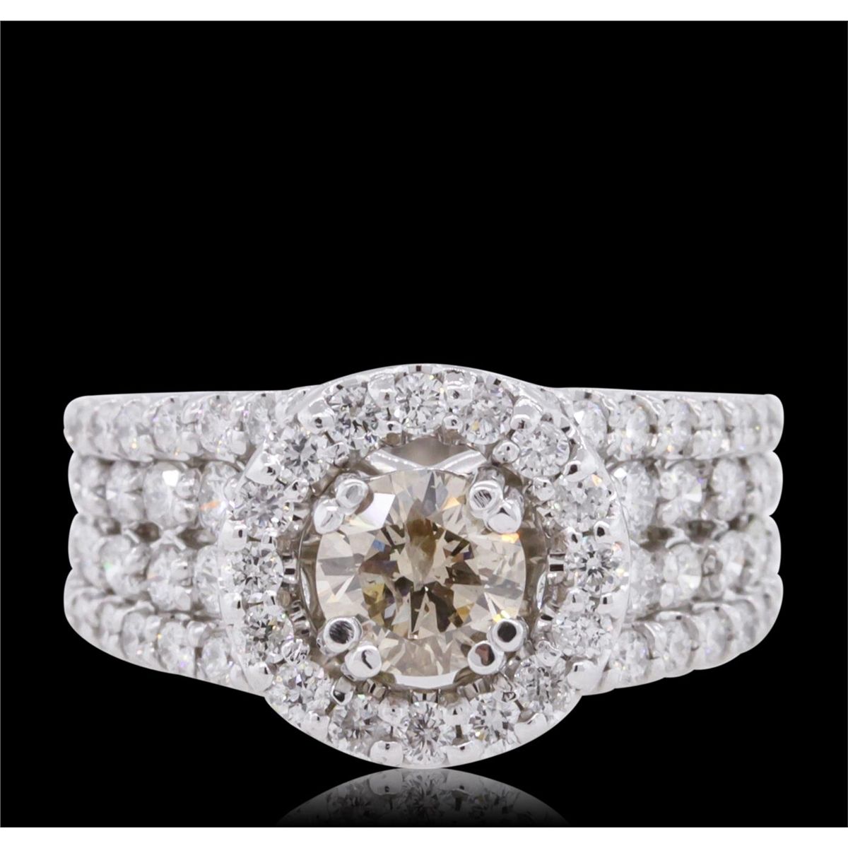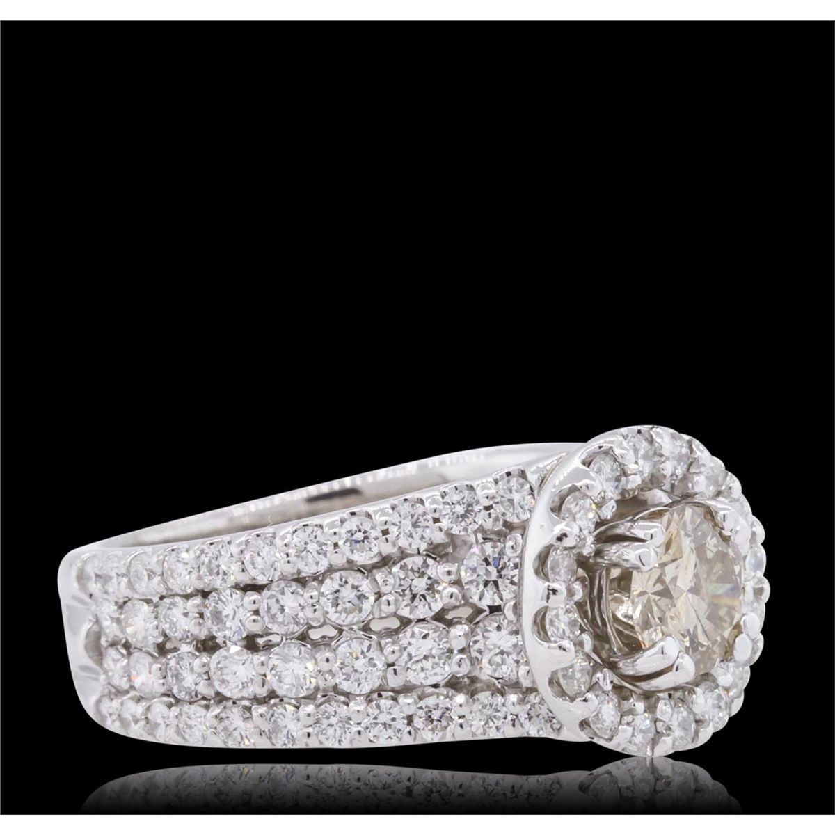 One electronically tested 14KT white gold ladies cast diamond ring with a bright polish finish. The featured diamond is set within a diamond bezel supported by elaborate diamond set shoulders, completed by a four and one-half millimeter wide band. Identified with markings of 14K. Condition is new, good workmanship. Containing: One prong set round brilliant cut diamond, measuring 5.75 - 5.70 x 3.20mm (depth est.), 5.00.%. GTCF approximate weight of 0.77ct with a medium blue fluorescence. Graded in the setting. Clarity: I-1. Depth: 55.9%. Table 62.8%. Ninety-Two prong set round brilliant cut diamonds, measuring 1.80 - 1.60 x 1.02mm (depth est.) approximate total weight of 92 Stones = 1.74ct. Graded in the setting. Clarity: SI-1 to I-1. Color: G - I. Total Weight of Diamonds 2.51ct. Total Weight of Ring 9.08 grams. AIG Appraised at $11,260.00.