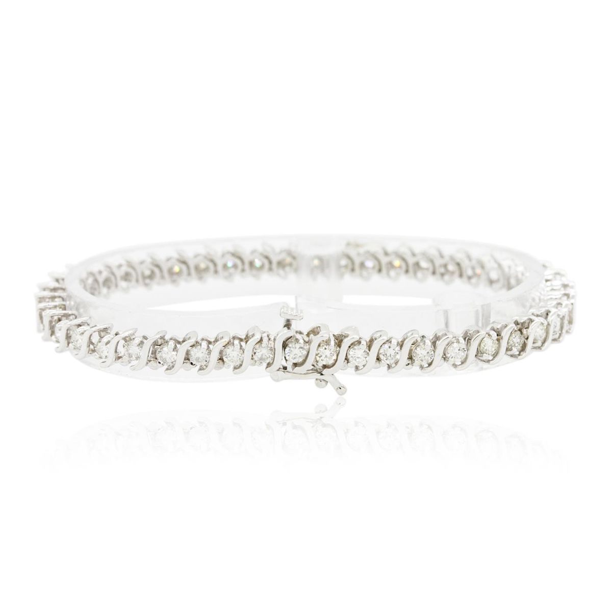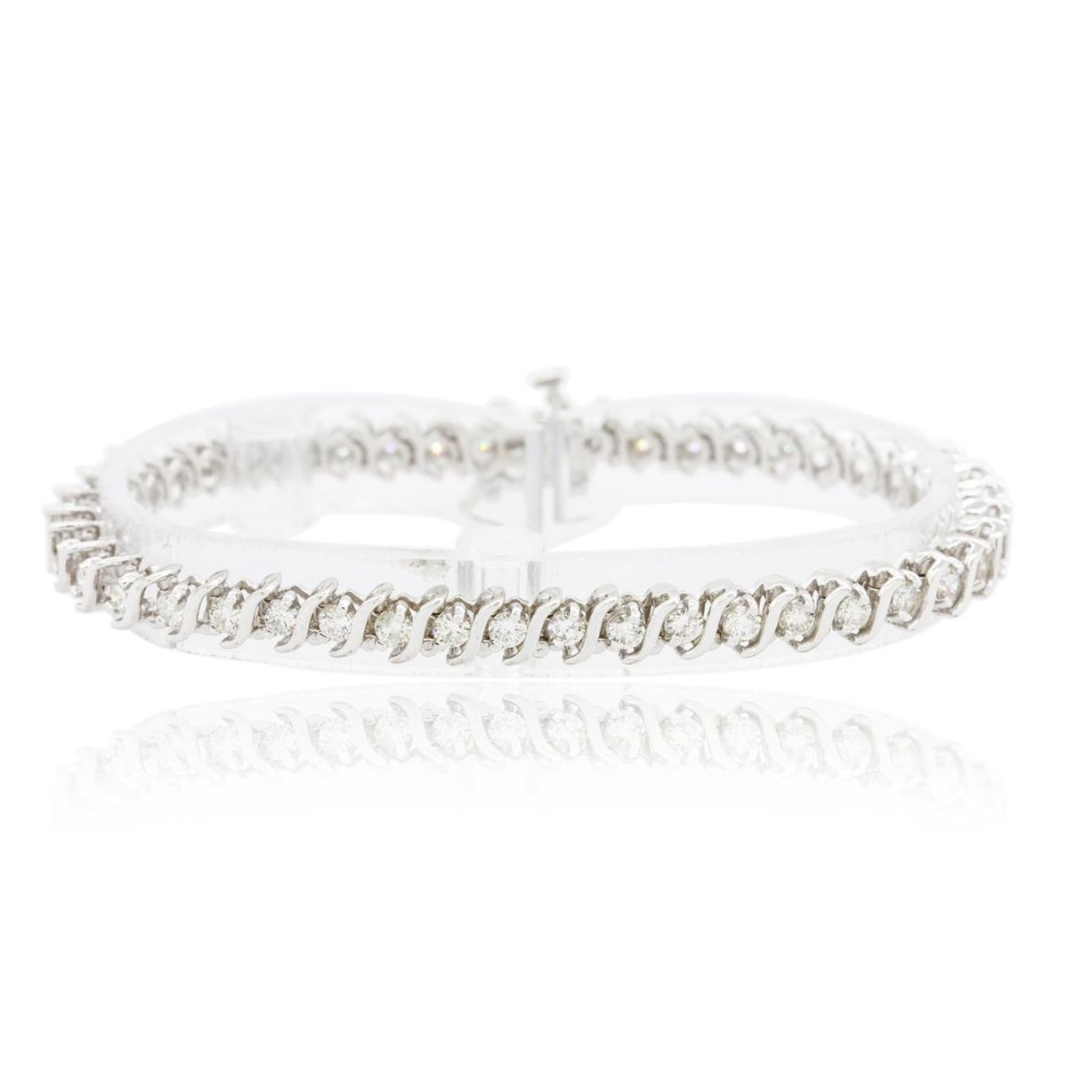One electronically tested 14KT white gold ladies combination cast & assembled tennis bracelet with a hidden box clasp with a bright polish finish. Measurements: 6.85" in length. Identified with markings of "14K". Condition is new. Containing: Forty-Four prong set round brilliant cut diamonds, measuring 2.50 - 2.50 x 1.50mm (depth est.) approximate total weight of 44 Stones = 2.51ct. Clarity: SI-1 to SI-2. Color: I - J, Cut is Good. All diamonds are graded in the mounting, unless otherwise stated. Total Weight of Diamonds 2.51ct. Total Weight of Bracelet 14.90 grams. GGL Appraised at $11,320.00.