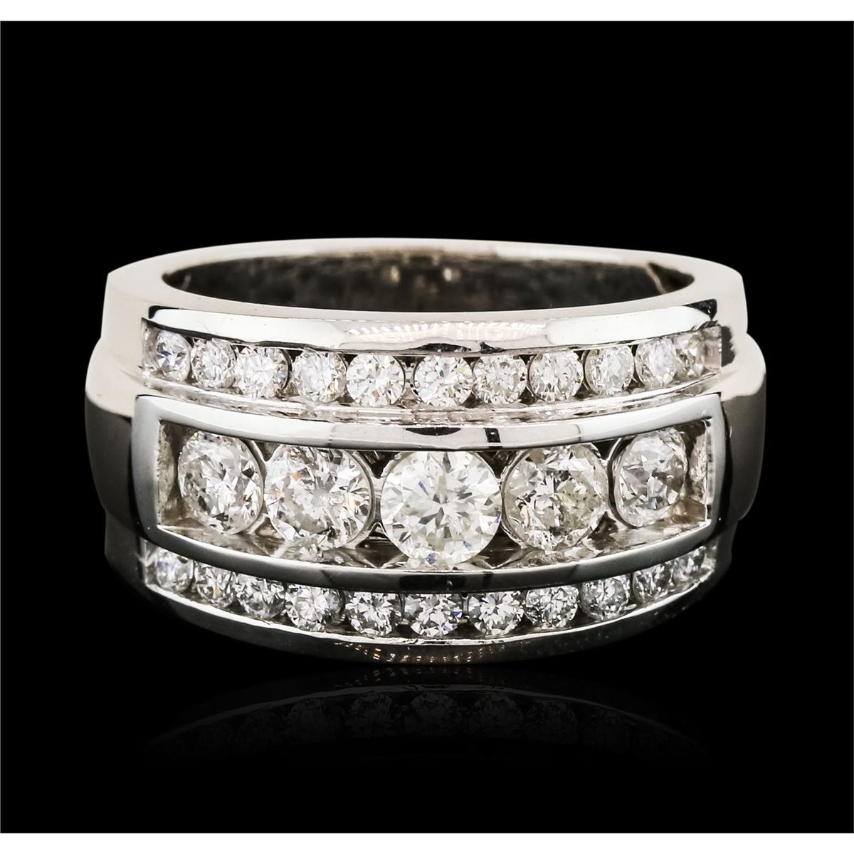 One electronically tested 14KT white gold mens combination cast & assembled diamond ring with a flat shank with a bright polish finish. Identified with markings of 14K. Condition is new. Containing: Five channel set round brilliant cut diamonds, measuring 4.50 - 4.50 x 2.70mm (depth est.) approximate total weight of 5 Stones = 1.67ct. Clarity: I-1 to I-2. Color: H - I, Cut is Good. Twenty-Two channel set round brilliant cut diamonds, measuring 2.20 - 2.20 x 1.32mm (depth est.) approximate total weight of 22 Stones = 0.86ct. Clarity: SI-1. Color: H - I, Cut is Good. All diamonds are graded in the mounting, unless otherwise stated. Total Weight of Diamonds 2.52ct. Total Weight of Ring 16.90 grams. GGL Appraised at $10,285.00.