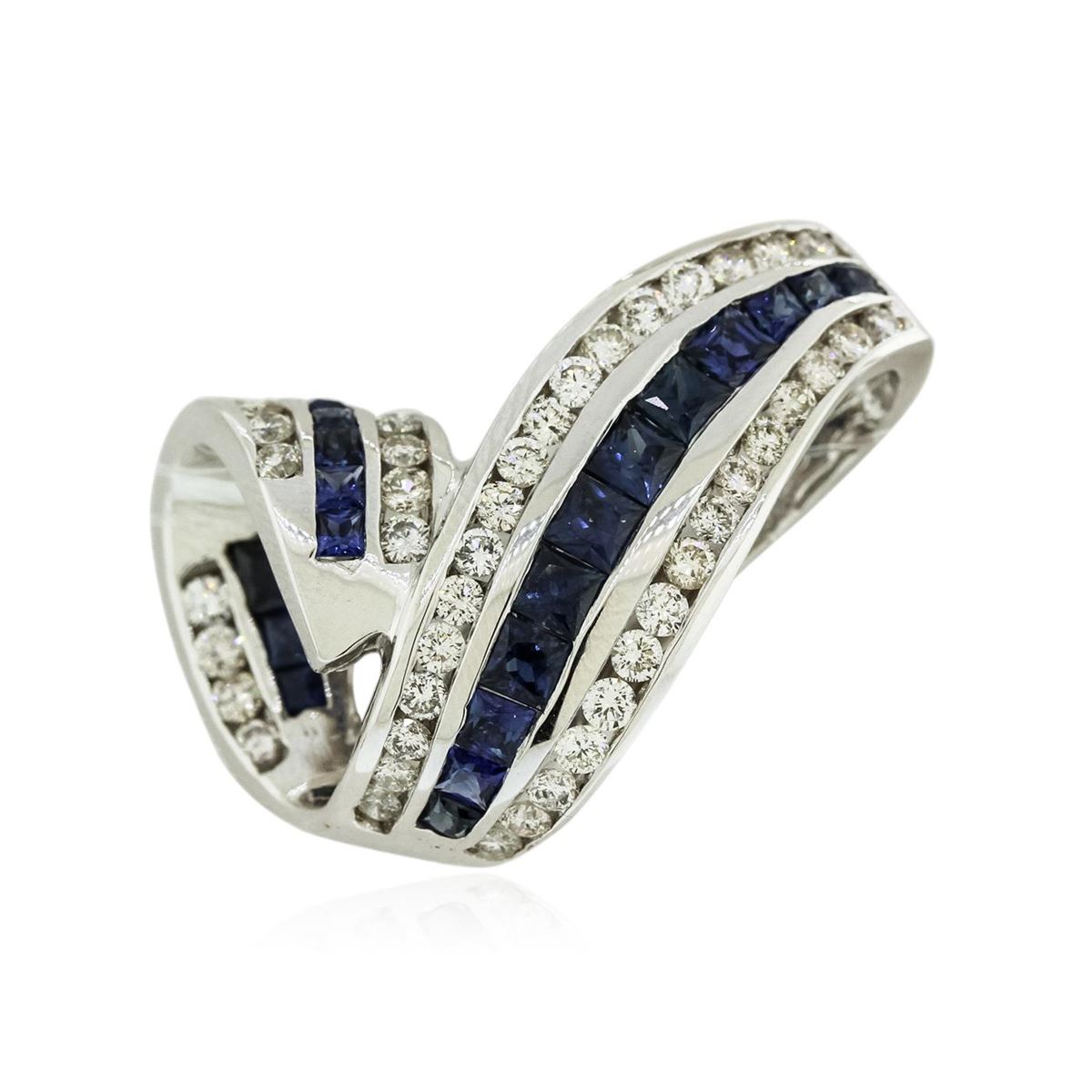One electronically tested 14KT white gold Ladies combination cast & assembled pendant with a bright polish finish. Condition is new. Containing: Forty-Six channel set round brilliant cut diamonds, measuring 2.30 - 2.00 x 1.29mm (depth est.) approximate total weight of 46 Stones = 1.67ct. Clarity of SI-2 to I-2, Color of I - J, Cut is Good. Twenty-one channel set princess standard brilliant cut natural blue sapphires, measuring 3.00 x 2.50 x 1.63mm, approximate total weight of 2.52ct., clarity is eye clean, type II, medium dark, moderately strong, blue color, (GIA B 6/4), cut is good. Colored gemstones are presumed to have been subjected to commonly used and possible undetectable color/clarity enhancement processes. Total Weight of Colored Stones 2.52ct. Total Weight of Diamonds 1.67ct. Total Weight of Pendant 11.20gm. GGL Appraised at $9,815.00.