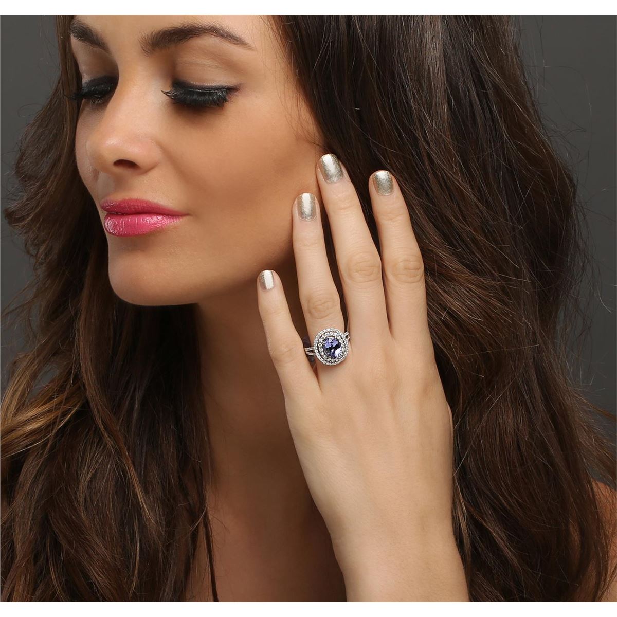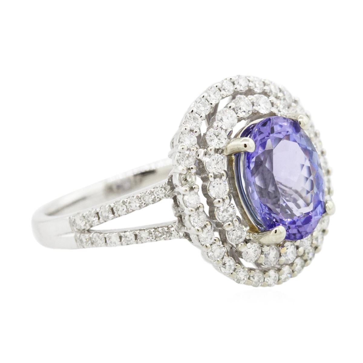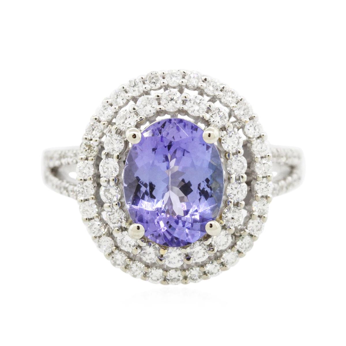 One electronically tested 14KT white gold ladies cast tanzanite & diamond ring with a bright finish. The featured tanzanite is set within tiered diamond bezels, supported by an elaborate white gold under gallery and diamond set shoulders, completed by a two millimeter wide band. Identified with markings of "14K". Condition is new, good workmanship. Containing: One prong set oval mixed cut natural tanzanite, measuring 9.70 x 7.60 x 5.02mm, approximate weight of 2.52ct., clarity is eye clean, type I, medium light, slightly grayish, bluish violet color, (GIA bV 4/2), cut is good. Transmitting light with no distortion, transparent. Graded in the setting. Tanzanite is a very rare gemstone that is only found in the country of Tanzania. Tanzanite was originally discovered in 1967. Tiffany & Company, named the stone "Tanzanite" after the country of origin. Tanzanite is found in the Usumburu Mountains that border the Umba Valley of northern Tanzania. This region is inhabited by the Masai tribes-people. The mining area is located just south of the Kenya border near Mt. Kilimanjaro. Tanzanite occurs in colors of gray, brown, violet, blue, reddish-purple, & green. The gem is interesting because of its exceptional pleochroism. Rotated in different directions a tanzanite will exhibit multiple changes of color. Tanzanite has a low tolerance to ultrasonic cleaning, and should not be cleaned using this method. Seventy-Six prong set round brilliant cut diamonds, measuring 1.80 - 1.00 x 0.84mm (depth est.) approximate total weight of 76 Stones = 0.74ct. Graded in the setting. Clarity: SI-2 to I-2. Color: G - I. Total Weight of Colored Stones 2.52ct. Total Weight of Diamonds 0.74ct. Total Weight of Ring 5.46 grams. AIG Appraised at $5,600.00.