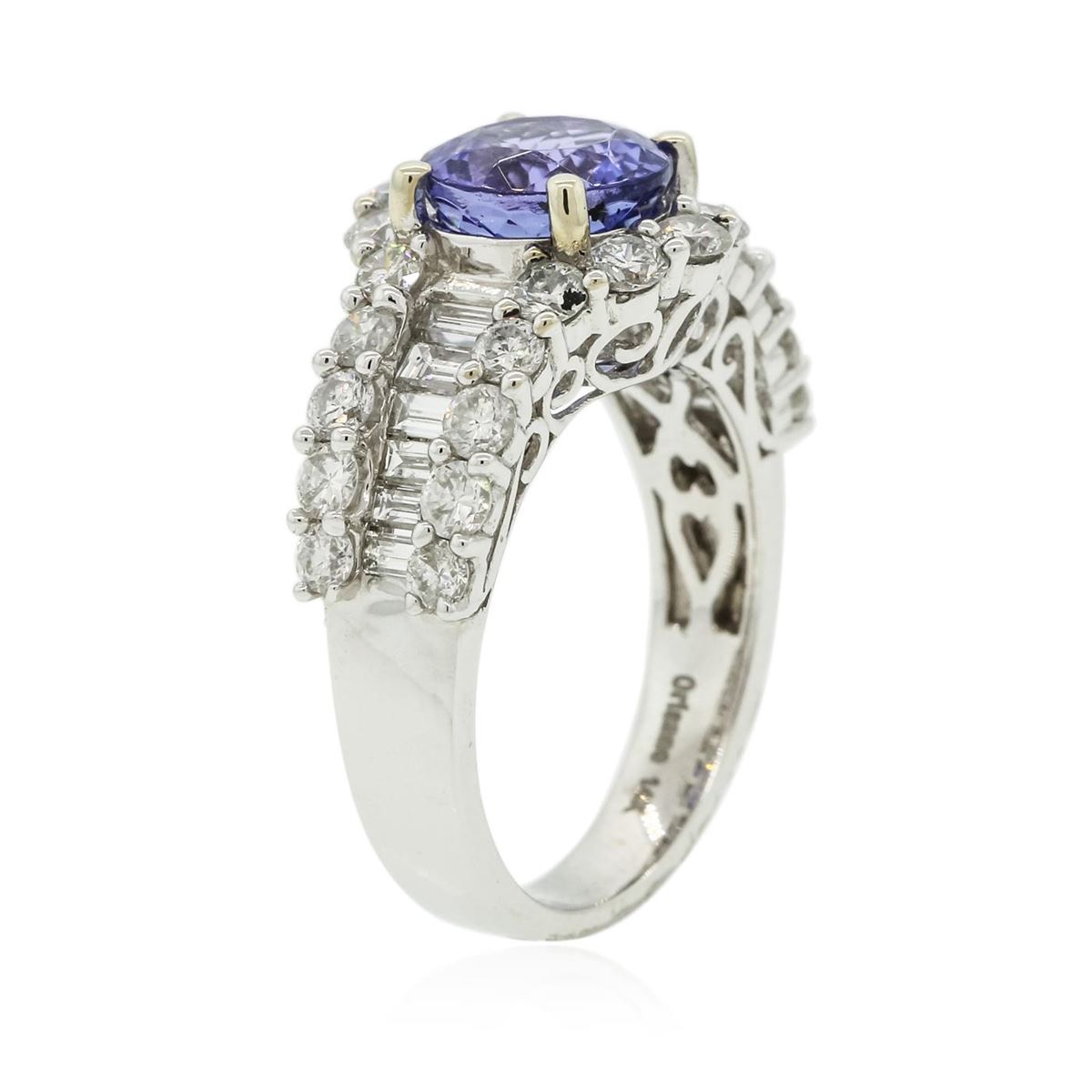 One electronically tested 14KT white gold ladies cast tanzanite and diamond ring with a bright polish finish. Condition is new, good workmanship. The featured tanzanite is set within mirroring diamond ribbons supported by diamond set shoulders, completed by a three millimeter wide band. Trademark is Orianne. Identified with markings of "14K". Containing: One prong set round brilliant cut natural tanzanite, measuring 8.10 - 8.00 x 5.40 mm, 6%. bulge factor, approximate weight of 2.52ct., clarity is eye clean, type I, medium dark, very slightly grayish, bluish violet color, (GIA bV 6/3), cut is good. Transmitting light with no distortion, transparent. Graded in the setting. Tanzanite is a very rare gemstone that is only found in the country of Tanzania. Originally discovered in 1967. Tiffany & Company, named the stone Tanzanite. It is found in the Usumburu Mountains that border the Umba Valley of northern Tanzania. Tanzanite occurs in gray, brown, violet, blue, reddish-purple, & green. The gem is interesting because of its exceptional pleochroism. Rotated in different directions a tanzanite will exhibit multiple changes of color. Tanzanite has a low tolerance to ultrasonic cleaning, and should not be cleaned using this method. Twenty-Six prong set round brilliant cut diamonds, measuring 2.60 - 2.30 x 1.47mm (depth est.) approximate. Total Weight of 26 Stones = 1.50ct. Graded in the setting. Clarity: SI-1 to I-1 . Color: G - I Twelve channel set baguette cut diamonds, measuring from 2.10 x 1.50 x 1.05mm (depth est.) to 3.20 x 1.80 x 1.26mm (depth est.) approximate. Total Weight of 12 Stones = 0.55ct. Graded in the setting. Clarity: VS-1 to SI-1 . Color: G - I. Total Weight of Colored Stones 2.52ct.. Total Weight of Diamonds 2.05ct.. Total Weight of Ring 6.67gm. AIG Appraised at $12,960.00.