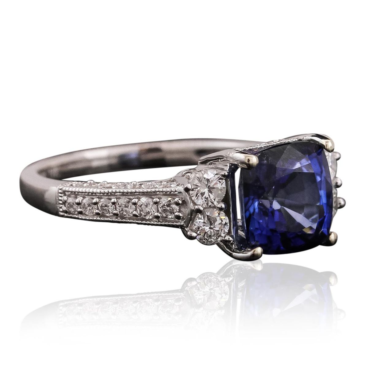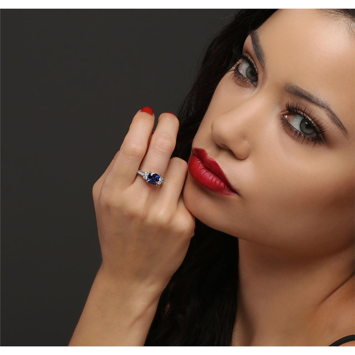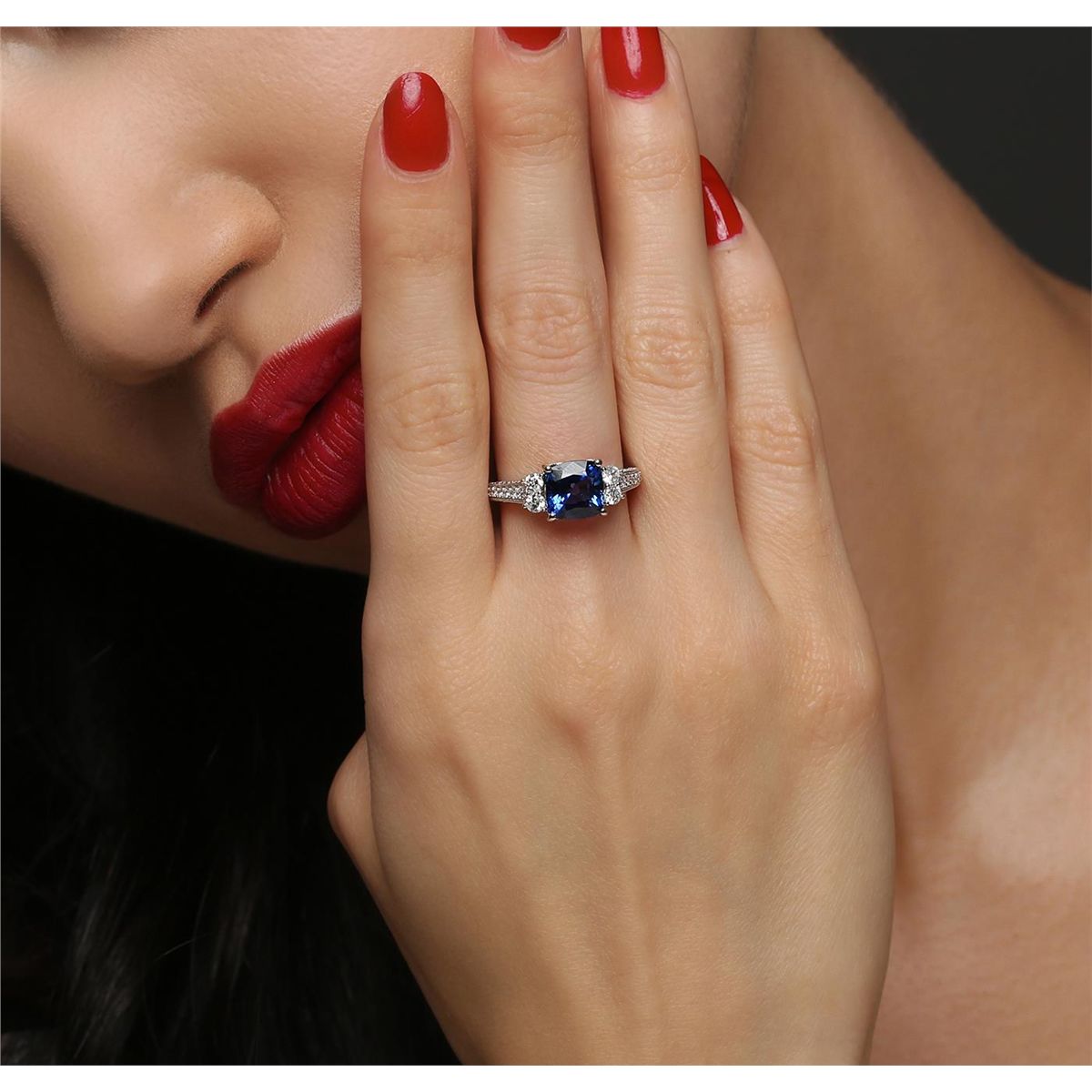 One electronically tested 14KT white gold ladies cast tanzanite & diamond ring with a bright finish. The featured tanzanite is set within a diamond set basket, supported by diamond set shoulders, completed by a two millimeter wide band. Trademark is Orianne. Identified with markings of "14K". Condition is new, good workmanship. Containing: One prong set square cushion mixed cut natural tanzanite, measuring 8.00 x 8.00 x 5.00mm, approximate weight of 2.52ct., clarity is eye clean, type I, medium dark, moderately strong, blue color, (GIA B 6/4), cut is good. Transmitting light with no distortion, transparent. Graded in the setting. Tanzanite is a very rare gemstone that is only found in the country of Tanzania. Originally discovered in 1967. Tiffany & Company, named the stone Tanzanite. It is found in the Usumburu Mountains that border the Umba Valley of northern Tanzania. Tanzanite occurs in gray, brown, violet, blue, reddish-purple, & green. The gem is interesting because of its exceptional pleochroism. Rotated in different directions a tanzanite will exhibit multiple changes of color. Tanzanite has a low tolerance to ultrasonic cleaning, and should not be cleaned using this method. Fifty-Six prong set round brilliant cut diamonds, measuring 2.60 - 1.00 x 1.08mm (depth est.) approximate total weight of 56 Stones = 0.68ct. Graded in the setting. Clarity: I-1 to I-2. Color: G - I. Total Weight of Colored Stones 2.52ct. Total Weight of Diamonds 0.68ct. Total Weight of Ring 4.25 grams. AIG Appraised at $7,480.00.