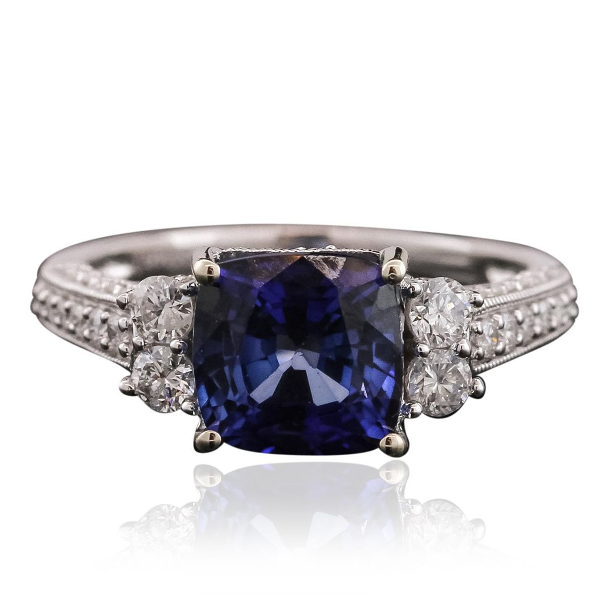 One electronically tested 14KT white gold ladies cast tanzanite & diamond ring with a bright finish. The featured tanzanite is set within a diamond set basket, supported by diamond set shoulders, completed by a two millimeter wide band. Trademark is Orianne. Identified with markings of "14K". Condition is new, good workmanship. Containing: One prong set square cushion mixed cut natural tanzanite, measuring 8.00 x 8.00 x 5.00mm, approximate weight of 2.52ct., clarity is eye clean, type I, medium dark, moderately strong, blue color, (GIA B 6/4), cut is good. Transmitting light with no distortion, transparent. Graded in the setting. Tanzanite is a very rare gemstone that is only found in the country of Tanzania. Originally discovered in 1967. Tiffany & Company, named the stone Tanzanite. It is found in the Usumburu Mountains that border the Umba Valley of northern Tanzania. Tanzanite occurs in gray, brown, violet, blue, reddish-purple, & green. The gem is interesting because of its exceptional pleochroism. Rotated in different directions a tanzanite will exhibit multiple changes of color. Tanzanite has a low tolerance to ultrasonic cleaning, and should not be cleaned using this method. Fifty-Six prong set round brilliant cut diamonds, measuring 2.60 - 1.00 x 1.08mm (depth est.) approximate total weight of 56 Stones = 0.68ct. Graded in the setting. Clarity: I-1 to I-2. Color: G - I. Total Weight of Colored Stones 2.52ct. Total Weight of Diamonds 0.68ct. Total Weight of Ring 4.25 grams. AIG Appraised at $7,480.00.