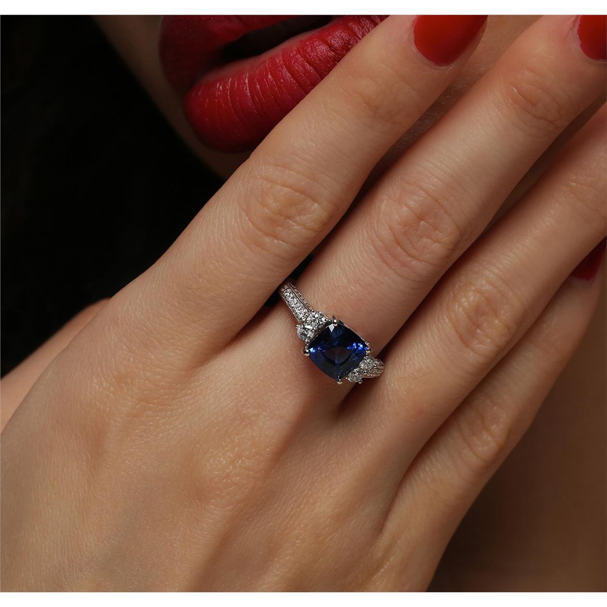 One electronically tested 14KT white gold ladies cast tanzanite & diamond ring with a bright finish. The featured tanzanite is set within a diamond set basket, supported by diamond set shoulders, completed by a two millimeter wide band. Trademark is Orianne. Identified with markings of "14K". Condition is new, good workmanship. Containing: One prong set square cushion mixed cut natural tanzanite, measuring 8.00 x 8.00 x 5.00mm, approximate weight of 2.52ct., clarity is eye clean, type I, medium dark, moderately strong, blue color, (GIA B 6/4), cut is good. Transmitting light with no distortion, transparent. Graded in the setting. Tanzanite is a very rare gemstone that is only found in the country of Tanzania. Originally discovered in 1967. Tiffany & Company, named the stone Tanzanite. It is found in the Usumburu Mountains that border the Umba Valley of northern Tanzania. Tanzanite occurs in gray, brown, violet, blue, reddish-purple, & green. The gem is interesting because of its exceptional pleochroism. Rotated in different directions a tanzanite will exhibit multiple changes of color. Tanzanite has a low tolerance to ultrasonic cleaning, and should not be cleaned using this method. Fifty-Six prong set round brilliant cut diamonds, measuring 2.60 - 1.00 x 1.08mm (depth est.) approximate total weight of 56 Stones = 0.68ct. Graded in the setting. Clarity: I-1 to I-2. Color: G - I. Total Weight of Colored Stones 2.52ct. Total Weight of Diamonds 0.68ct. Total Weight of Ring 4.25 grams. AIG Appraised at $7,480.00.