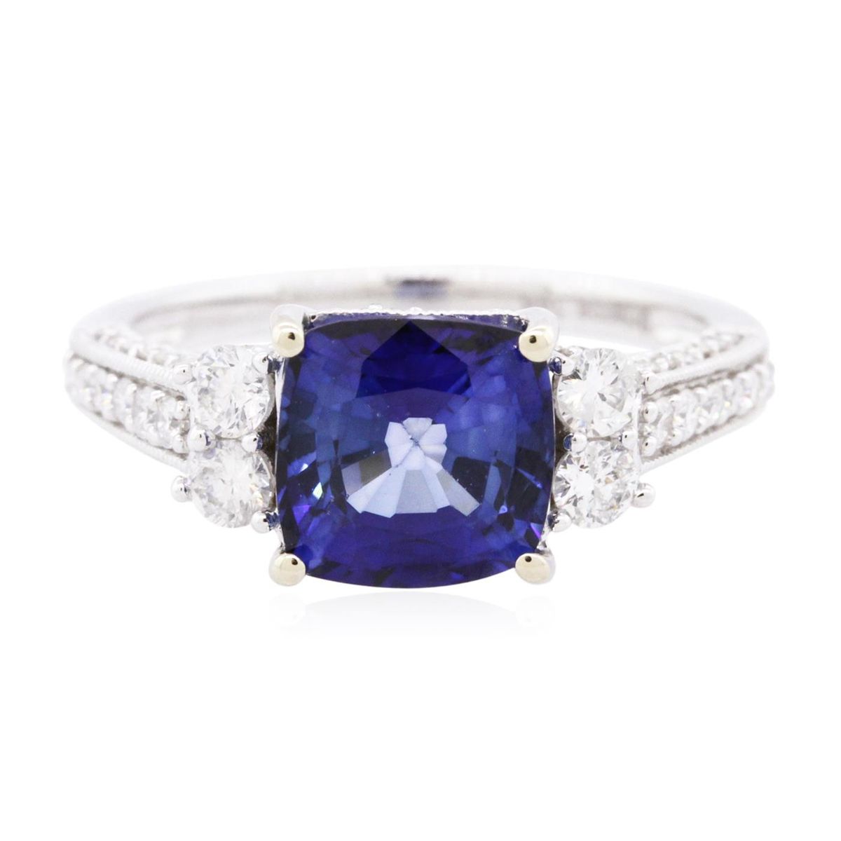 One electronically tested 14KT white gold ladies cast tanzanite & diamond ring with a bright finish. The featured tanzanite is set within a diamond set basket, supported by diamond set shoulders, completed by a two millimeter wide band. Trademark is Orianne. Identified with markings of "14K". Condition is new, good workmanship. Containing: One prong set square cushion mixed cut natural tanzanite, measuring 8.00 x 8.00 x 5.00mm, approximate weight of 2.52ct., clarity is eye clean, type I, medium dark, moderately strong, blue color, (GIA B 6/4), cut is good. Transmitting light with no distortion, transparent. Graded in the setting. Tanzanite is a very rare gemstone that is only found in the country of Tanzania. Originally discovered in 1967. Tiffany & Company, named the stone Tanzanite. It is found in the Usumburu Mountains that border the Umba Valley of northern Tanzania. Tanzanite occurs in gray, brown, violet, blue, reddish-purple, & green. The gem is interesting because of its exceptional pleochroism. Rotated in different directions a tanzanite will exhibit multiple changes of color. Tanzanite has a low tolerance to ultrasonic cleaning, and should not be cleaned using this method. Fifty-Six prong set round brilliant cut diamonds, measuring 2.60 - 1.00 x 1.08mm (depth est.) approximate total weight of 56 Stones = 0.68ct. Graded in the setting. Clarity: I-1 to I-2. Color: G - I. Total Weight of Colored Stones 2.52ct. Total Weight of Diamonds 0.68ct. Total Weight of Ring 4.25 grams. AIG Appraised at $7,480.00.