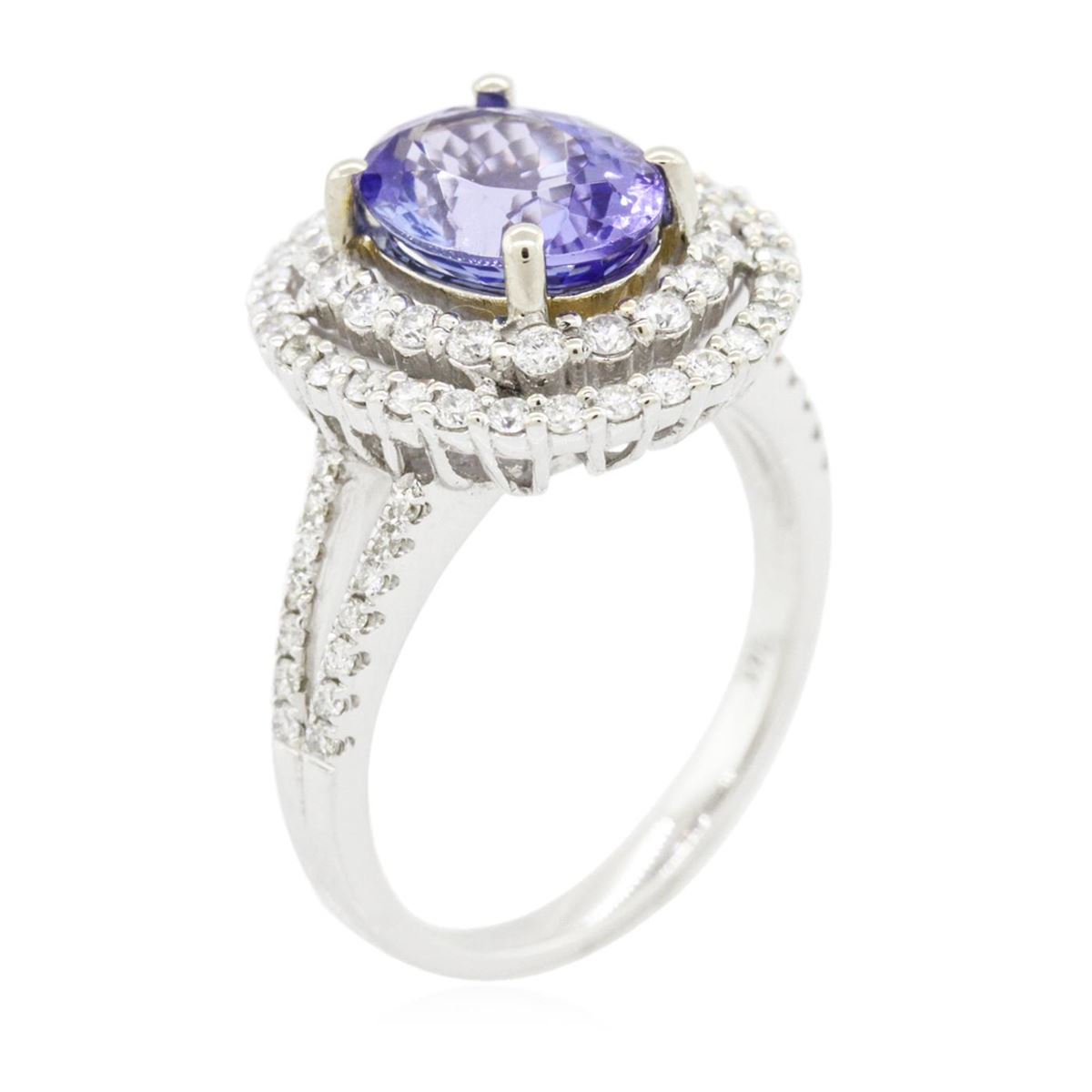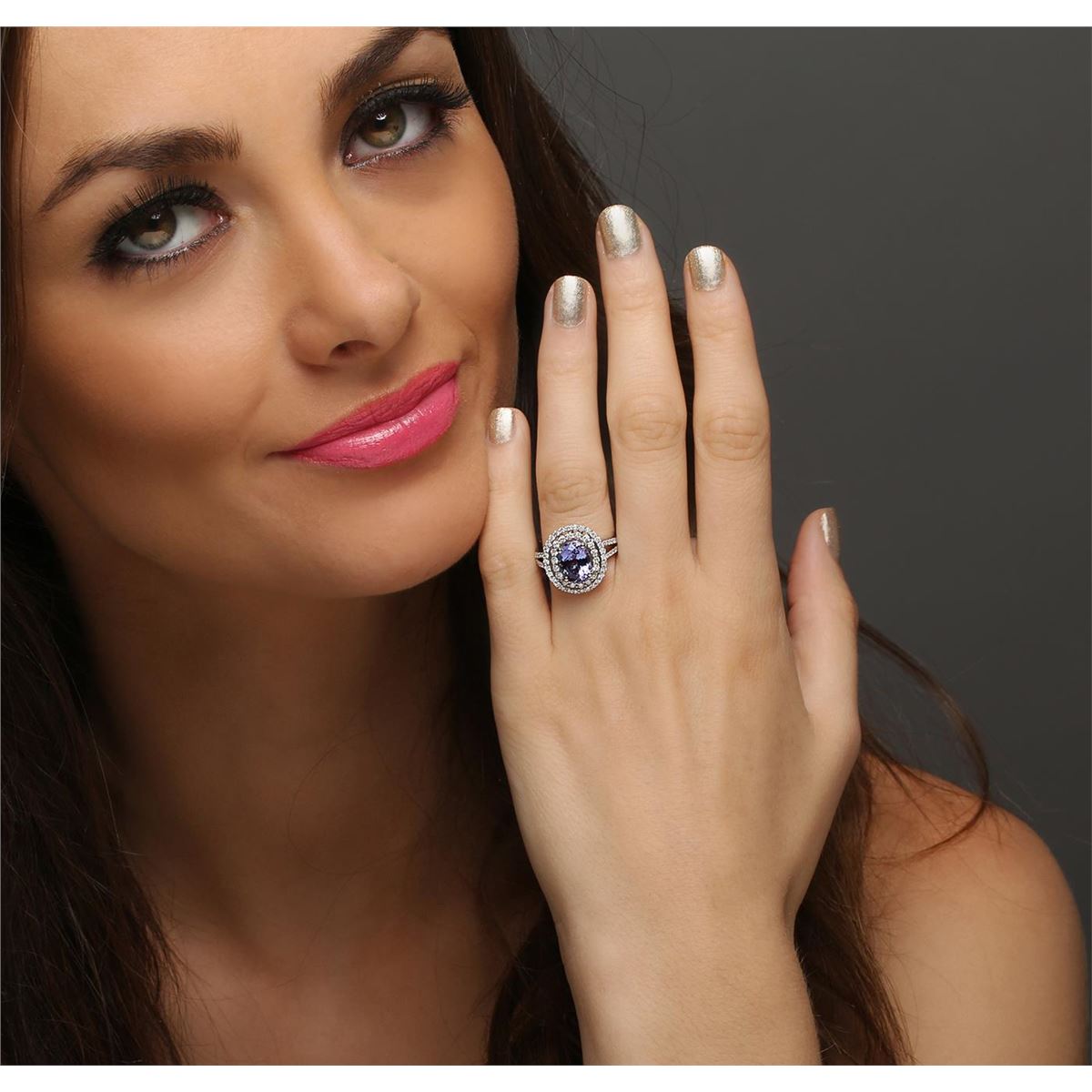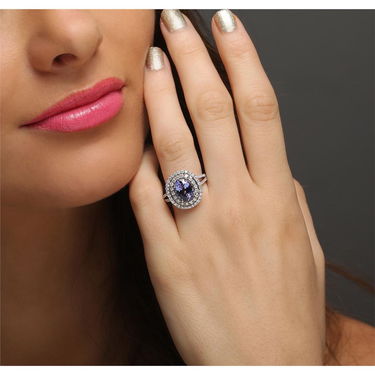 One electronically tested 14KT white gold ladies cast tanzanite & diamond ring with a bright finish. The featured tanzanite is set within tiered diamond bezels, supported by an elaborate white gold under gallery and diamond set shoulders, completed by a two millimeter wide band. Identified with markings of "14K". Condition is new, good workmanship. Containing: One prong set oval mixed cut natural tanzanite, measuring 9.70 x 7.60 x 5.02mm, approximate weight of 2.52ct., clarity is eye clean, type I, medium light, slightly grayish, bluish violet color, (GIA bV 4/2), cut is good. Transmitting light with no distortion, transparent. Graded in the setting. Tanzanite is a very rare gemstone that is only found in the country of Tanzania. Tanzanite was originally discovered in 1967. Tiffany & Company, named the stone "Tanzanite" after the country of origin. Tanzanite is found in the Usumburu Mountains that border the Umba Valley of northern Tanzania. This region is inhabited by the Masai tribes-people. The mining area is located just south of the Kenya border near Mt. Kilimanjaro. Tanzanite occurs in colors of gray, brown, violet, blue, reddish-purple, & green. The gem is interesting because of its exceptional pleochroism. Rotated in different directions a tanzanite will exhibit multiple changes of color. Tanzanite has a low tolerance to ultrasonic cleaning, and should not be cleaned using this method. Seventy-Six prong set round brilliant cut diamonds, measuring 1.80 - 1.00 x 0.84mm (depth est.) approximate total weight of 76 Stones = 0.74ct. Graded in the setting. Clarity: SI-2 to I-2. Color: G - I. Total Weight of Colored Stones 2.52ct. Total Weight of Diamonds 0.74ct. Total Weight of Ring 5.46 grams. AIG Appraised at $5,600.00.