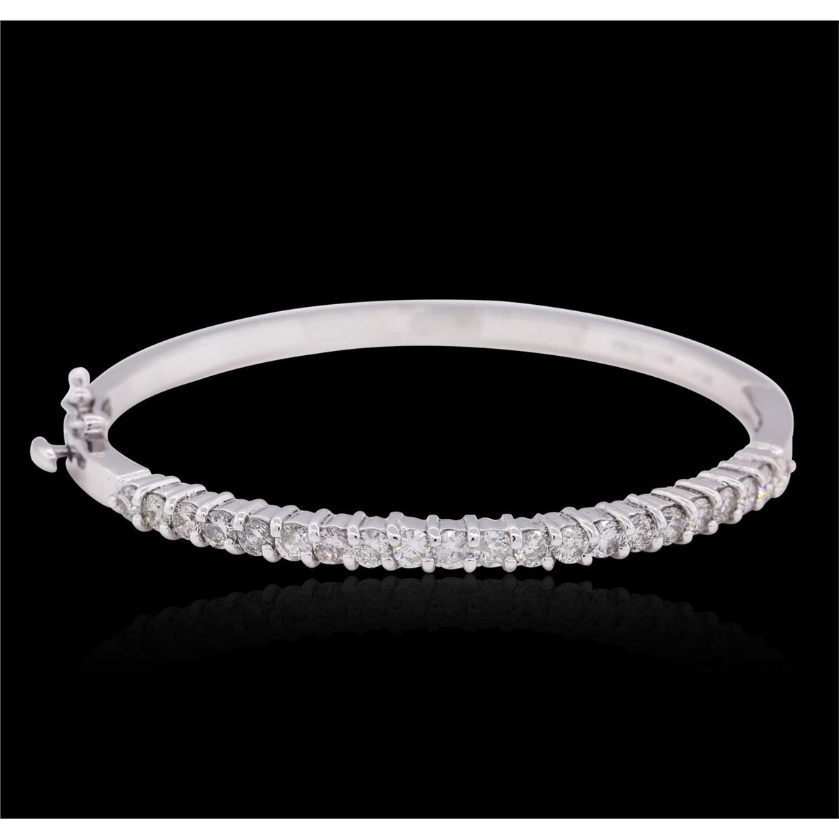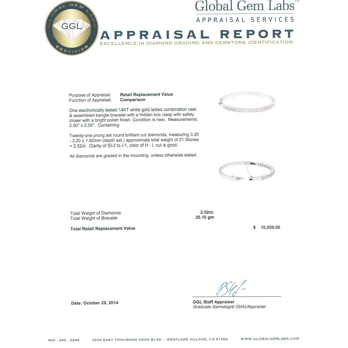 One electronically tested 14KT white gold ladies combination cast & assembled bangle bracelet with a hidden box clasp with safety closer with a bright polish finish. Measurements: 2.50 x 2.00. Condition is new. Containing: Twenty-One prong set round brilliant cut diamonds, measuring 3.20 - 3.20 x 1.92mm (depth est.) approximate total weight of 21 Stones = 2.52ct. Clarity: SI-2 to I-1. Color: H - I, Cut is Good. All diamonds are graded in the mounting, unless otherwise stated. Total Weight of Diamonds 2.52ct. Total Weight of Bracelet 20.10 grams. GGL Appraised at $10,055.00.