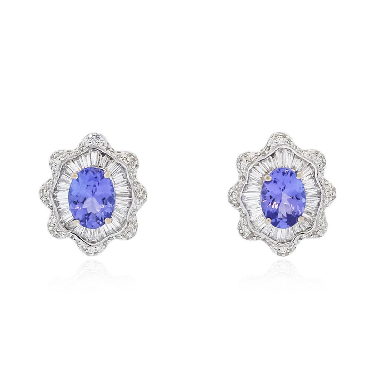One pair electronically tested 14KT white gold ladies combination cast & assembled stud earrings with friction posts with a bright polish finish. Identified with markings of "14K". Condition is new. Containing: Two prong set oval modified brilliant cut natural tanzanites, measuring 8.00 x 5.94 x 3.86mm, approximate total weight of 2.52ct., clarity is eye clean, type I, medium light, very slightly grayish, violet color, (GIA V 4/3), cut is good. Two Hundred Twenty-Four prong set round brilliant cut diamonds, measuring 1.00. - 1.00 x 0.60mm (depth est.) approximate total weight of 224 Stones = 0.81ct. Clarity: I-1 to I-2. Color: I - J, Cut is Good. Sixty channel set baguette cut diamonds, measuring from 1.50 x 1.10 x 0.94mm (depth est.) to 2.00 x 1.10 x 0.94mm (depth est.) approximate total weight of 60 Stones = 0.99ct. Clarity: SI-1. Color: I - J, Cut is Good. Colored gemstones are presumed to have been subjected to commonly used enhancement processes. All diamonds and colored gemstones are graded in the mounting, unless otherwise stated. Total Weight of Colored Stones 2.52ct. Total Weight of Diamonds 1.80ct. Total Weight of Earrings 5.00. grams. GGL Appraised at $8,850.00.