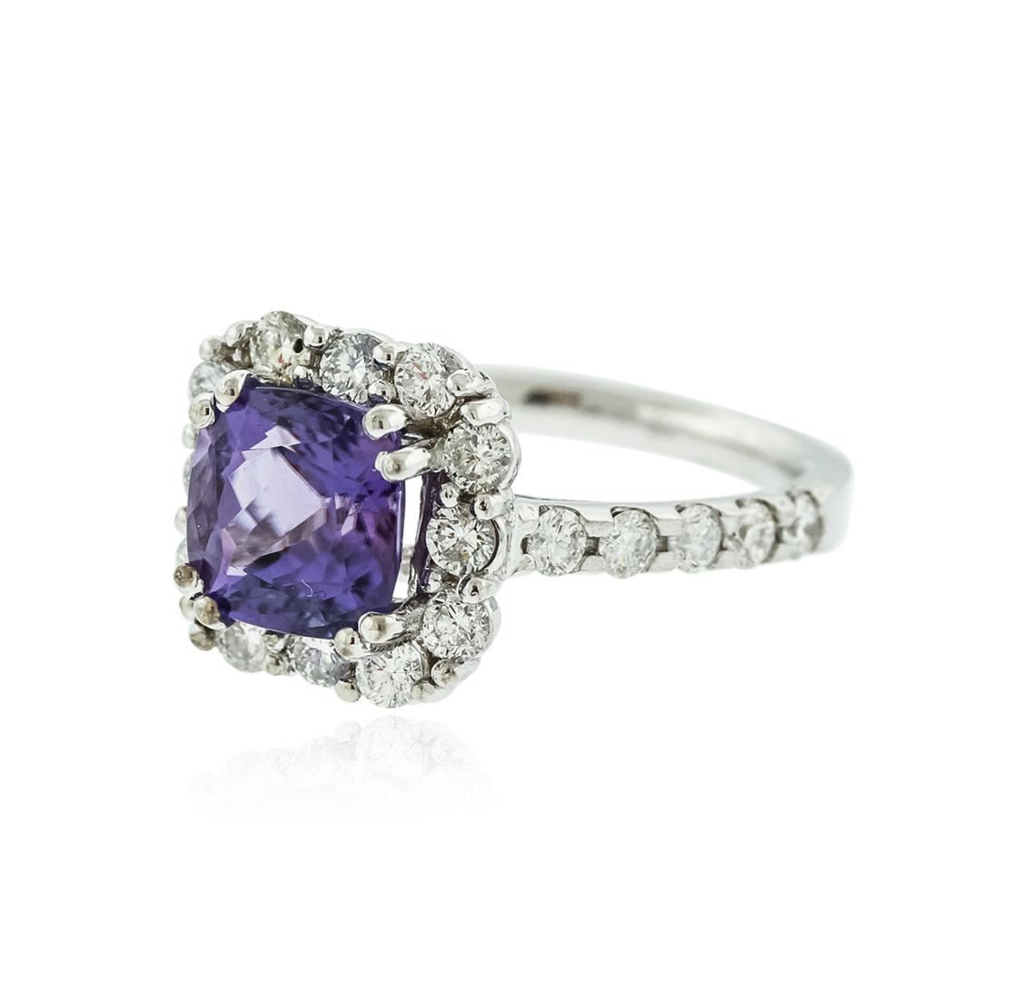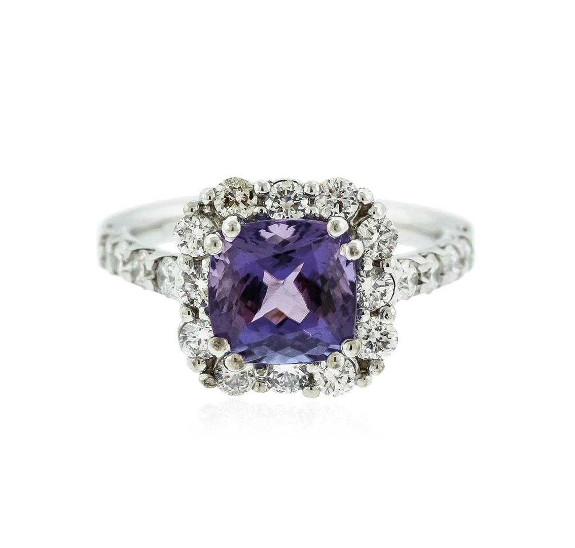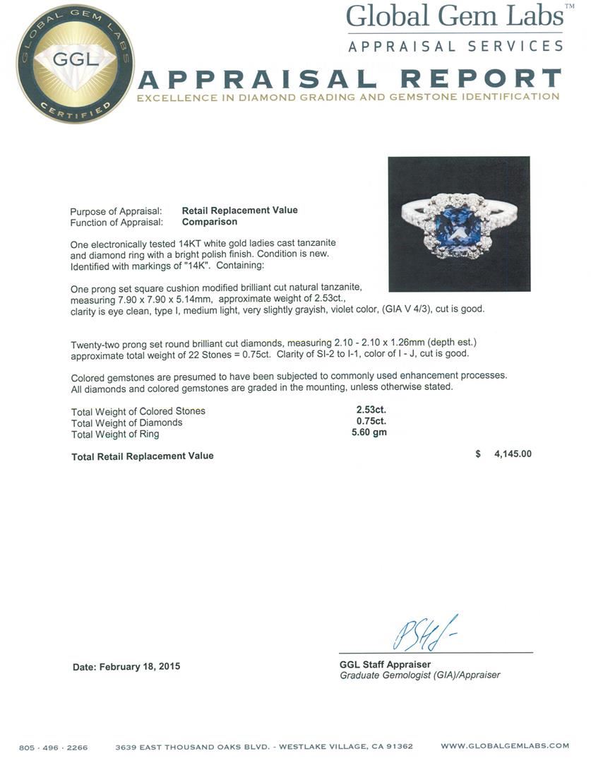 One electronically tested 14KT white gold ladies cast tanzanite and diamond ring with a bright polish finish. Identified with markings of "14K". Condition is new. Containing: One prong set square cushion modified brilliant cut natural tanzanite, measuring 7.90 x 7.90 x 5.14mm, approximate weight of 2.53ct., clarity is eye clean, type I, medium light, very slightly grayish, violet color, (GIA V 4/3), cut is good. Twenty-Two prong set round brilliant cut diamonds, measuring 2.10 - 2.10 x 1.26mm (depth est.) approximate total weight of 22 Stones = 0.75ct. Clarity: SI-2 to I-1. Color: I - J, Cut is Good. Colored gemstones are presumed to have been subjected to commonly used enhancement processes. All diamonds and colored gemstones are graded in the mounting, unless otherwise stated. Total Weight of Colored Stones 2.53ct. Total Weight of Diamonds 0.75ct. Total Weight of Ring 5.60 grams. GGL Appraised at $4,145.00.