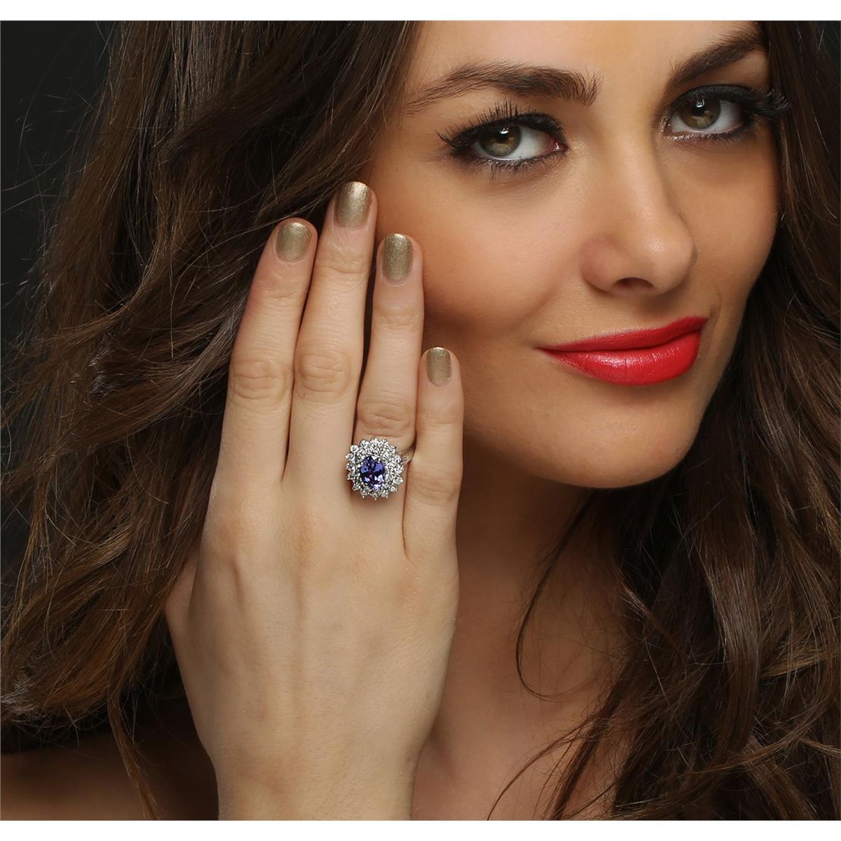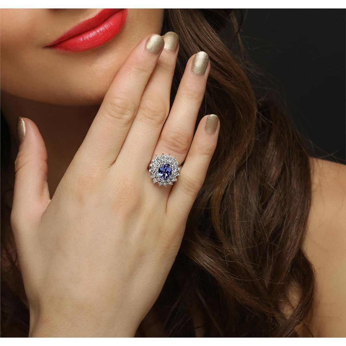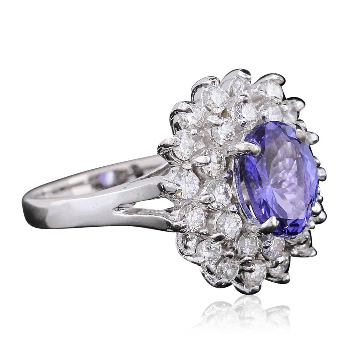 One electronically tested 14KT white gold ladies cast tanzanite & diamond ring. The featured tanzanite is set within tiered diamond bezels, supported by a ribbed under gallery, completed by a two and one half millimeter wide band. Bright polish finish. Containing: One prong set oval mixed cut natural tanzanite, measuring 9.50 x 7.10 x 5.02mm, 10% bulge factor, approximate weight of 2.55ct., clarity is slightly included, type I, medium dark, slightly grayish, violetish blue color, (GIA vB 6/2), cut is good. Transmitting light with no distortion, transparent. Naturally occurring internal characteristics are present. Graded in the setting. Tanzanite is a very rare gemstone that is only found in the country of Tanzania. Tanzanite was originally discovered in 1967. Tiffany & Company, named the stone "Tanzanite" after the country of origin. Tanzanite is found in the Usumburu Mountains that border the Umba Valley of northern Tanzania. This region is inhabited by the Masai tribes-people. The mining area is located just south of the Kenya border near Mt. Kilimanjaro. Tanzanite occurs in colors of gray, brown, violet, blue, reddish-purple, & green. The gem is interesting because of its exceptional pleochroism. Rotated in different directions a tanzanite will exhibit multiple changes of color. Tanzanite has a low tolerance to ultrasonic cleaning, and should not be cleaned using this method. Twenty-Eight prong set round brilliant cut diamonds, measuring 2.35 - 2.25 x 1.38mm (depth est.) approximate total weight of 28 Stones = 1.26ct. Graded in the setting. Clarity: SI-1 to I-1. Color: H - J. Total Weight of Colored Stones 2.55ct. Total Weight of Diamonds 1.26ct. Total Weight of Ring 7.39 grams. AIG Appraised at $9,440.00.
