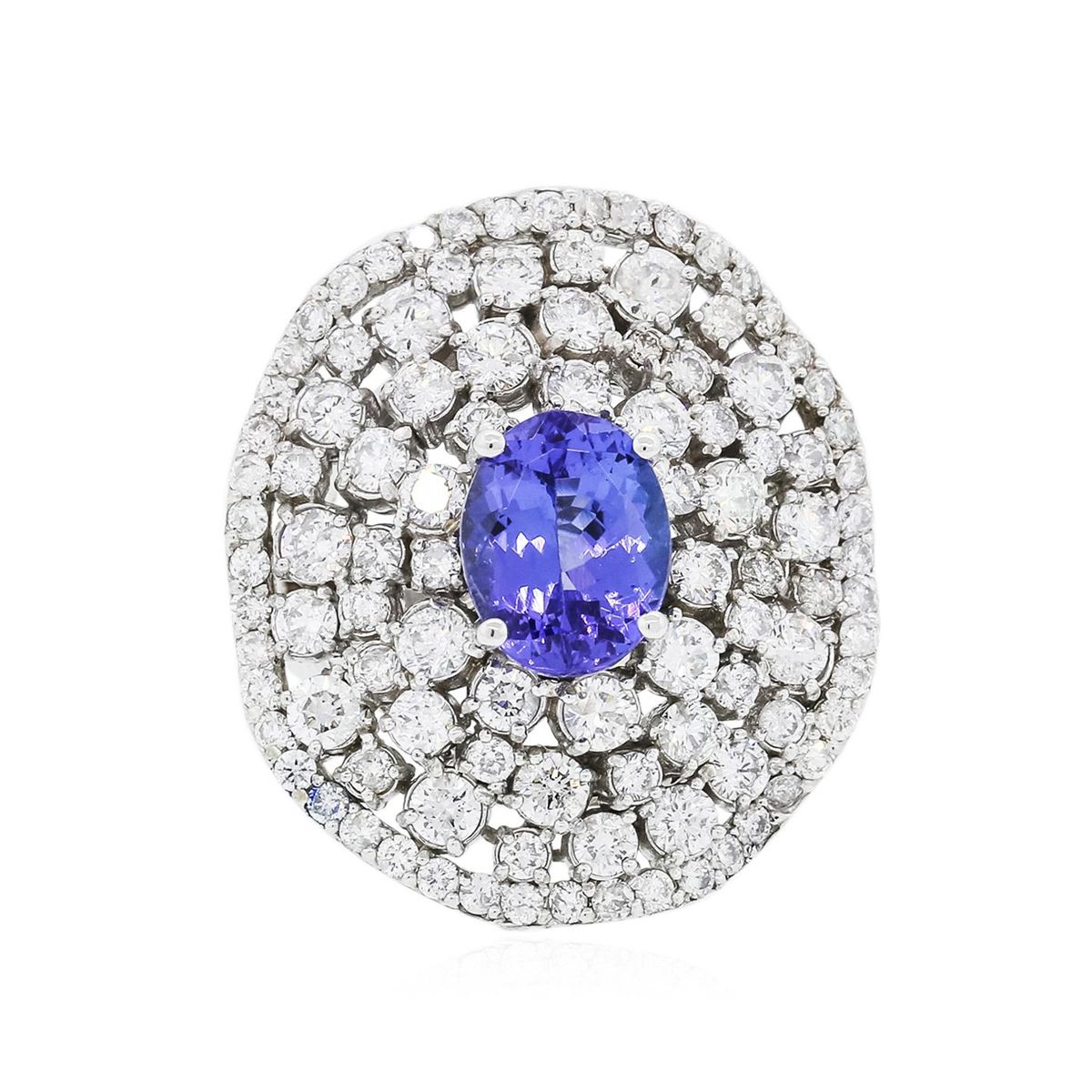 One electronically tested 14KT white gold ladies combination cast & assembled tanzanite and diamond ring with a split shank with a bright polish finish. Identified with markings of "K14". Condition is new. Containing: One prong set oval modified brilliant cut natural tanzanite, measuring 9.68 x 7.72 x 5.02mm, approximate weight of 2.55ct., clarity is eye clean, type I, medium, moderately strong, violet color, (GIA V 5/4), cut is good. Fourteen prong set round brilliant cut diamonds, measuring 2.50 - 1.80 x 1.29mm (depth est.) approximate total weight of 14 Stones = 0.51ct. Clarity: SI-1 to I-1. Color: I - J, Cut is Good. Forty-Eight prong set round brilliant cut diamonds, measuring 1.30 - 1.30 x 0.78mm (depth est.) approximate total weight of 48 Stones = 0.38ct. Clarity: SI-2 to I-1. Color: I - J, Cut is Good. Colored gemstones are presumed to have been subjected to commonly used enhancement processes. All diamonds and colored gemstones are graded in the mounting, unless otherwise stated. Total Weight of Colored Stones 2.55ct. Total Weight of Diamonds 0.89ct. Total Weight of Ring 15.60 grams. GGL Appraised at $11,885.00.
