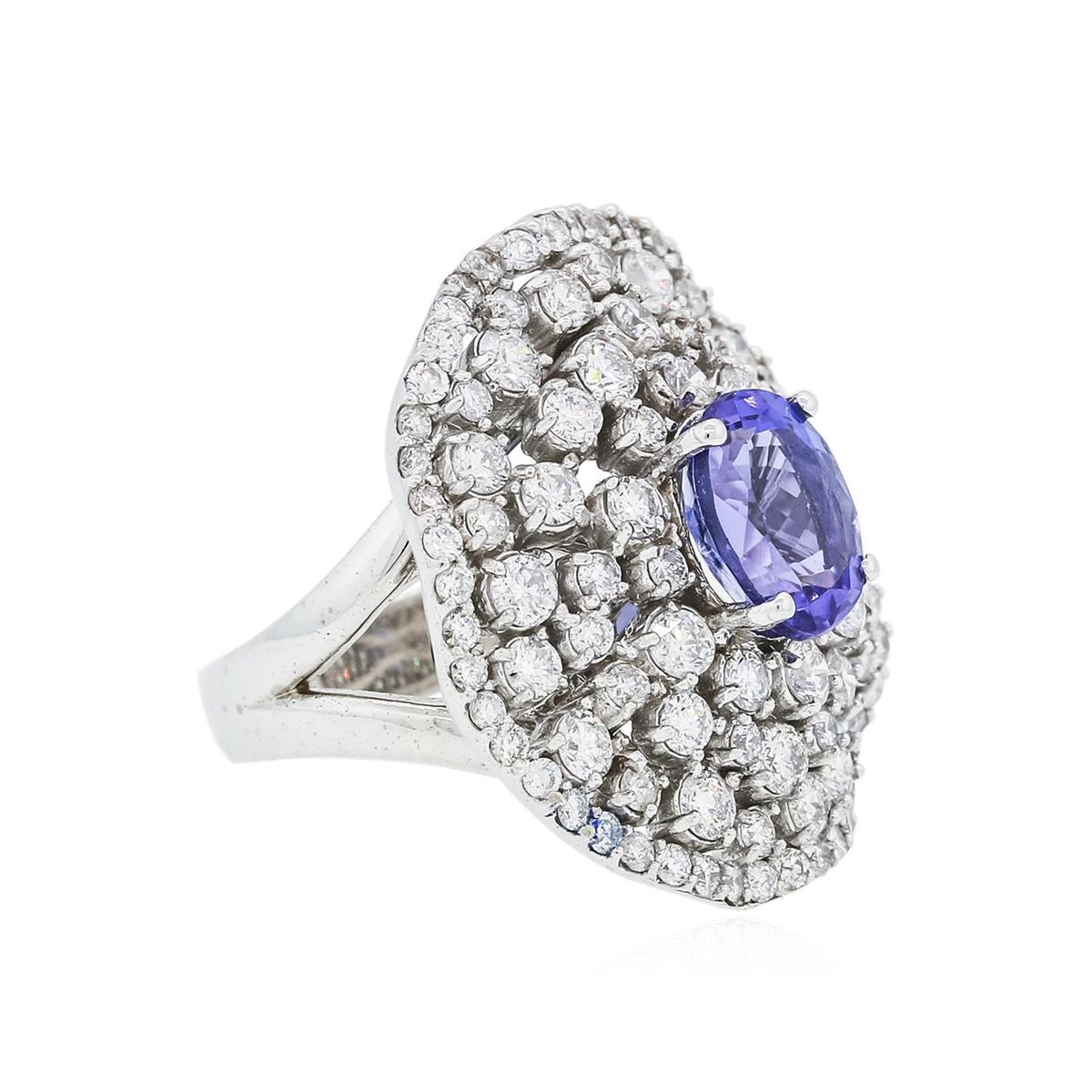 One electronically tested 14KT white gold ladies combination cast & assembled tanzanite and diamond ring with a split shank with a bright polish finish. Identified with markings of "K14". Condition is new. Containing: One prong set oval modified brilliant cut natural tanzanite, measuring 9.68 x 7.72 x 5.02mm, approximate weight of 2.55ct., clarity is eye clean, type I, medium, moderately strong, violet color, (GIA V 5/4), cut is good. Fourteen prong set round brilliant cut diamonds, measuring 2.50 - 1.80 x 1.29mm (depth est.) approximate total weight of 14 Stones = 0.51ct. Clarity: SI-1 to I-1. Color: I - J, Cut is Good. Forty-Eight prong set round brilliant cut diamonds, measuring 1.30 - 1.30 x 0.78mm (depth est.) approximate total weight of 48 Stones = 0.38ct. Clarity: SI-2 to I-1. Color: I - J, Cut is Good. Colored gemstones are presumed to have been subjected to commonly used enhancement processes. All diamonds and colored gemstones are graded in the mounting, unless otherwise stated. Total Weight of Colored Stones 2.55ct. Total Weight of Diamonds 0.89ct. Total Weight of Ring 15.60 grams. GGL Appraised at $11,885.00.