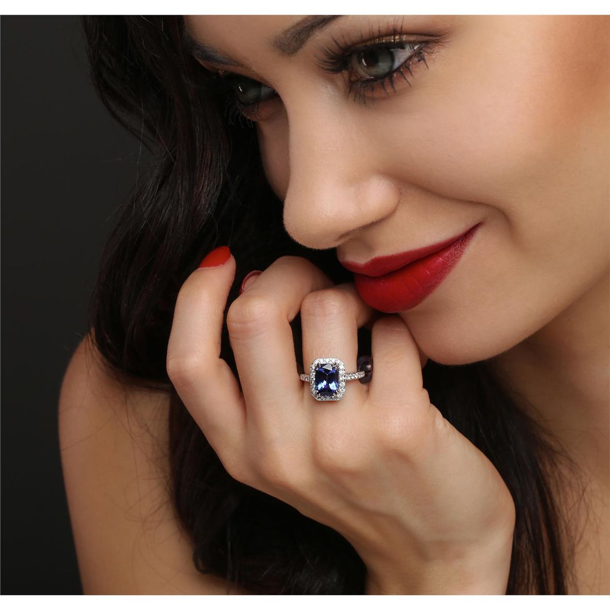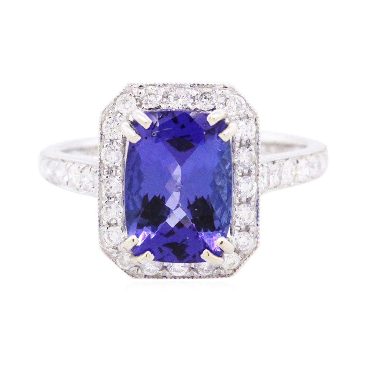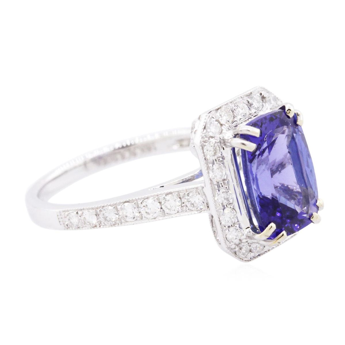 One electronically tested 14KT white gold ladies combination cast & assembled tanzanite and diamond ring with a flat shank with a bright polish finish. Identified with markings of "14K". Condition is new. Containing: One prong set rectangular cushion modified brilliant cut natural tanzanite, measuring 10.01 x 7.05 x 4.59mm, approximate weight of 2.55ct., clarity is eye clean, type I, medium, moderately strong, violet color, (GIA V 5/4), cut is good. Forty-Six prong set round brilliant cut diamonds, measuring 1.40 - 1.40 x 0.84mm (depth est.) approximate total weight of 46 Stones = 0.46ct. Clarity: I-1 to I-2. Color: I - J, Cut is Good. Colored gemstones are presumed to have been subjected to commonly used enhancement processes. All diamonds and colored gemstones are graded in the mounting, unless otherwise stated. Total Weight of Colored Stones 2.55ct. Total Weight of Diamonds 0.46ct. Total Weight of Ring 4.30 grams. GGL Appraised at $5,885.00.