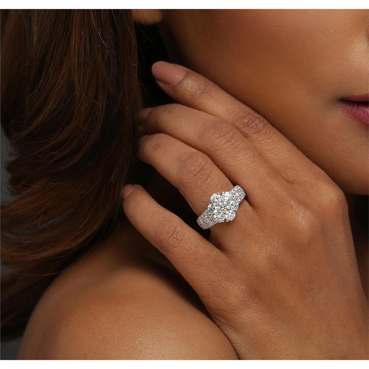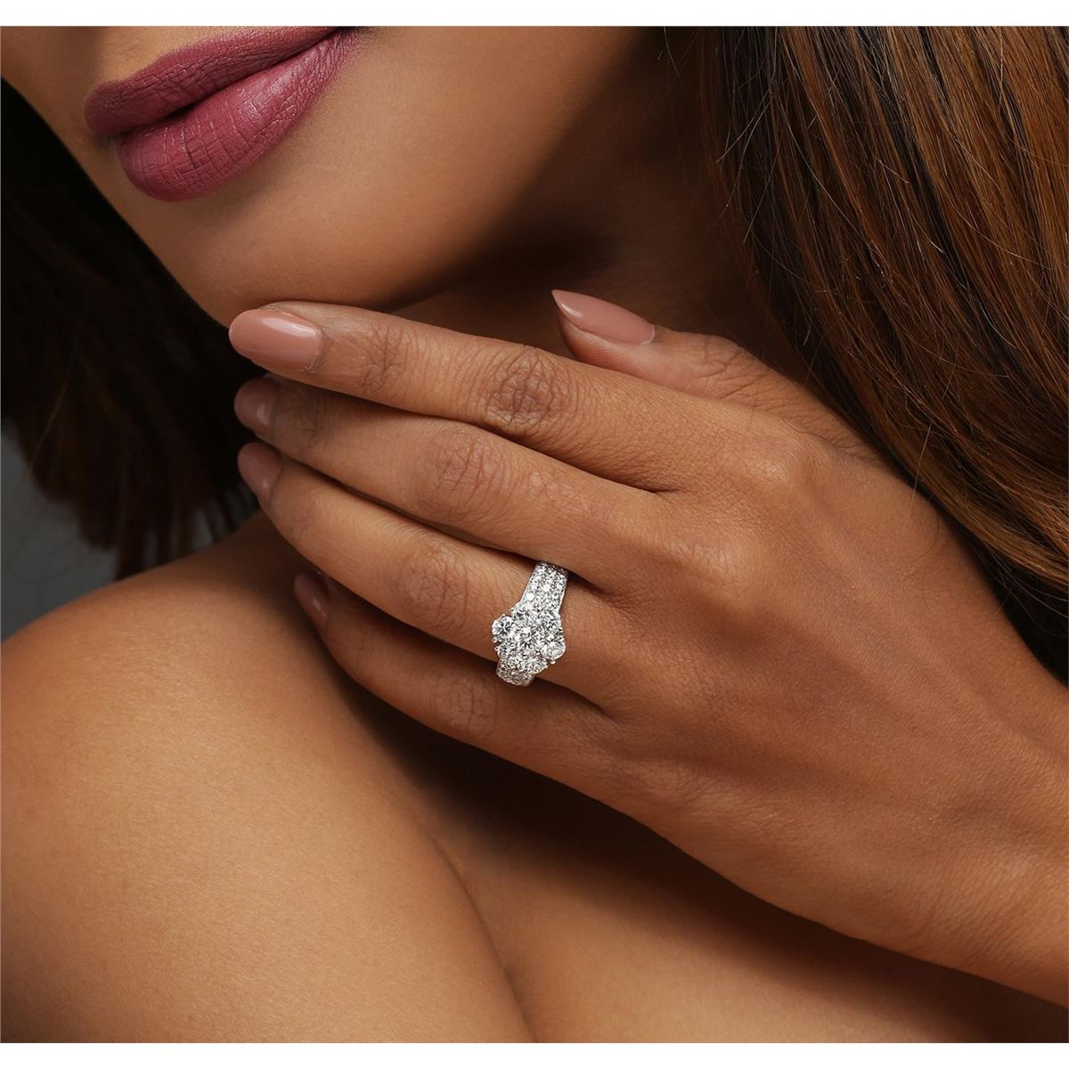 One electronically tested 14KT white gold ladies combination cast & assembled diamond ring with a flat shank with a bright polish finish. Identified with markings of "K14". Condition is new. Containing: Seven prong set round brilliant cut diamonds, measuring 4.20 - 4.00 x 2.46mm (depth est.) approximate total weight of 7 Stones = 1.77ct. Clarity: SI-2. Color: I - J, Cut is Good. Forty-Eight prong set round brilliant cut diamonds, measuring 1.80 - 1.50 x 0.99mm (depth est.) approximate total weight of 48 Stones = 0.79ct. Clarity: SI-1 to I-1. Color: I - J, Cut is Good. All diamonds are graded in the mounting, unless otherwise stated. Total Weight of Diamonds 2.55ct. Total Weight of Ring 5.50 grams. GGL Appraised at $10,410.00.