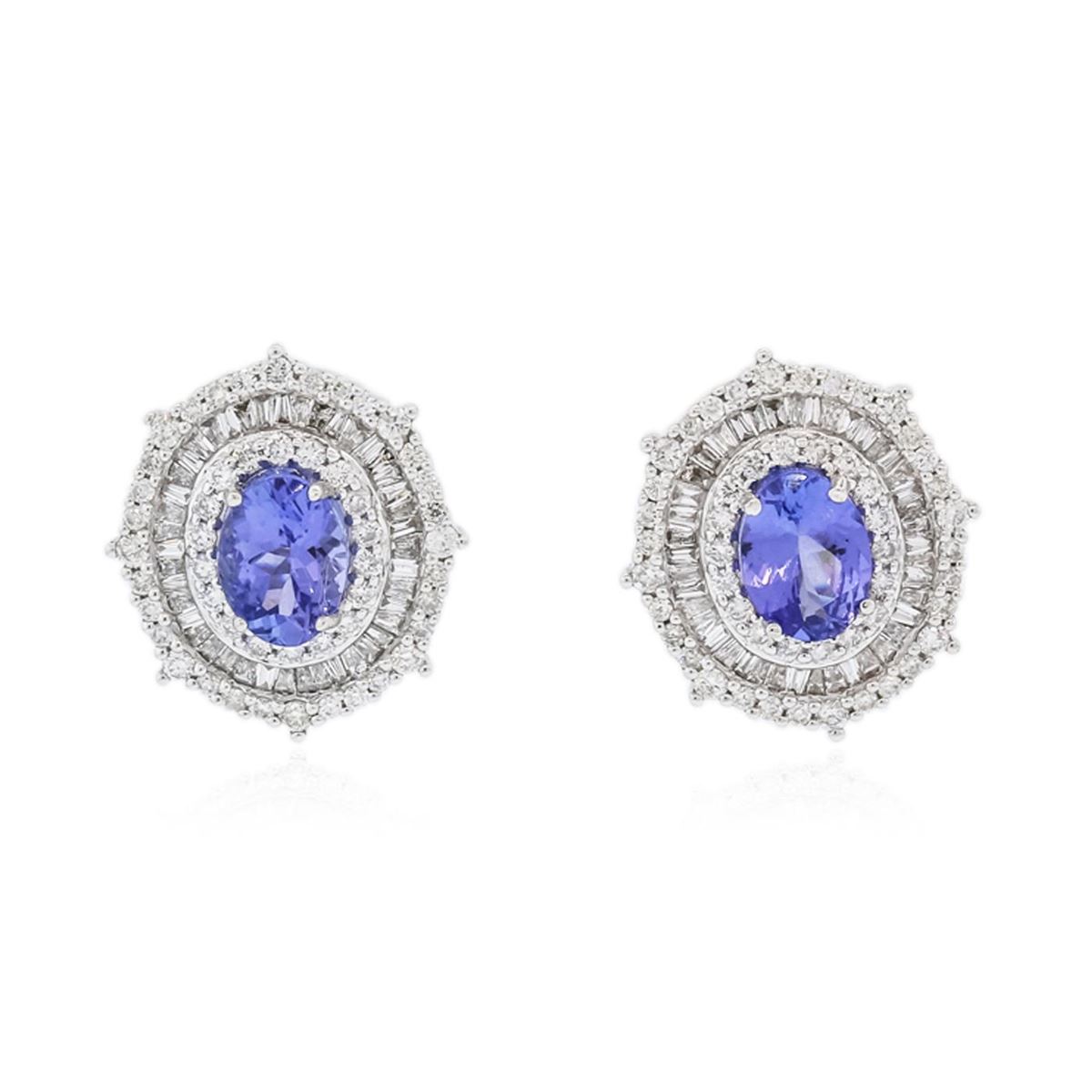 One pair electronically tested 14KT white gold ladies combination cast & assembled tanzanite and diamond earrings with friction posts with a bright polish finish. Identified with markings of "14K". Condition is new. Containing: Two prong set oval modified brilliant cut natural tanzanites, measuring 7.80 x 6.00 x 3.90mm, approximate total weight of 2.56ct., clarity is eye clean, type I, medium, moderately strong, violet color, (GIA V 5/4), cut is good. One Hundred Two prong set round brilliant cut diamonds, measuring 1.30 - 1.00 x 0.69mm (depth est.) approximate total weight of 102 Stones = 0.56ct. Clarity: SI-1 to SI-2. Color: I - J, Cut is Good. Eighty-Eight channel set baguette cut diamonds, measuring 1.50 x 1.30 x 1.11mm (depth est.) approximate total weight of 88 Stones = 1.74ct. Clarity: SI-1 to SI-2. Color: H - I, Cut is Good. Colored gemstones are presumed to have been subjected to commonly used enhancement processes. All diamonds and colored gemstones are graded in the mounting, unless otherwise stated. Total Weight of Colored Stones 2.56ct. Total Weight of Diamonds 2.30ct. Total Weight of Earrings 8.00 grams. GGL Appraised at $7,150.00.