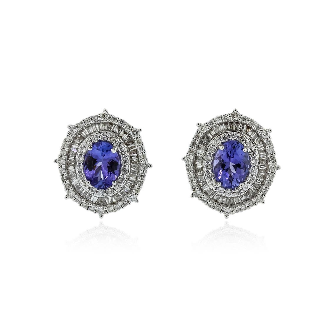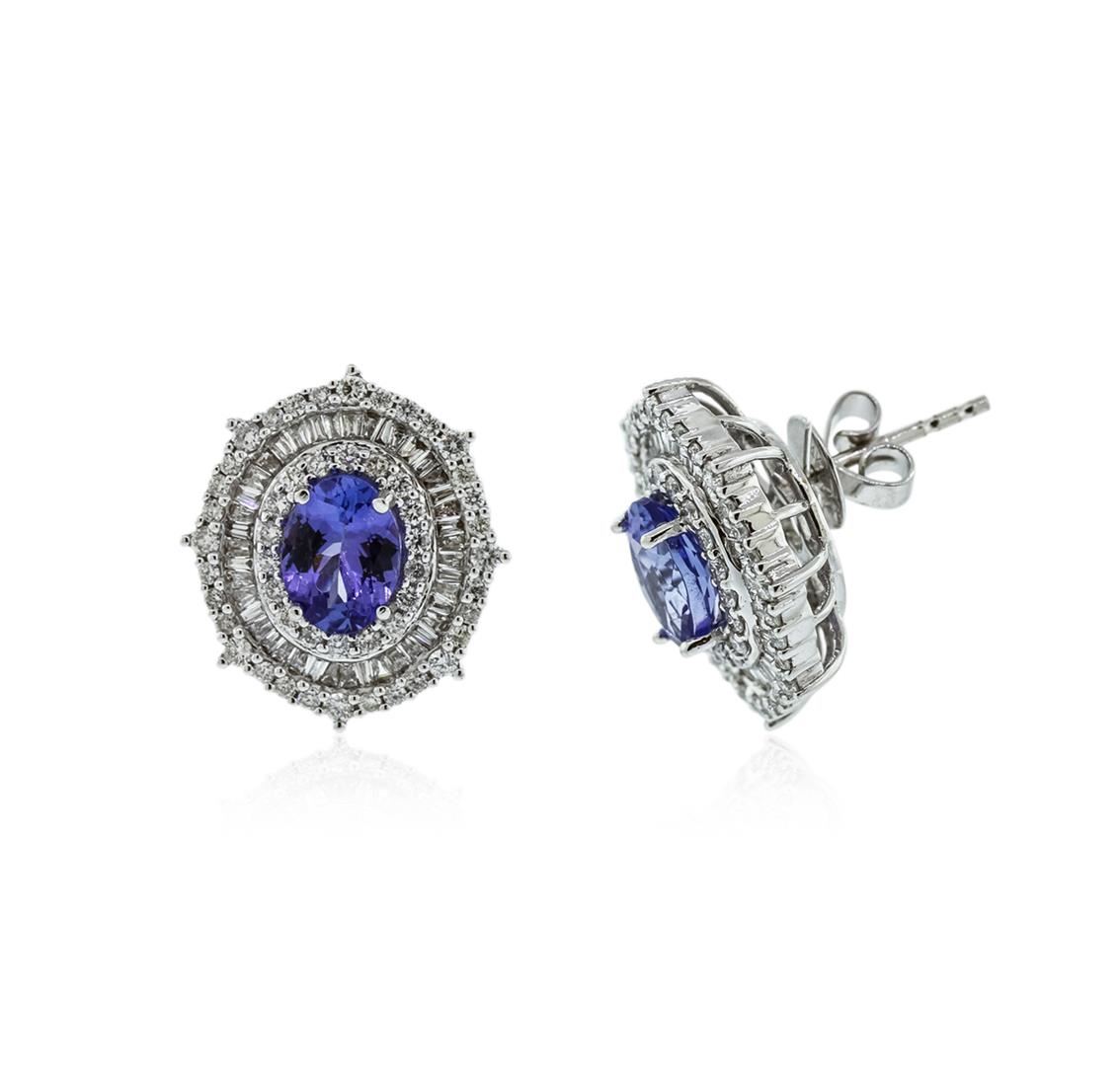 One pair electronically tested 14KT white gold ladies combination cast & assembled tanzanite and diamond earrings with friction posts with a bright polish finish. Identified with markings of "14K". Condition is new. Containing: Two prong set oval modified brilliant cut natural tanzanites, measuring 7.80 x 6.00 x 3.90mm, approximate total weight of 2.56ct., clarity is eye clean, type I, medium, moderately strong, violet color, (GIA V 5/4), cut is good. One Hundred Two prong set round brilliant cut diamonds, measuring 1.30 - 1.00 x 0.69mm (depth est.) approximate total weight of 102 Stones = 0.56ct. Clarity: SI-1 to SI-2. Color: I - J, Cut is Good. Eighty-Eight channel set baguette cut diamonds, measuring 1.50 x 1.30 x 1.11mm (depth est.) approximate total weight of 88 Stones = 1.74ct. Clarity: SI-1 to SI-2. Color: H - I, Cut is Good. Colored gemstones are presumed to have been subjected to commonly used enhancement processes. All diamonds and colored gemstones are graded in the mounting, unless otherwise stated. Total Weight of Colored Stones 2.56ct. Total Weight of Diamonds 2.30ct. Total Weight of Earrings 8.00 grams. GGL Appraised at $7,150.00.