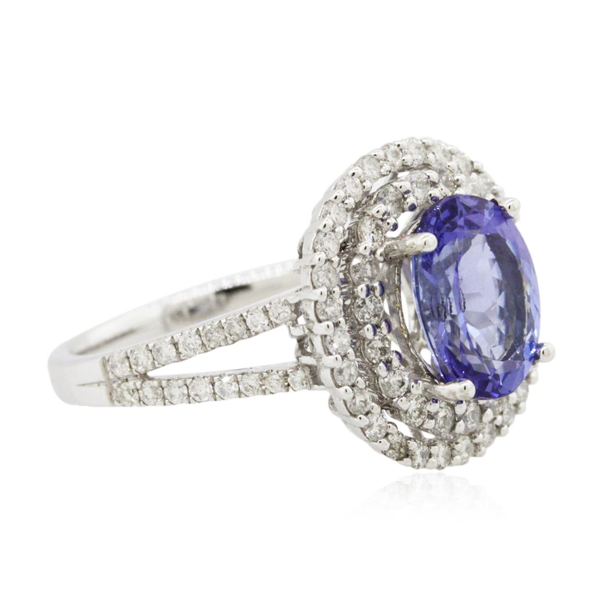 One electronically tested 14KT white gold Ladies combination cast & assembled ring with a bright polish finish. Condition is new. Identified with markings of "14K". Containing: One prong set oval modified brilliant cut natural tanzanite, measuring 9.80 x 7.80 x 4.94mm, approximate weight of 2.56ct., clarity is eye clean, type I, medium light, moderately strong, violet color, (GIA V 4/4), cut is good. Colored gemstones are presumed to have been subjected to commonly used color/clarity enhancement processes. Seventy-Eight prong set round brilliant cut diamonds, measuring 1.20 - 1.20 x 0.72mm (depth est.) approximate. Total Weight of 78 Stones = 0.49ct. . Clarity: I-1 to I-2. Color: I - J, Cut is Good. . Total Weight of Colored Stones 2.56ct. Total Weight of Diamonds 0.49ct. Total Weight of Ring 5.30 grams. GGL Appraised at $5,925.00.