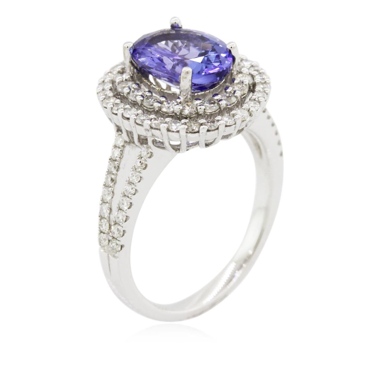 One electronically tested 14KT white gold Ladies combination cast & assembled ring with a bright polish finish. Condition is new. Identified with markings of "14K". Containing: One prong set oval modified brilliant cut natural tanzanite, measuring 9.80 x 7.80 x 4.94mm, approximate weight of 2.56ct., clarity is eye clean, type I, medium light, moderately strong, violet color, (GIA V 4/4), cut is good. Colored gemstones are presumed to have been subjected to commonly used color/clarity enhancement processes. Seventy-Eight prong set round brilliant cut diamonds, measuring 1.20 - 1.20 x 0.72mm (depth est.) approximate. Total Weight of 78 Stones = 0.49ct. . Clarity: I-1 to I-2. Color: I - J, Cut is Good. . Total Weight of Colored Stones 2.56ct. Total Weight of Diamonds 0.49ct. Total Weight of Ring 5.30 grams. GGL Appraised at $5,925.00.
