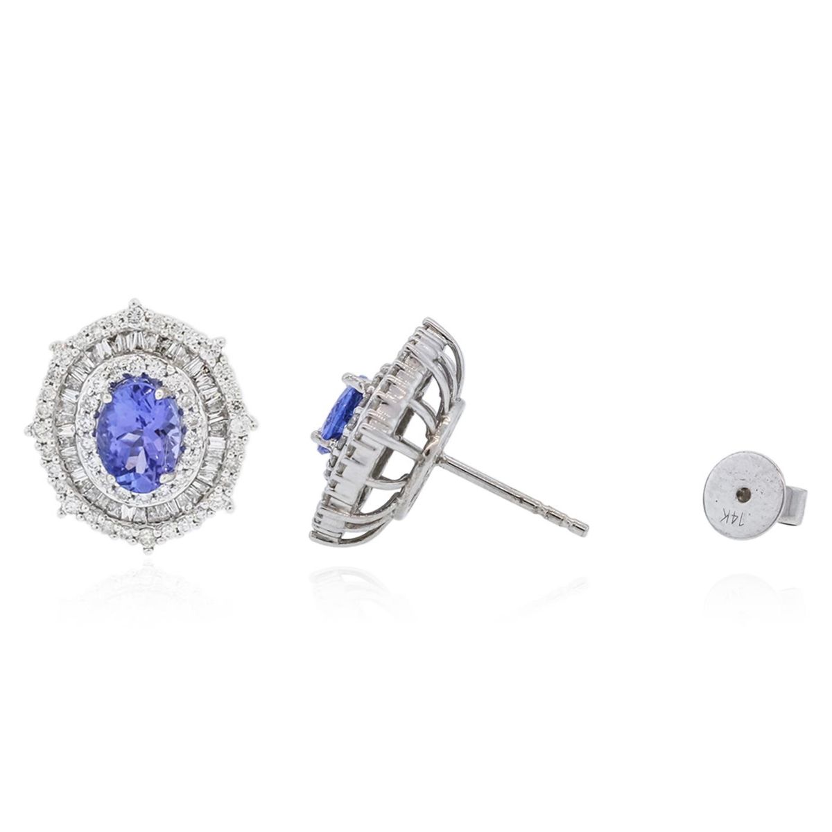 One pair electronically tested 14KT white gold ladies combination cast & assembled tanzanite and diamond earrings with friction posts with a bright polish finish. Identified with markings of "14K". Condition is new. Containing: Two prong set oval modified brilliant cut natural tanzanites, measuring 7.80 x 6.00 x 3.90mm, approximate total weight of 2.56ct., clarity is eye clean, type I, medium, moderately strong, violet color, (GIA V 5/4), cut is good. One Hundred Two prong set round brilliant cut diamonds, measuring 1.30 - 1.00 x 0.69mm (depth est.) approximate total weight of 102 Stones = 0.56ct. Clarity: SI-1 to SI-2. Color: I - J, Cut is Good. Eighty-Eight channel set baguette cut diamonds, measuring 1.50 x 1.30 x 1.11mm (depth est.) approximate total weight of 88 Stones = 1.74ct. Clarity: SI-1 to SI-2. Color: H - I, Cut is Good. Colored gemstones are presumed to have been subjected to commonly used enhancement processes. All diamonds and colored gemstones are graded in the mounting, unless otherwise stated. Total Weight of Colored Stones 2.56ct. Total Weight of Diamonds 2.30ct. Total Weight of Earrings 8.00 grams. GGL Appraised at $7,150.00.