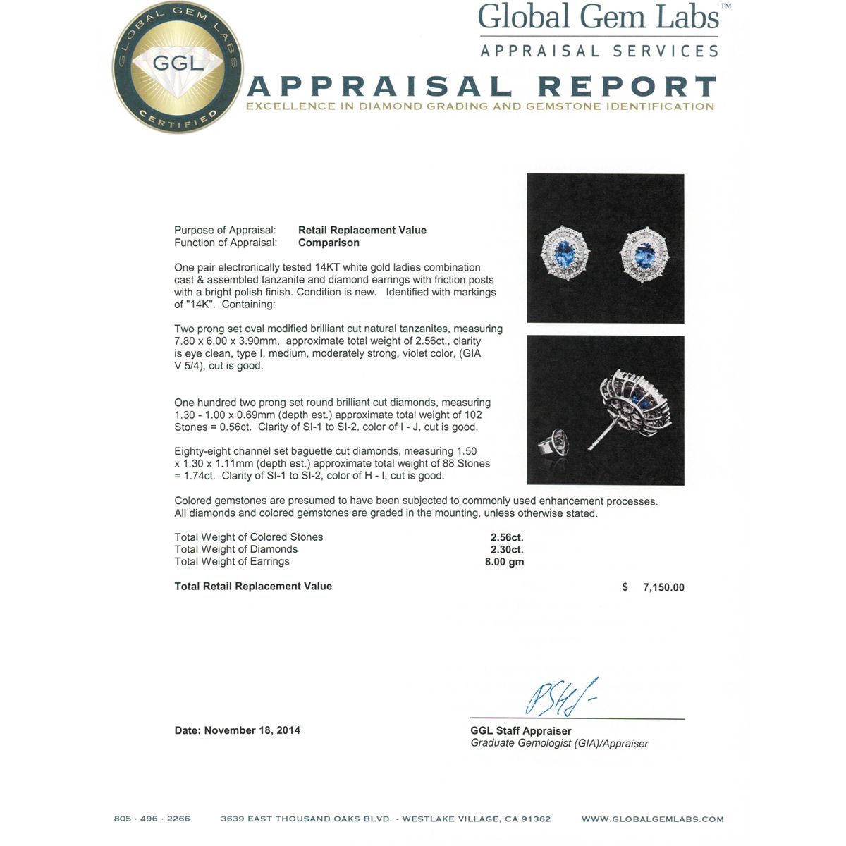 One pair electronically tested 14KT white gold ladies combination cast & assembled tanzanite and diamond earrings with friction posts with a bright polish finish. Identified with markings of "14K". Condition is new. Containing: Two prong set oval modified brilliant cut natural tanzanites, measuring 7.80 x 6.00 x 3.90mm, approximate total weight of 2.56ct., clarity is eye clean, type I, medium, moderately strong, violet color, (GIA V 5/4), cut is good. One Hundred Two prong set round brilliant cut diamonds, measuring 1.30 - 1.00 x 0.69mm (depth est.) approximate total weight of 102 Stones = 0.56ct. Clarity: SI-1 to SI-2. Color: I - J, Cut is Good. Eighty-Eight channel set baguette cut diamonds, measuring 1.50 x 1.30 x 1.11mm (depth est.) approximate total weight of 88 Stones = 1.74ct. Clarity: SI-1 to SI-2. Color: H - I, Cut is Good. Colored gemstones are presumed to have been subjected to commonly used enhancement processes. All diamonds and colored gemstones are graded in the mounting, unless otherwise stated. Total Weight of Colored Stones 2.56ct. Total Weight of Diamonds 2.30ct. Total Weight of Earrings 8.00 grams. GGL Appraised at $7,150.00.