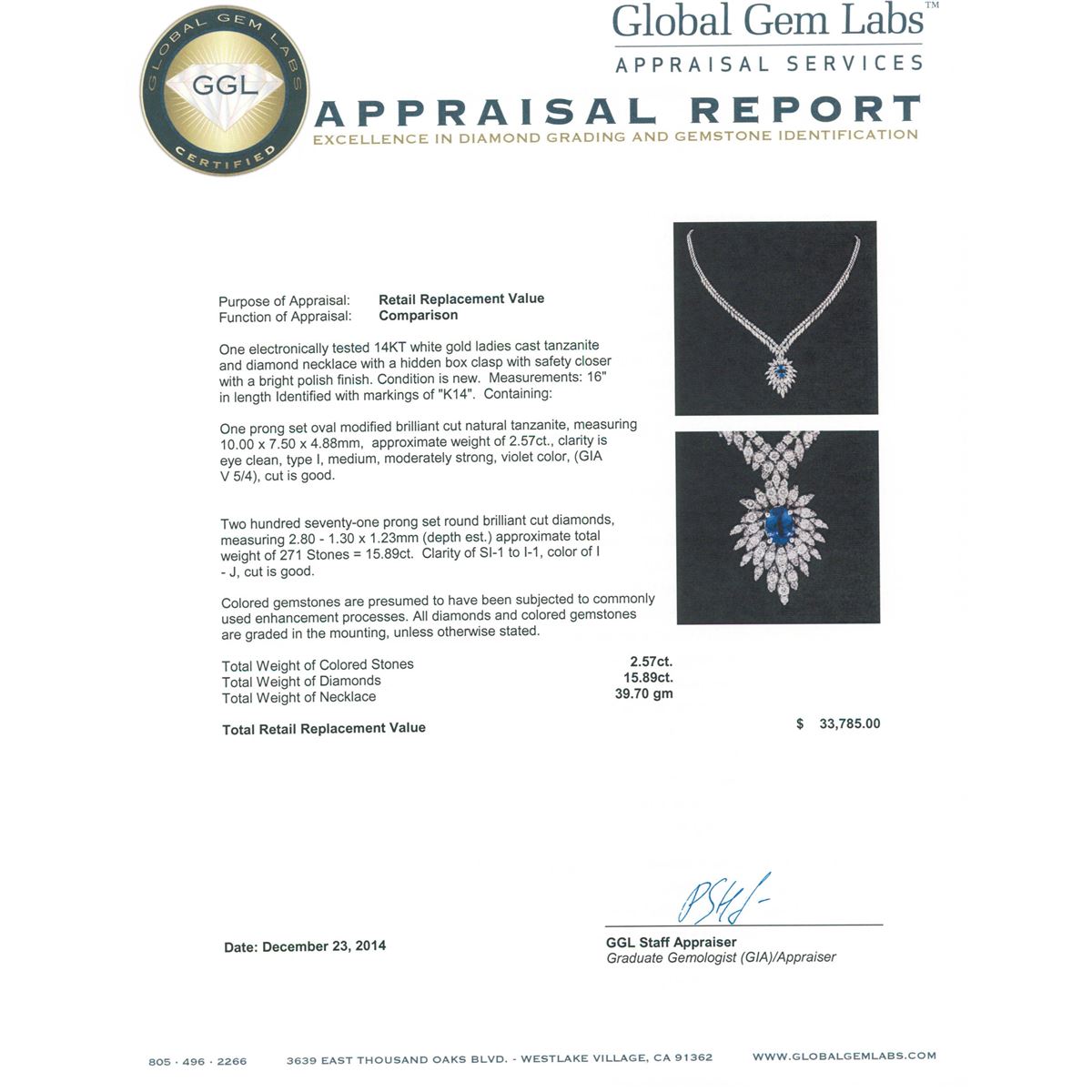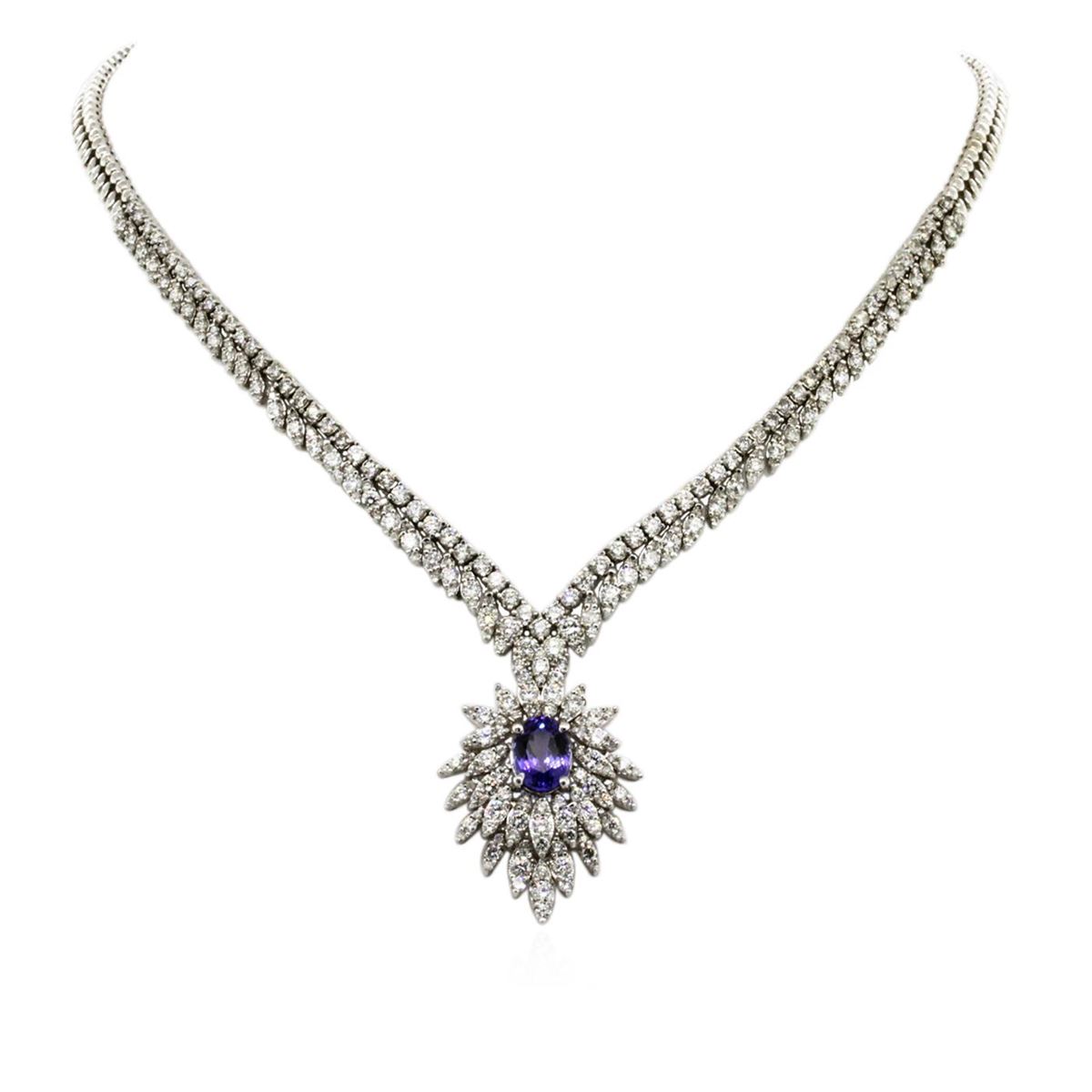 One electronically tested 14KT white gold ladies cast tanzanite and diamond necklace with a hidden box clasp with safety closer with a bright polish finish. Measurements: 16" in length Identified with markings of "K14". Condition is new. Containing: One prong set oval modified brilliant cut natural tanzanite, measuring 10.00 x 7.50 x 4.88mm, approximate weight of 2.57ct., clarity is eye clean, type I, medium, moderately strong, violet color, (GIA V 5/4), cut is good. Two Hundred Seventy-One prong set round brilliant cut diamonds, measuring 2.80 - 1.30 x 1.23mm (depth est.) approximate total weight of 271 Stones = 15.89ct. Clarity: SI-1 to I-1. Color: I - J, Cut is Good. Colored gemstones are presumed to have been subjected to commonly used enhancement processes. All diamonds and colored gemstones are graded in the mounting, unless otherwise stated. Total Weight of Colored Stones 2.57ct. Total Weight of Diamonds 15.89ct. Total Weight of Necklace 39.70 grams. GGL Appraised at $33,785.00.