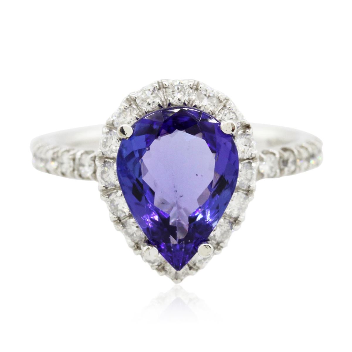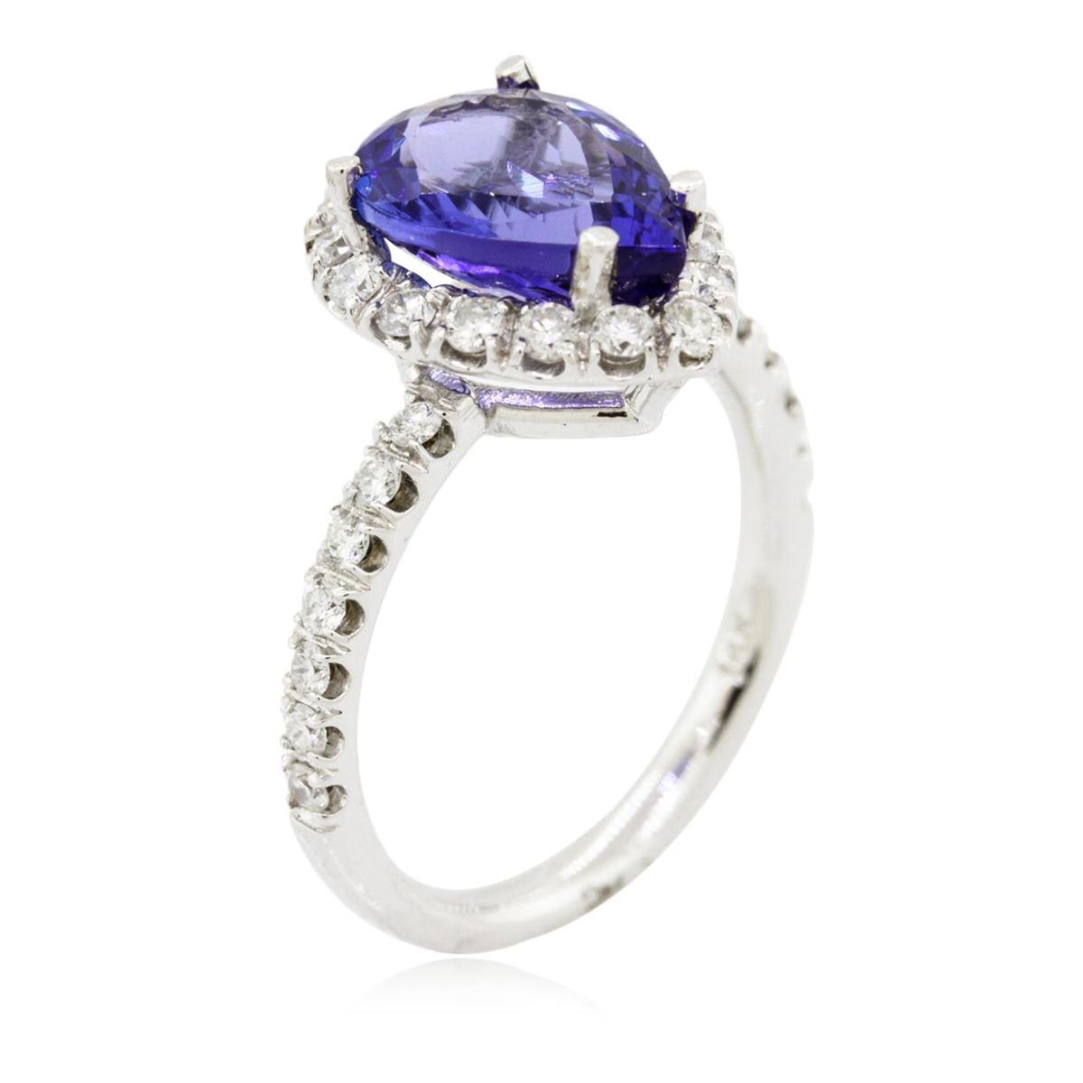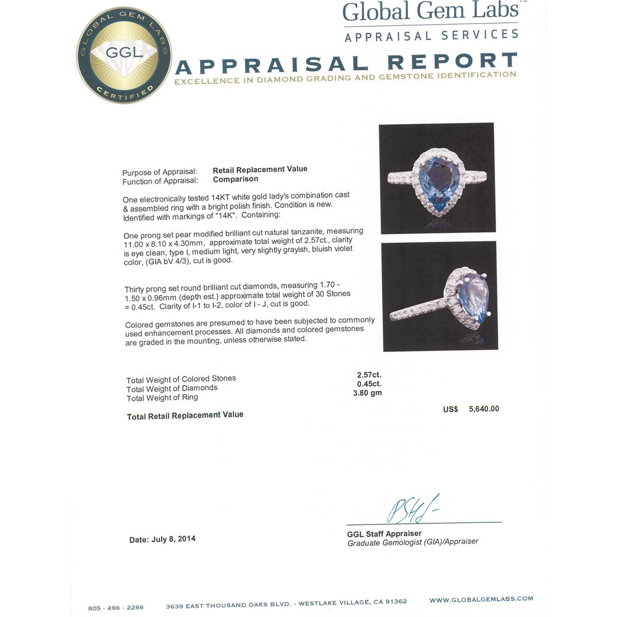 One electronically tested 14KT white gold Ladies combination cast & assembled ring with a bright polish finish. Condition is new. Identified with markings of "14K". Containing: One prong set pear modified brilliant cut natural tanzanite, measuring 11.00 x 8.10 x 4.30mm, approximate. Total Weight of 2.57ct., clarity is eye clean, type I, medium light, very slightly grayish, bluish violet color, (GIA bV 4/3), cut is good. Thirty prong set round brilliant cut diamonds, measuring 1.70 - 1.50 x 0.96mm (depth est.) approximate. Total Weight of 30 Stones = 0.45ct. Clarity: I-1 to I-2. Color: I - J, Cut is Good. Colored gemstones are presumed to have been subjected to commonly used enhancement processes. All diamonds and colored gemstones are graded in the mounting, unless otherwise stated. Total Weight of Colored Stones 2.57ct. Total Weight of Diamonds 0.45ct. Total Weight of Ring 3.80 grams. GGL Appraised at $5,640.00.