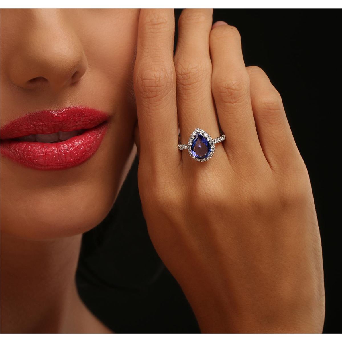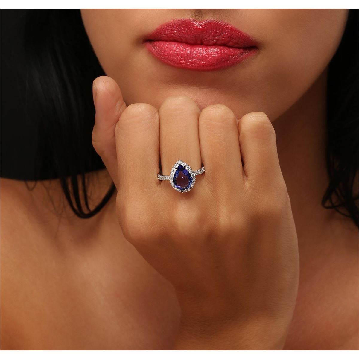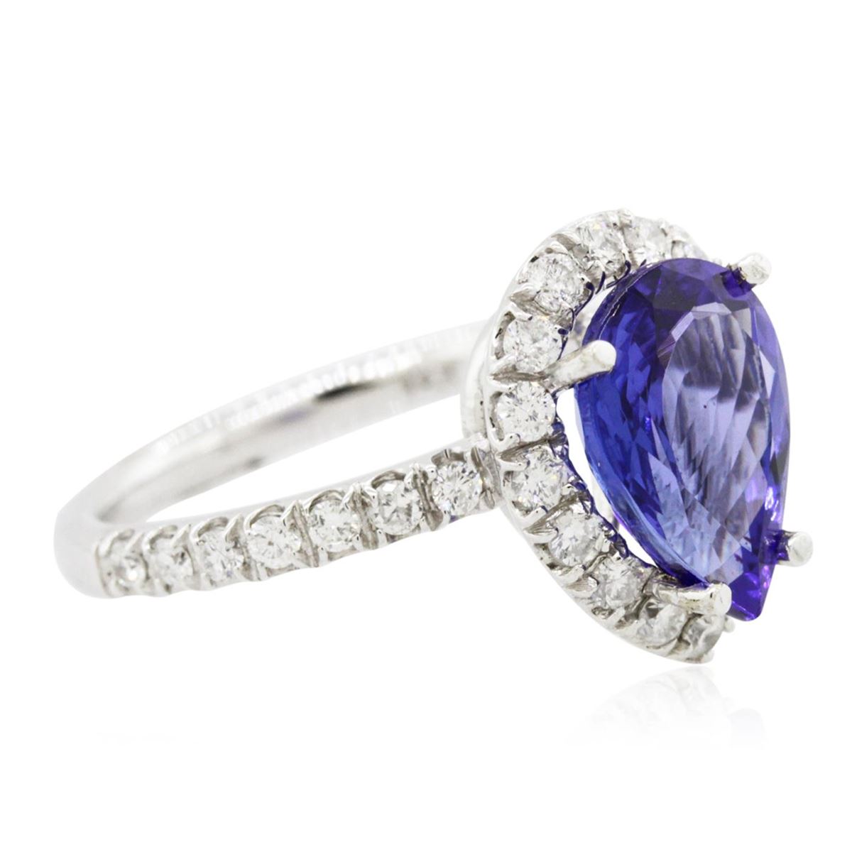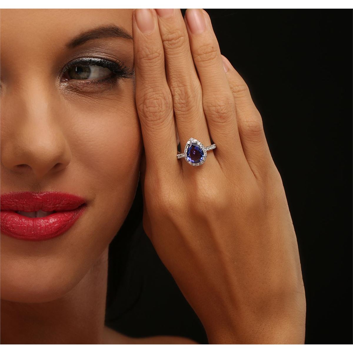 One electronically tested 14KT white gold Ladies combination cast & assembled ring with a bright polish finish. Condition is new. Identified with markings of "14K". Containing: One prong set pear modified brilliant cut natural tanzanite, measuring 11.00 x 8.10 x 4.30mm, approximate. Total Weight of 2.57ct., clarity is eye clean, type I, medium light, very slightly grayish, bluish violet color, (GIA bV 4/3), cut is good. Thirty prong set round brilliant cut diamonds, measuring 1.70 - 1.50 x 0.96mm (depth est.) approximate. Total Weight of 30 Stones = 0.45ct. Clarity: I-1 to I-2. Color: I - J, Cut is Good. Colored gemstones are presumed to have been subjected to commonly used enhancement processes. All diamonds and colored gemstones are graded in the mounting, unless otherwise stated. Total Weight of Colored Stones 2.57ct. Total Weight of Diamonds 0.45ct. Total Weight of Ring 3.80 grams. GGL Appraised at $5,640.00.