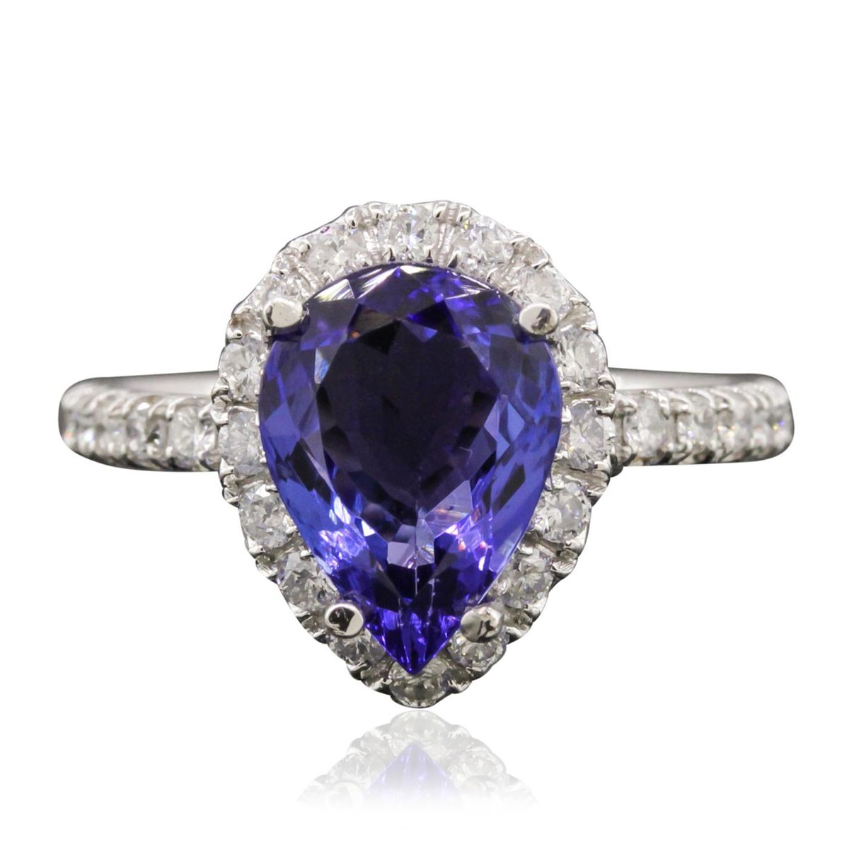 One electronically tested 14KT white gold Ladies combination cast & assembled ring with a bright polish finish. Condition is new. Identified with markings of "14K". Containing: One prong set pear modified brilliant cut natural tanzanite, measuring 11.00 x 8.10 x 4.30mm, approximate. Total Weight of 2.57ct., clarity is eye clean, type I, medium light, very slightly grayish, bluish violet color, (GIA bV 4/3), cut is good. Thirty prong set round brilliant cut diamonds, measuring 1.70 - 1.50 x 0.96mm (depth est.) approximate. Total Weight of 30 Stones = 0.45ct. Clarity: I-1 to I-2. Color: I - J, Cut is Good. Colored gemstones are presumed to have been subjected to commonly used enhancement processes. All diamonds and colored gemstones are graded in the mounting, unless otherwise stated. Total Weight of Colored Stones 2.57ct. Total Weight of Diamonds 0.45ct. Total Weight of Ring 3.80 grams. GGL Appraised at $5,640.00.